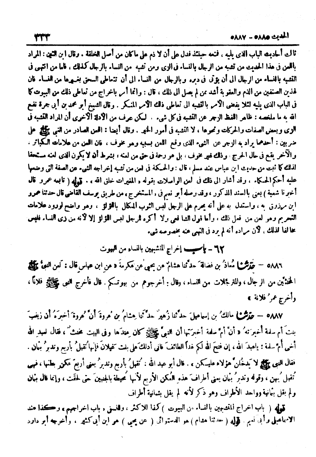 ثَالِثِ أَحَادِيثِ الْبَابِ الَّذِي يَلِيهِ فَمَنَعَهُ حِينَئِذٍ فَدَلَّ عَلَى أَنْ لَا ذَمَّ عَلَى مَا كَانَ من أصل الْخلقَة وَقَالَ بن التِّينِ الْمُرَادُ بِاللَّعْنِ فِي هَذَا الْحَدِيثِ مَنْ تَشَبَّهَ مِنَ الرِّجَالِ بِالنِّسَاءِ فِي الزِّيِّ وَمَنْ تَشَبَّهَ مِنَ النِّسَاءِ بِالرِّجَالِ كَذَلِكَ فَأَمَّا مَنِ انْتَهَى فِي التَّشَبُّهِ بِالنِّسَاءِ مِنَ الرِّجَالِ إِلَى أَنْ يُؤْتَى فِي دُبُرِهِ وَبِالرِّجَالِ مِنَ النِّسَاءِ إِلَى أَنْ تَتَعَاطَى السُّحْقَ بِغَيْرِهَا مِنَ النِّسَاءِ فَإِنَّ لِهَذَيْنِ الصِّنْفَيْنِ مِنَ الذَّمِّ وَالْعُقُوبَةِ أَشَدُّ مِمَّنْ لَمْ يَصِلْ إِلَى ذَلِكَ قَالَ وَإِنَّمَا أَمَرَ بِإِخْرَاجِ مَنْ تَعَاطَى ذَلِكَ مِنَ الْبُيُوتِ كَمَا فِي الْبَابِ الَّذِي يَلِيهِ لِئَلَّا يُفْضِيَ الْأَمْرُ بِالتَّشَبُّهِ إِلَى تَعَاطِي ذَلِكَ الْأَمْرِ الْمُنْكَرِ وَقَالَ الشَّيْخُ أَبُو مُحَمَّدِ بْنِ أَبِي جَمْرَةَ نَفَعَ اللَّهُ بِهِ مَا مُلَخَّصُهُ ظَاهِرُ اللَّفْظِ الزَّجْرُ عَنِ التَّشَبُّهِ فِي كُلِّ شَيْءٍ لَكِنْ عُرِفَ مِنَ الْأَدِلَّةِ الْأُخْرَى أَنَّ الْمُرَادَ التَّشَبُّهُ فِي الزِّيِّ وَبَعْضِ الصِّفَاتِ وَالْحَرَكَاتِ وَنَحْوِهَا لَا التَّشَبُّهُ فِي أُمُورِ الْخَيْرِ وَقَالَ أَيْضًا اللَّعْنُ الصَّادِرُ مِنَ النَّبِيِّ صَلَّى اللَّهُ عَلَيْهِ وَسَلَّمَ عَلَى ضَرْبَيْنِ أَحَدُهُمَا يُرَادُ بِهِ الزَّجْرُ عَنِ الشَّيْءِ الَّذِي وَقَعَ اللَّعْنُ بِسَبَبِهِ وَهُوَ مَخُوفٌ فَإِنَّ اللَّعْنَ مِنْ عَلَامَاتِ الْكَبَائِرِ وَالْآخَرُ يَقَعُ فِي حَالِ الْحَرَجِ وَذَلِكَ غَيْرُ مَخُوفٍ بَلْ هُوَ رَحْمَةٌ فِي حَقِّ مَنْ لَعَنَهُ بِشَرْطِ أَنْ لَا يَكُونَ الَّذِي لَعَنَهُ مُسْتَحِقًّا لِذَلِكَ كَمَا ثَبت من حَدِيث بن عَبَّاسٍ عِنْدَ مُسْلِمٍ قَالَ وَالْحِكْمَةُ فِي لَعْنِ مَنْ تَشَبَّهَ إِخْرَاجُهُ الشَّيْءَ عَنِ الصِّفَةِ الَّتِي وَضَعَهَا عَلَيْهِ أَحْكَمُ الْحُكَمَاءِ وَقَدْ أَشَارَ إِلَى ذَلِكَ فِي لَعْنِ الْوَاصِلَاتِ بِقَوْلِهِ الْمُغَيِّرَاتِ خَلْقَ اللَّهِ قَوْلُهُ تَابَعَهُ عَمْرٌو قَالَ أَخْبَرَنَا شُعْبَةُ يَعْنِي بِالسَّنَدِ الْمَذْكُورِ وَقَدْ وَصَلَهُ أَبُو نُعَيْمٍ فِي الْمُسْتَخْرَجِ مِنْ طَرِيقِ يُوسُفَ الْقَاضِي قَالَ حَدَّثَنَا عَمْرُو بْنُ مَرْزُوقٍ بِهِ وَاسْتُدِلَّ بِهِ عَلَى أَنَّهُ يَحْرُمُ عَلَى الرَّجُلِ لُبْسُ الثَّوْبِ الْمُكَلَّلِ بِاللُّؤْلُؤِ وَهُوَ وَاضِحٌ لِوُرُودِ عَلَامَاتِ التَّحْرِيمِ وَهُوَ لَعْنُ مَنْ فَعَلَ ذَلِكَ وَأَمَّا قَوْلُ الشَّافِعِيِّ وَلَا أَكْرَهُ لِلرَّجُلِ لُبْسَ اللُّؤْلُؤِ إِلَّا لِأَنَّهُ مِنْ زِيِّ النِّسَاءِ فَلَيْسَ مُخَالِفًا لِذَلِكَ لِأَنَّ مُرَادَهُ أَنَّهُ لَمْ يَرِدْ فِي النَّهْيِ عَنهُ بِخُصُوصِهِ شَيْء