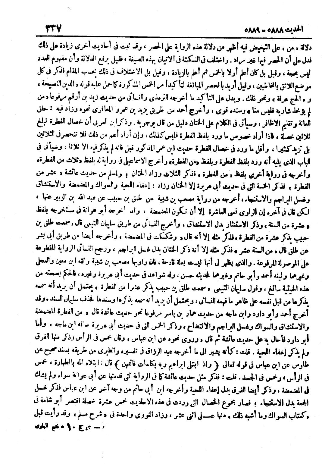دَلَالَةُ مِنْ عَلَى التَّبْعِيضِ فِيهِ أَظْهَرُ مِنْ دَلَالَةِ هَذِهِ الرِّوَايَةِ عَلَى الْحَصْرِ وَقَدْ ثَبَتَ فِي أَحَادِيثَ أُخْرَى زِيَادَةٌ عَلَى ذَلِكَ فَدَلَّ على أَن الْحصْر فِيهَا غير مُرَاد وَاخْتُلِفَ فِي النُّكْتَةِ فِي الْإِتْيَانِ بِهَذِهِ الصِّيغَةِ فَقِيلَ بِرَفْعِ الدَّلَالَةِ وَأَنَّ مَفْهُومَ الْعَدَدِ لَيْسَ بِحُجَّةٍ وَقِيلَ بَلْ كَانَ أَعْلَمَ أَوَّلًا بِالْخَمْسِ ثُمَّ أَعْلَمَ بِالزِّيَادَةِ وَقِيلَ بَلِ الِاخْتِلَافُ فِي ذَلِكَ بِحَسَبِ الْمَقَامِ فَذَكَرَ فِي كُلِّ مَوْضِعٍ اللَّائِقَ بِالْمُخَاطَبِينَ وَقِيلَ أُرِيدَ بِالْحَصْرِ الْمُبَالَغَةُ لِتَأْكِيدِ أَمْرِ الْخَمْسِ الْمَذْكُورَةِ كَمَا حُمِلَ عَلَيْهِ قَوْلُهُ الدّين النَّصِيحَة وَالْحج عَرَفَةُ وَنَحْوُ ذَلِكَ وَيَدُلُّ عَلَى التَّأْكِيدِ مَا أَخْرَجَهُ التِّرْمِذِيُّ وَالنَّسَائِيُّ مِنْ حَدِيثِ زَيْدِ بْنِ أَرْقَمَ مَرْفُوعًا مَنْ لَمْ يُؤْخَذْ شَارِبُهُ فَلَيْسَ مِنَّا وَسَنَدُهُ قَوِيٌّ وَأَخْرَجَ أَحْمَدُ مِنْ طَرِيقِ يَزِيدَ بْنِ عَمْرٍو الْمَعَافِرِيِّ نَحْوَهُ وَزَادَ فِيهِ حَلْقَ الْعَانَةِ وَتَقْلِيمَ الْأَظَافِرِ وَسَيَأْتِي فِي الْكَلَامِ عَلَى الْخِتَانِ دَلِيلُ مَنْ قَالَ بِوُجُوبِهِ وَذَكَرَ بن الْعَرَبِيِّ أَنَّ خِصَالَ الْفِطْرَةِ تَبْلُغُ ثَلَاثِينَ خَصْلَةً فَإِذَا أَرَادَ خُصُوصَ مَا وَرَدَ بِلَفْظِ الْفِطْرَةِ فَلَيْسَ كَذَلِكَ وَإِنْ أَرَادَ أَعَمَّ مِنْ ذَلِكَ فَلَا تَنْحَصِرُ فِي الثَّلَاثِينَ بَلْ تَزِيدُ كَثِيرًا وَأَقَلُّ مَا وَرَدَ فِي خِصَالِ الْفِطْرَةِ حَدِيثُ بن عُمَرَ الْمَذْكُورُ قَبْلُ فَإِنَّهُ لَمْ يَذْكُرْ فِيهِ إِلَّا ثَلَاثًا وَسَيَأْتِي فِي الْبَابِ الَّذِي يَلِيهِ أَنَّهُ وَرَدَ بِلَفْظِ الْفِطْرَةِ وَبِلَفْظِ مِنَ الْفِطْرَةِ وَأَخْرَجَ الْإِسْمَاعِيلِيُّ فِي رِوَايَةٍ لَهُ بِلَفْظِ ثَلَاثٌ مِنَ الْفِطْرَةِ وَأَخْرَجَهُ فِي رِوَايَةٍ أُخْرَى بِلَفْظِ مِنَ الْفِطْرَةِ فَذَكَرَ الثَّلَاثَ وَزَادَ الْخِتَانَ وَلِمُسْلِمٍ مِنْ حَدِيثِ عَائِشَةَ عَشْرٌ مِنَ الْفِطْرَةِ فَذَكَرَ الْخَمْسَةَ الَّتِي فِي حَدِيثِ أَبِي هُرَيْرَةَ إِلَّا الْخِتَانَ وَزَادَ إِعْفَاءَ اللِّحْيَةِ وَالسِّوَاكَ وَالْمَضْمَضَةَ وَالِاسْتِنْشَاقَ وَغَسْلَ الْبَرَاجِمِ وَالِاسْتِنْجَاءَ أَخْرَجَهُ مِنْ رِوَايَةِ مُصْعَبِ بْنِ شَيْبَةَ عَنْ طَلْقِ بْنِ حَبِيبٍ عَنْ عَبْدِ اللَّهِ بْنِ الزُّبَيْرِ عَنْهَا لَكِنْ قَالَ فِي آخِرِهِ إِنَّ الرَّاوِيَ نَسِيَ الْعَاشِرَةَ إِلَّا أَنْ تَكُونُ الْمَضْمَضَةَ وَقَدْ أَخْرَجَهُ أَبُو عَوَانَةَ فِي مُسْتَخْرَجِهِ بِلَفْظِ عَشْرَةٌ مِنَ السُّنَّةِ وَذَكَرَ الِاسْتِنْثَارَ بَدَلَ الِاسْتِنْشَاقِ وَأَخْرَجَ النَّسَائِيُّ مِنْ طَرِيقِ سُلَيْمَانَ التَّيْمِيِّ قَالَ سَمِعْتُ طَلْقَ بْنَ حَبِيبٍ يَذْكُرُ عَشْرَةً مِنَ الْفِطْرَةِ فَذَكَرَ مِثْلَهُ إِلَّا أَنَّهُ قَالَ وَشَكَكْتُ فِي الْمَضْمَضَةِ وَأَخْرَجَهُ أَيْضًا مِنْ طَرِيقِ أَبِي بِشْرٍ عَنْ طَلْقٍ قَالَ مِنَ السُّنَّةِ عَشْرٌ فَذَكَرَ مِثْلَهُ إِلَّا أَنَّهُ ذَكَرَ الْخِتَانَ بَدَلَ غَسْلِ الْبَرَاجِمِ وَرَجَّحَ النَّسَائِيُّ الرِّوَايَةَ الْمَقْطُوعَةَ عَلَى الْمَوْصُولَةِ الْمَرْفُوعَةِ وَالَّذِي يَظْهَرُ لي أَنَّهَا لَيست بعلة فادحة فَإِن راويها مُصعب بن شيبَة وثقة بن مَعِينٍ وَالْعِجْلِيُّ وَغَيْرُهُمَا وَلَيَّنَهُ أَحْمَدُ وَأَبُو حَاتِمٍ وَغَيْرُهُمَا فَحَدِيثُهُ حَسَنٌ وَلَهُ شَوَاهِدُ فِي حَدِيثِ أَبِي هُرَيْرَةَ وَغَيْرِهِ فَالْحُكْمُ بِصِحَّتِهِ مِنْ هَذِهِ الْحَيْثِيَّةِ سَائِغٌ وَقَوْلُ سُلَيْمَانَ التَّيْمِيِّ سَمِعْتُ طَلْقَ بْنَ
