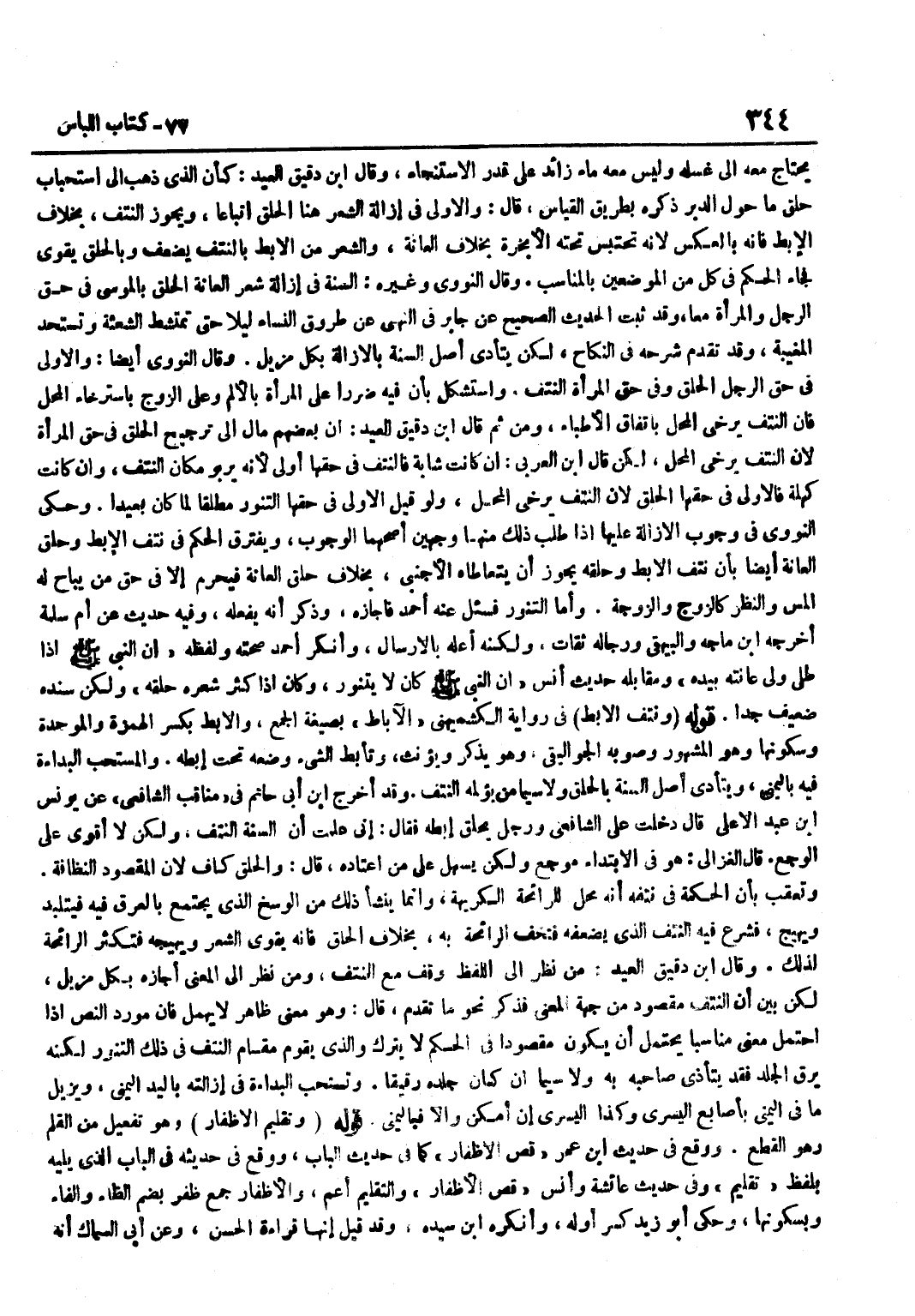 يَحْتَاجُ مَعَهُ إِلَى غَسْلِهِ وَلَيْسَ مَعَهُ مَاءٌ زَائِد على قدر الِاسْتِنْجَاء وَقَالَ بن دَقِيقِ الْعِيدِ كَأَنَّ الَّذِي ذَهَبَ إِلَى اسْتِحْبَابِ حَلْقِ مَا حَوْلَ الدُّبُرِ ذَكَرَهُ بِطَرِيقِ الْقِيَاسِ قَالَ وَالْأَوْلَى فِي إِزَالَةِ الشَّعْرِ هُنَا الْحَلْقُ اتِّبَاعًا وَيَجُوزُ النَّتْفُ بِخِلَافِ الْإِبْطِ فَإِنَّهُ بِالْعَكْسِ لِأَنَّهُ تُحْتَبَسُ تَحْتَهُ الْأَبْخِرَةُ بِخِلَافِ الْعَانَةِ وَالشَّعْرُ مِنَ الْإِبْطِ بِالنَّتْفِ يَضْعُفُ وَبِالْحَلْقِ يَقْوَى فَجَاءَ الْحُكْمُ فِي كُلٍّ مِنَ الْمَوْضِعَيْنِ بِالْمُنَاسِبِ وَقَالَ النَّوَوِيُّ وَغَيْرُهُ السُّنَّةُ فِي إِزَالَةِ شَعْرِ الْعَانَةِ الْحَلْقُ بِالْمُوسَى فِي حَقِّ الرَّجُلِ وَالْمَرْأَةِ مَعًا وَقَدْ ثَبَتَ الْحَدِيثُ الصَّحِيحُ عَنْ جَابِرٍ فِي النَّهْيِ عَنْ طُرُوقِ النِّسَاءِ لَيْلًا حَتَّى تَمْتَشِطَ الشَّعِثَةُ وَتَسْتَحِدَّ الْمُغِيبَةُ وَقَدْ تَقَدَّمَ شَرْحُهُ فِي النِّكَاحِ لَكِنْ يَتَأَدَّى أَصْلُ السُّنَّةِ بِالْإِزَالَةِ بِكُلِّ مُزِيلٍ وَقَالَ النَّوَوِيُّ أَيْضًا وَالْأَوْلَى فِي حَقِّ الرَّجُلِ الْحَلْقُ وَفِي حَقِّ الْمَرْأَةِ النَّتْفُ وَاسْتَشْكَلَ بِأَنَّ فِيهِ ضَرَرًا عَلَى الْمَرْأَةِ بِالْأَلَمِ وَعَلَى الزَّوْجِ بِاسْتِرْخَاءِ الْمَحَلِّ فَإِنَّ النَّتْفَ يُرْخِي الْمَحَلَّ بِاتِّفَاق الْأَطِبَّاء وَمن ثمَّ قَالَ بن دَقِيقِ الْعِيدِ إِنَّ بَعْضَهُمْ مَالَ إِلَى تَرْجِيحِ الْحَلْقِ فِي حَقِّ الْمَرْأَةِ لِأَنَّ النَّتْفَ يُرْخِي الْمحل لَكِن قَالَ بن الْعَرَبِيِّ إِنْ كَانَتْ شَابَّةً فَالنَّتْفُ فِي حَقِّهَا أَوْلَى لِأَنَّهُ يَرْبُو مَكَانَ النَّتْفِ وَإِنْ كَانَتْ كَهْلَةً فَالْأَوْلَى فِي حَقِّهَا الْحَلْقُ لِأَنَّ النَّتْفَ يُرْخِي الْمَحَلَّ وَلَوْ قِيلَ الْأَوْلَى فِي حَقِّهَا التَّنَوُّرُ مُطْلَقًا لِمَا كَانَ بَعِيدًا وَحَكَى النَّوَوِيُّ فِي وُجُوبِ الْإِزَالَةِ عَلَيْهَا إِذَا طُلِبَ ذَلِكَ مِنْهَا وَجْهَيْنِ أَصَحُّهُمَا الْوُجُوبُ وَيَفْتَرِقُ الْحُكْمُ فِي نَتْفِ الْإِبْطِ وَحَلْقِ الْعَانَةِ أَيْضًا بِأَنَّ نَتْفَ الْإِبْطِ وَحَلْقَهُ يَجُوزُ أَنْ يَتَعَاطَاهُ الْأَجْنَبِيُّ بِخِلَافِ حَلْقِ الْعَانَةِ فَيَحْرُمُ إِلَّا فِي حَقِّ مَنْ يُبَاحُ لَهُ الْمَسُّ وَالنَّظَرُ كَالزَّوْجِ وَالزَّوْجَةِ وَأَمَّا التَّنَوُّرُ فَسُئِلَ عَنْهُ أَحْمَدُ فَأَجَازَهُ وَذَكَرَ أَنَّهُ يَفْعَلَهُ وَفِيهِ حَدِيثٌ عَنْ أُمِّ سَلَمَةَ أَخْرَجَهُ بن مَاجَهْ وَالْبَيْهَقِيُّ وَرِجَالُهُ ثِقَاتٌ وَلَكِنَّهُ أَعَلَّهُ بِالْإِرْسَالِ وَأَنْكَرَ أَحْمَدُ صِحَّتَهُ وَلَفْظُهُ أَنَّ النَّبِيَّ صَلَّى اللَّهُ عَلَيْهِ وَسَلَّمَ إِذَا طلى وَلِيَ عَانَتَهُ بِيَدِهِ وَمُقَابِلُهُ حَدِيثِ أَنَسٍ أَنَّ النَّبِيَّ صَلَّى اللَّهُ عَلَيْهِ وَسَلَّمَ كَانَ لَا يَتَنَوَّرُ وَكَانَ إِذَا كَثُرَ شَعْرُهُ حَلَقَهُ وَلَكِنْ سَنَدُهُ ضَعِيفٌ جِدًّا قَوْلُهُ وَنَتْفُ الْإِبْطِ فِي رِوَايَةِ الْكُشْمِيهَنِيِّ الْآبَاطُ بِصِيغَةِ الْجَمْعِ وَالْإِبْطُ بِكَسْرِ الْهَمْزَةِ وَالْمُوَحَّدَةِ وَسُكُونِهَا وَهُوَ الْمَشْهُورُ وَصَوَّبَهُ الْجَوَالِيقِيُّ وَهُوَ يُذَكَّرُ وَيُؤَنَّثُ وَتَأَبَّطَ الشَّيْءَ وَضَعَهُ تَحْتَ إِبْطِهِ وَالْمُسْتَحَبُّ الْبُدَاءَةُ فِيهِ بِالْيُمْنَى وَيَتَأَدَّى أَصْلُ السُّنَّةِ بِالْحَلْقِ وَلَا سِيَّمَا مَنْ يُؤْلِمُهُ النَّتْفُ وَقد أخرج بن أَبِي حَاتِمٍ فِي مَنَاقِبِ الشَّافِعِيِّ عَنْ يُونُسَ بْنِ عَبْدِ الْأَعْلَى قَالَ دَخَلْتُ عَلَى الشَّافِعِيِّ وَرَجُلٌ يَحْلِقُ إِبْطَهُ فَقَالَ إِنِّي عَلِمْتُ أَنَّ السُّنَّةَ النَّتْف