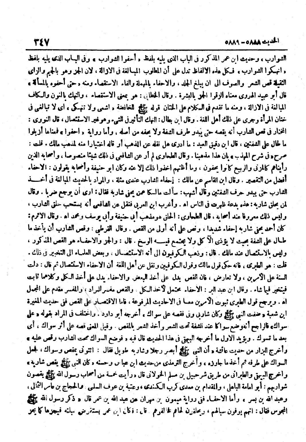 الشَّوَارِب وَحَدِيث بن عُمَرَ الْمَذْكُورِ فِي الْبَابِ الَّذِي يَلِيهِ بِلَفْظِ أَحْفُوا الشَّوَارِبَ وَفِي الْبَابِ الَّذِي يَلِيهِ بِلَفْظِ انْهَكُوا الشَّوَارِبَ فَكُلُّ هَذِهِ الْأَلْفَاظِ تَدُلُّ عَلَى أَنَّ الْمَطْلُوبَ الْمُبَالَغَةُ فِي الْإِزَالَةِ لِأَنَّ الْجَزَّ وَهُوَ بِالْجِيمِ وَالزَّايِ الثَّقِيلَةِ قَصُّ الشَّعْرِ وَالصُّوفِ إِلَى أَنْ يَبْلُغَ الْجِلْدَ وَالْإِحْفَاءُ بِالْمُهْمَلَةِ وَالْفَاءِ الِاسْتِقْصَاءُ وَمِنْهُ حَتَّى أَحْفَوْهُ بِالْمَسْأَلَةِ قَالَ أَبُو عُبَيْدٍ الْهَرَوِيُّ مَعْنَاهُ الْزَقُوا الْجَزَّ بِالْبَشَرَةِ وَقَالَ الْخَطَّابِيُّ هُوَ بِمَعْنَى الِاسْتِقْصَاءِ وَالنَّهْكُ بِالنُّونِ وَالْكَافِ الْمُبَالَغَةُ فِي الْإِزَالَةِ وَمِنْهُ مَا تَقَدَّمَ فِي الْكَلَامِ عَلَى الْخِتَانِ قَوْلُهُ صَلَّى اللَّهُ عَلَيْهِ وَسَلَّمَ لِلْخَافِضَةِ أَشِمِّي وَلَا تُنْهِكِي أَيْ لَا تُبَالِغِي فِي خِتَانِ الْمَرْأَةِ وَجَرَى عَلَى ذَلِكَ أهل اللُّغَة وَقَالَ بن بَطَّالٍ النَّهْكُ التَّأْثِيرُ فِي الشَّيْءِ وَهُوَ غَيْرُ الِاسْتِئْصَالِ قَالَ النَّوَوِيُّ الْمُخْتَارُ فِي قَصِّ الشَّارِبِ أَنَّهُ يَقُصُّهُ حَتَّى يَبْدُوَ طَرَفُ الشَّفَةِ وَلَا يَحُفَّهُ مِنْ أَصْلِهِ وَأَمَّا رِوَايَةُ أَحْفُوا فَمَعْنَاهَا أزيلوا مَا طَال على الشفتين قَالَ بن دَقِيقِ الْعِيدِ مَا أَدْرِي هَلْ نَقَلَهُ عَنِ الْمَذْهَبِ أَوْ قَالَهُ اخْتِيَارًا مِنْهُ لِمَذْهَبِ مَالِكٍ قُلْتُ صَرَّحَ فِي شَرْحِ الْمُهَذَّبِ بِأَنَّ هَذَا مَذْهَبُنَا وَقَالَ الطَّحَاوِيُّ لَمْ أَرَ عَنِ الشَّافِعِيِّ فِي ذَلِكَ شَيْئًا مَنْصُوصًا وَأَصْحَابُهُ الَّذِينَ رَأَيْنَاهُمْ كَالْمُزَنِيِّ وَالرَّبِيعِ كَانُوا يَحْفُونَ وَمَا أَظُنُّهُمْ أَخَذُوا ذَلِكَ إِلَّا عَنْهُ وَكَانَ أَبُو حَنِيفَةَ وَأَصْحَابُهُ يَقُولُونَ الاحفاء أفضل من التَّقْصِير وَقَالَ بن الْقَاسِمِ عَنْ مَالِكٍ إِحْفَاءُ الشَّارِبِ عِنْدِي مُثْلَةٌ وَالْمُرَادُ بِالْحَدِيثِ الْمُبَالَغَةُ فِي أَخْذِ الشَّارِبِ حَتَّى يَبْدُوَ حَرْفُ الشَّفَتَيْنِ وَقَالَ أَشْهَبُ سَأَلْتُ مَالِكًا عَمَّنْ يُحْفِي شَارِبَهُ فَقَالَ أَرَى أَنْ يُوجَعَ ضَرْبًا وَقَالَ لِمَنْ يَحْلِقُ شَارِبَهُ هَذِهِ بِدْعَةٌ ظَهرت فِي النَّاس اه وَأغْرب بن الْعَرَبِيِّ فَنَقَلَ عَنِ الشَّافِعِيِّ أَنَّهُ يُسْتَحَبُّ حَلْقُ الشَّارِبِ وَلَيْسَ ذَلِكَ مَعْرُوفًا عِنْدَ أَصْحَابِهِ قَالَ الطَّحَاوِيُّ الْحَلْقُ هُوَ مَذْهَبُ أَبِي حَنِيفَةَ وَأَبِي يُوسُفَ وَمُحَمَّدٍ اه وَقَالَ الْأَثْرَمُ كَانَ أَحْمَدُ يُحْفِي شَارِبَهُ إِحْفَاءً شَدِيدًا وَنَصَّ عَلَى أَنَّهُ أَوْلَى مِنَ الْقَصِّ وَقَالَ الْقُرْطُبِيُّ وَقَصُّ الشَّارِبِ أَنْ يَأْخُذَ مَا طَالَ عَلَى الشَّفَةِ بِحَيْثُ لَا يُؤْذِي الْأَكْلَ وَلَا يَجْتَمِعُ فِيهِ الْوَسَخُ قَالَ وَالْجَزُّ وَالْإِحْفَاءُ هُوَ الْقَصُّ الْمَذْكُورُ وَلَيْسَ بِالِاسْتِئْصَالِ عِنْدَ مَالِكٍ قَالَ وَذَهَبَ الْكُوفِيُّونَ إِلَى أَنَّهُ الِاسْتِئْصَالُ وَبَعْضُ الْعُلَمَاءِ إِلَى التَّخْيِيرِ فِي ذَلِكَ قُلْتُ هُوَ الطَّبَرِيُّ فَإِنَّهُ حَكَى قَوْلَ مَالِكٍ وَقَوْلَ الْكُوفِيِّينَ وَنُقِلَ عَنْ أَهْلِ اللُّغَةِ أَنَّ الْإِحْفَاءَ الِاسْتِئْصَالُ ثُمَّ قَالَ دَلَّتِ السُّنَّةُ عَلَى الْأَمْرَيْنِ وَلَا تَعَارُضَ فَإِنَّ الْقَصَّ يَدُلُّ عَلَى أَخْذِ الْبَعْضِ وَالْإِحْفَاءُ يَدُلُّ عَلَى أَخْذِ الْكُلِّ وَكِلَاهُمَا ثَابِتٌ فَيَتَخَيَّرُ فِيمَا شَاءَ وَقَالَ بن عَبْدِ الْبَرِّ الْإِحْفَاءُ مُحْتَمَلٌ لِأَخْذِ الْكُلِّ وَالْقَصُّ مُفَسِّرٌ لِلْمُرَادِ وَالْمُفَسِّرُ مُقَدَّمٌ عَل