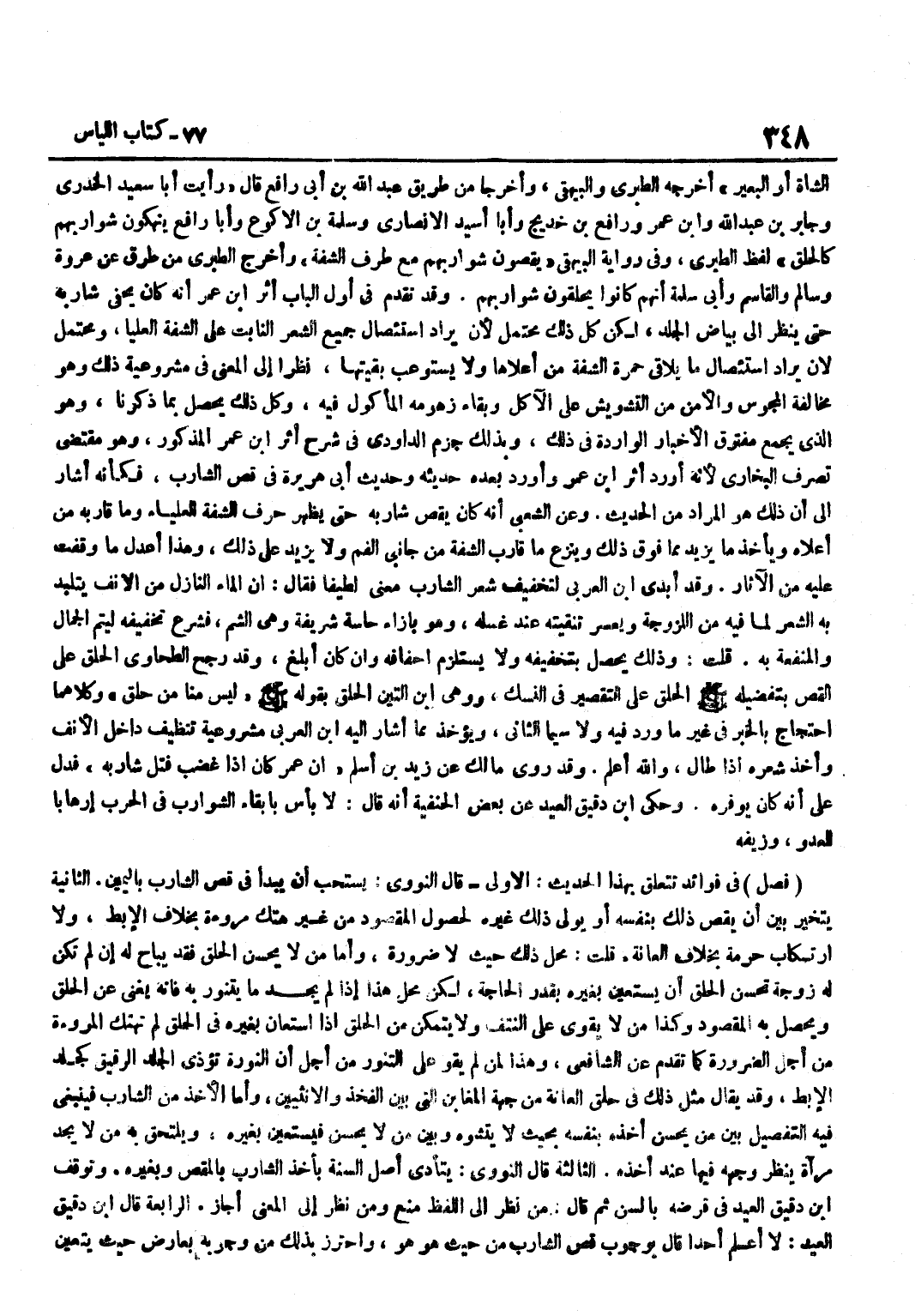 الشَّاةَ أَوِ الْبَعِيرَ أَخْرَجَهُ الطَّبَرِيُّ وَالْبَيْهَقِيُّ وَأَخْرَجَا مِنْ طَرِيقِ عَبْدِ اللَّهِ بْنِ أَبِي رَافِعٍ قَالَ رَأَيْتُ أَبَا سَعِيدٍ الْخُدْرِيَّ وَجَابِرَ بن عبد الله وبن عُمَرَ وَرَافِعَ بْنَ خَدِيجٍ وَأَبَا أُسَيْدٍ الْأَنْصَارِيَّ وَسَلَمَةَ بْنَ الْأَكْوَعِ وَأَبَا رَافِعٍ يُنْهِكُونَ شَوَارِبَهُمْ كَالْحَلْقِ لَفْظُ الطَّبَرَيِّ وَفِي رِوَايَةِ الْبَيْهَقِيِّ يَقُصُّونَ شَوَارِبَهُمْ مَعَ طَرَفِ الشَّفَةِ وَأَخْرَجَ الطَّبَرِيُّ مِنْ طُرُقٍ عَنْ عُرْوَةَ وَسَالِمٍ وَالْقَاسِمِ وَأَبِي سَلَمَةَ أَنَّهُمْ كَانُوا يَحْلِقُونَ شَوَارِبَهُمْ وَقَدْ تَقَدَّمَ فِي أول الْبَاب أثر بن عُمَرَ أَنَّهُ كَانَ يُحْفِي شَارِبَهُ حَتَّى يَنْظُرَ إِلَى بَيَاضِ الْجِلْدِ لَكِنْ كُلُّ ذَلِكَ مُحْتَمَلٌ لِأَنْ يُرَادَ اسْتِئْصَالُ جَمِيعِ الشَّعْرِ النَّابِتِ عَلَى الشَّفَةِ الْعُلْيَا وَمُحْتَمَلٌ لِأَنْ يُرَادَ اسْتِئْصَالُ مَا يُلَاقِي حُمْرَةَ الشَّفَةِ مِنْ أَعْلَاهَا وَلَا يَسْتَوْعِبُ بَقِيَّتَهَا نَظَرًا إِلَى الْمَعْنَى فِي مَشْرُوعِيَّةِ ذَلِكَ وَهُوَ مُخَالَفَةُ الْمَجُوسِ وَالْأَمْنُ مِنَ التَّشْوِيشِ عَلَى الْأَكْلِ وَبَقَاءِ زُهُومَةِ الْمَأْكُولِ فِيهِ وَكُلُّ ذَلِكَ يَحْصُلُ بِمَا ذَكَرْنَا وَهُوَ الَّذِي يَجْمَعُ مُفْتَرَقَ الْأَخْبَارِ الْوَارِدَةِ فِي ذَلِكَ وَبِذَلِكَ جَزَمَ الدَّاوُدِيُّ فِي شرح أثر بن عُمَرَ الْمَذْكُورِ وَهُوَ مُقْتَضَى تَصَرُّفِ الْبُخَارِيِّ لِأَنَّهُ أورد أثر بن عُمَرَ وَأَوْرَدَ بَعْدَهُ حَدِيثَهُ وَحَدِيثَ أَبِي هُرَيْرَةَ فِي قَصِّ الشَّارِبِ فَكَأَنَّهُ أَشَارَ إِلَى أَنَّ ذَلِكَ هُوَ الْمُرَادُ مِنَ الْحَدِيثِ وَعَنِ الشَّعْبِيِّ أَنَّهُ كَانَ يَقُصُّ شَارِبَهُ حَتَّى يُظْهِرَ حَرْفَ الشَّفَةِ الْعَلْيَاءِ وَمَا قَارَبَهُ مِنْ أَعْلَاهُ وَيَأْخُذُ مَا يَزِيدُ مِمَّا فَوْقَ ذَلِكَ وَيَنْزِعُ مَا قَارَبَ الشَّفَةَ مِنْ جَانِبَيِ الْفَمِ وَلَا يَزِيدُ عَلَى ذَلِكَ وَهَذَا أَعْدَلُ مَا وَقَفْتُ عَلَيْهِ من الْآثَار وَقد أبدى بن الْعَرَبِيِّ لِتَخْفِيفِ شَعْرِ الشَّارِبِ مَعْنًى لَطِيفًا فَقَالَ إِنَّ الْمَاءَ النَّازِلَ مِنَ الْأَنْفِ يَتَلَبَّدُ بِهِ الشَّعْرُ لِمَا فِيهِ مِنَ اللُّزُوجَةِ وَيَعْسُرُ تَنْقِيَتُهُ عِنْدَ غَسْلِهِ وَهُوَ بِإِزَاءِ حَاسَّةٍ شَرِيفَةٍ وَهِيَ الشَّمُّ فَشَرَعَ تَخْفِيفَهُ لِيَتِمَّ الْجَمَالُ وَالْمَنْفَعَةُ بِهِ قُلْتُ وَذَلِكَ يَحْصُلُ بِتَخْفِيفِهِ وَلَا يَسْتَلْزِمُ إِحْفَافَهُ وَإِنْ كَانَ أَبْلَغَ وَقَدْ رَجَّحَ الطَّحَاوِيُّ الْحَلْقَ عَلَى الْقَصِّ بِتَفْضِيلِهِ صَلَّى اللَّهُ عَلَيْهِ وَسَلَّمَ الْحلق على التَّقْصِير فِي النّسك ووهى بن التِّينِ الْحَلْقَ بِقَوْلِهِ صَلَّى اللَّهُ عَلَيْهِ وَسَلَّمَ لَيْسَ مِنَّا مَنْ حَلَقَ وَكِلَاهُمَا احْتِجَاجٌ بِالْخَبَرِ فِي غَيْرِ مَا وَرَدَ فِيهِ وَلَا سِيَّمَا الثَّانِي وَيُؤْخَذ مِمَّا أَشَارَ إِلَيْهِ بن الْعَرَبِيِّ مَشْرُوعِيَّةُ تَنْظِيفِ دَاخِلِ الْأَنْفِ وَأَخْذُ شَعْرِهِ إِذَا طَالَ وَاللَّهُ أَعْلَمُ وَقَدْ رَوَى مَالِكٍ عَنْ زَيْدِ بْنِ أَسْلَمَ أَنَّ عُمَرَ كَانَ إِذَا غَضِبَ فَتَلَ شَارِبَهُ فَدَلَّ عَلَى أَنَّهُ كَانَ يوفره وَحكى بن دَقِيقِ الْعِيدِ عَنْ بَعْضِ الْحَنَفِيَّةِ أَنَّهُ قَالَ لَا بَأْسَ بِإِبْقَاءِ الشَّوَارِبِ فِي الْحَرْبِ إِرْهَابًا لِلْعَدُوِّ وَزَيَّفَهُ فَصْلٌ فِي فَوَائِدَ تَتَعَلَّقُ بِهَذَا الْحَدِيثِ الْأُولَى قَالَ النَّوَوِيُّ يُسْتَحَبُّ أَنْ يُبْدَأَ فِي قَصِّ الشَّارِبِ بِالْيَمِينِ الثَّانِيَةُ يَتَخَيَّرُ بَيْنَ أَنْ يَقُصَّ ذَلِكَ بِنَفْسِهِ أَوْ يُوَلِّيَ ذ