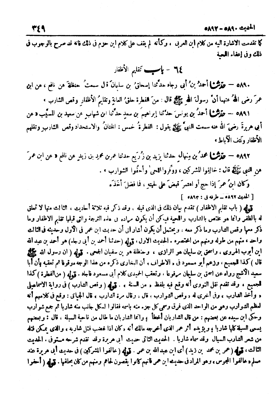[5890] قَوْلُهُ حَدَّثَنَا أَحْمَدُ بْنُ أَبِي رَجَاءٍ هُوَ أَحْمَدُ بْنُ عَبْدِ اللَّهِ بْنِ أَيُّوبَ الْهَرَوِيُّ وَإِسْحَاقُ بْنُ سُلَيْمَانَ هُوَ الرَّازِيُّ وَحَنْظَلَةُ هُوَ بن سُفْيَانَ الْجُمَحِيُّ قَوْلُهُ أَنَّ رَسُولَ اللَّهِ صَلَّى اللَّهُ عَلَيْهِ وَسَلَّمَ قَالَ كَذَا لِلْجَمِيعِ وَزَعَمَ أَبُو مَسْعُودٍ فِي الْأَطْرَافِ أَنَّ الْبُخَارِيَّ ذَكَرَهُ مِنْ هَذَا الْوَجْهِ مَوْقُوفًا ثُمَّ تَعَقَّبَهُ بِأَنَّ أَبَا سَعِيدٍ الْأَشَجَّ رَوَاهُ عَنْ إِسْحَاقَ بْنِ سُلَيْمَانَ مَرْفُوعًا وَتَعَقَّبَ الْحُمَيْدِيُّ كَلَامَ أَبِي مَسْعُودٍ فَأَجَادَ قَوْلُهُ مِنَ الْفِطْرَةِ كَذَا لِلْجَمِيعِ وَقَدْ تَقَدَّمَ نَقْلُ النَّوَوِيِّ أَنَّهُ وَقَعَ فِيهِ بِلَفْظٍ مِنَ السُّنَّةِ قَوْلُهُ وَقَصُّ الشَّارِبِ فِي رِوَايَةِ الْإِسْمَاعِيلِيِّ وَأَخْذُ الشَّارِبِ وَفِي أُخْرَى لَهُ وَقَصُّ الشَّوَارِبِ قَالَ وَقَالَ مَرَّةً الشَّارِبَ قَالَ الْجَيَّانِيُّ وَقَعَ فِي كَلَامِهِمْ أَنَّهُ لِعِظَمِ الشَّوَارِبِ وَهُوَ مِنَ الْوَاحِدِ الَّذِي فَرَّقَ وَسَمَّى كُلَّ جُزْءٍ مِنْهُ بِاسْمِهِ فَقَالُوا لِكُلِّ جَانِبٍ مِنْهُ شَارِبًا ثمَّ جمع شوارب وَحكى بن سِيدَهْ عَنْ بَعْضِهِمْ مَنْ قَالَ الشَّارِبَانِ أَخْطَأَ وَإِنَّمَا الشَّارِبَانِ مَا طَالَ مِنْ نَاحِيَةِ السَّبَلَةِ قَالَ وَبَعْضُهُمْ يُسَمِّي السَّبَلَةَ كُلَّهَا شَارِبًا وَيُؤَيِّدُهُ أَثَرُ عُمَرَ الَّذِي أَخْرَجَهُ مَالِكٌ أَنَّهُ كَانَ إِذَا غَضِبَ فَتَلَ شَارِبَهُ وَالَّذِي يُمْكِنُ فَتْلُهُ مِنْ شَعْرِ الشَّارِبِ السِّبَالِ وَقَدْ سَمَّاهُ شَارِبًا الْحَدِيثُ الثَّانِي حَدِيثُ أَبِي هُرَيْرَةَ وَقَدْ تَقَدَّمَ شَرْحُهُ مُسْتَوْفًى الْحَدِيثُ الثَّالِثُ
