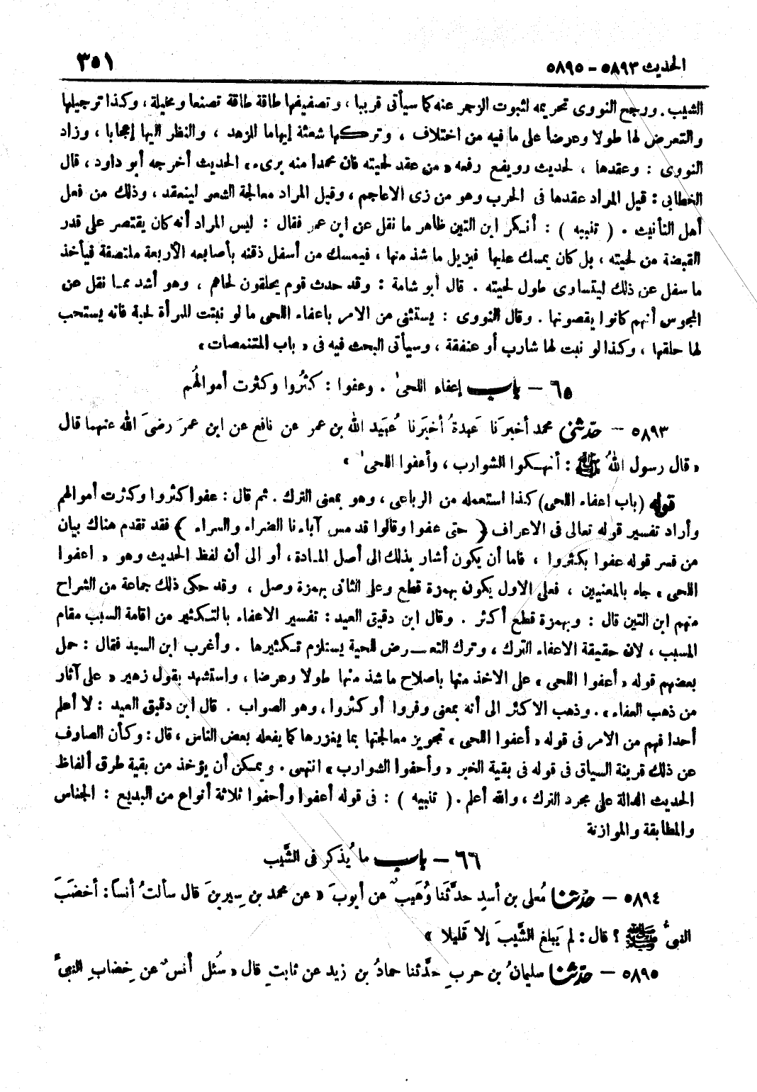 [5893] قَوْلَهُ أَعْفُوا اللِّحَى عَلَى الْأَخْذِ مِنْهَا بِإِصْلَاحِ مَا شَذَّ مِنْهَا طُولًا وَعَرْضًا وَاسْتَشْهَدَ بِقَوْلِ زُهَيْرٍ عَلَى آثَارِ مَنْ ذَهَبَ الْعَفَاءُ وَذَهَبَ الْأَكْثَرُ إِلَى أَنَّهُ بِمَعْنَى وَفِّرُوا أَوْ كَثِّرُوا وَهُوَ الصَّوَابُ قَالَ بن دَقِيقِ الْعِيدِ لَا أَعْلَمُ أَحَدًا فَهِمَ مِنَ الْأَمْرِ فِي قَوْلِهِ أَعْفُوا اللِّحَى تَجْوِيزَ مُعَالَجَتِهَا بِمَا يُغْزِرُهَا كَمَا يَفْعَلُهُ بَعْضُ النَّاسِ قَالَ وَكَأَنَّ الصَّارِفَ عَنْ ذَلِكَ قَرِينَةُ السِّيَاقِ فِي قَوْلِهِ فِي بَقِيَّةِ الْخَبَرِ وَأَحْفُوا الشَّوَارِبَ انْتَهَى وَيُمْكِنُ أَنْ يُؤْخَذَ مِنْ بَقِيَّةِ طُرُقِ أَلْفَاظِ الْحَدِيثِ الدَّالَّةِ عَلَى مُجَرَّدِ التَّرْكِ وَاللَّهُ أَعْلَمُ تَنْبِيهٌ فِي قَوْلِهِ أَعْفُوا وَأَحْفُوا ثَلَاثَةُ أَنْوَاعٍ من البديع الجناس والمطابقة والموازنة