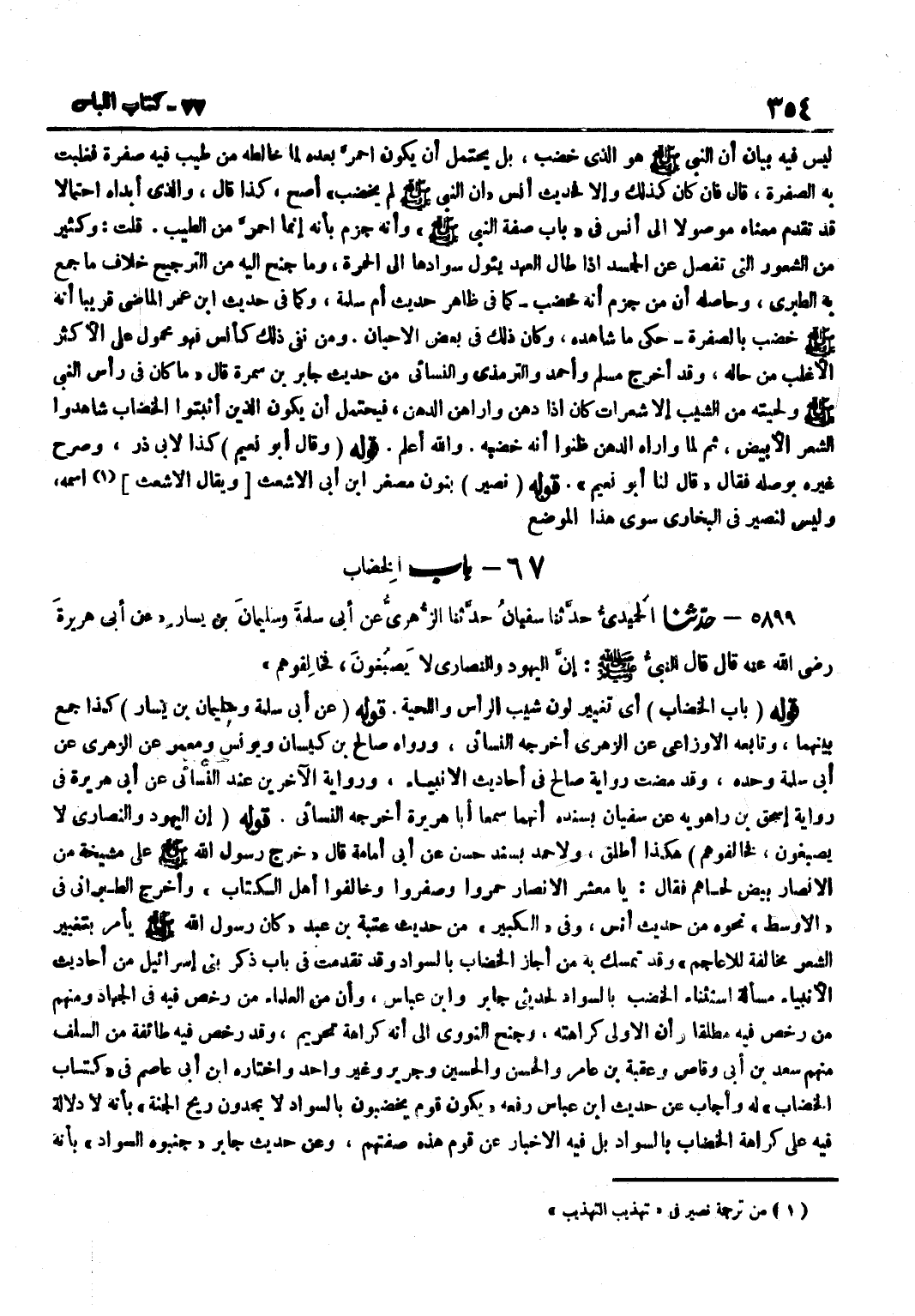 لَيْسَ فِيهِ بَيَانٌ أَنَّ النَّبِيَّ صَلَّى اللَّهُ عَلَيْهِ وَسَلَّمَ هُوَ الَّذِي خَضَّبَ بَلْ يُحْتَمَلُ أَنْ يَكُونَ احْمَرَّ بَعْدَهُ لِمَا خَالَطَهُ مِنْ طِيبٍ فِيهِ صُفْرَةٌ فَغَلَبَتْ بِهِ الصُّفْرَةُ قَالَ فَإِنْ كَانَ كَذَلِكَ وَإِلَّا فَحَدِيثُ أَنَسٍ أَنَّ النَّبِيَّ صَلَّى اللَّهُ عَلَيْهِ وَسَلَّمَ لَمْ يُخَضِّبْ أَصَحُّ كَذَا قَالَ وَالَّذِي أَبَدَاهُ احْتِمَالًا قَدْ تَقَدَّمَ مَعْنَاهُ مَوْصُولًا إِلَى أَنَسٍ فِي بَابِ صِفَةِ النَّبِيِّ صَلَّى اللَّهُ عَلَيْهِ وَسَلَّمَ وَأَنَّهُ جَزَمَ بِأَنَّهُ إِنَّمَا احْمَرَّ مِنَ الطِّيبِ قُلْتُ وَكثير مِنَ الشُّعُورِ الَّتِي تُفْصَلُ عَنِ الْجَسَدِ إِذَا طَالَ الْعَهْدُ يَئُولُ سَوَادُهَا إِلَى الْحُمْرَةِ وَمَا جَنَحَ إِلَيْهِ مِنَ التَّرْجِيحِ خِلَافُ مَا جَمَعَ بِهِ الطَّبَرِيُّ وَحَاصِلُهُ أَنَّ مَنْ جَزَمَ أَنَّهُ خَضَّبَ كَمَا فِي ظَاهِرِ حَدِيثِ أُمِّ سَلَمَةَ وكما فِي حَدِيث بن عُمَرَ الْمَاضِي قَرِيبًا أَنَّهُ صَلَّى اللَّهُ عَلَيْهِ وَسَلَّمَ خَضَّبَ بِالصُّفْرَةِ حَكَى مَا شَاهَدَهُ وَكَانَ ذَلِكَ فِي بَعْضِ الْأَحْيَانِ وَمَنْ نَفَى ذَلِكَ كَأَنَسٍ فَهُوَ مَحْمُولٌ عَلَى الْأَكْثَرِ الْأَغْلَبِ مِنْ حَالِهِ وَقَدْ أَخْرَجَ مُسْلِمٌ وَأَحْمَدُ وَالتِّرْمِذِيُّ وَالنَّسَائِيُّ مِنْ حَدِيثِ جَابِرِ بْنِ سَمُرَةَ قَالَ مَا كَانَ فِي رَأْسِ النَّبِيِّ صَلَّى اللَّهُ عَلَيْهِ وَسَلَّمَ وَلِحْيَتِهِ مِنَ الشَّيْبِ إِلَّا شَعَرَاتٌ كَانَ إِذَا دَهَنَ وَأَرَاهُنَّ الدُّهْنَ فَيُحْتَمَلُ أَنْ يَكُونَ الَّذِينَ أَثْبَتُوا الْخِضَابَ شَاهَدُوا الشَّعْرَ الْأَبْيَضَ ثُمَّ لما واراه الدّهن ظنُّوا أَنه خضبه وَاللَّهُ أَعْلَمُ قَوْلُهُ وَقَالَ أَبُو نُعَيْمٍ كَذَا لِأَبِي ذَرٍّ وَصَرَّحَ غَيْرُهُ بِوَصْلِهِ فَقَالَ قَالَ لَنَا أَبُو نُعَيْمٍ قَوْلُهُ نُصَيْرٌ بِنُونٍ مُصَغَّرٌ بن أبي الْأَشْعَث وَيُقَال الْأَشْعَث اسْمُهُ وَلَيْسَ لِنُصَيْرٍ فِي الْبُخَارِيِّ سِوَى هَذَا الْموضع