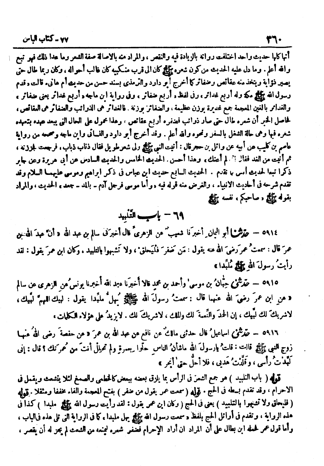 [5914] قَوْلُهُ سَمِعْتُ عُمَرَ يَقُولُ مَنْ ضَفَّرَ بِفَتْحِ الْمُعْجَمَةِ وَالْفَاءِ مُخَفَّفًا وَمُثَقَّلًا قَوْلُهُ فَلْيَحْلِقْ وَلَا تَشَبَّهُوا بِالتَّلْبِيدِ يَعْنِي فِي الْحَج وَكَانَ بن عُمَرَ يَقُولُ لَقَدْ رَأَيْتُ رَسُولَ اللَّهِ صَلَّى اللَّهُ عَلَيْهِ وَسَلَّمَ مُلَبِّدًا كَذَا فِي هَذِهِ الرِّوَايَةِ وَتَقَدَّمَ فِي أَوَائِلِ الْحَجِّ بِلَفْظِ سَمِعْتُ رَسُولَ اللَّهِ صَلَّى اللَّهُ عَلَيْهِ وَسَلَّمَ يُهِلُّ مُلَبِّدًا كَمَا فِي الرِّوَايَةِ الَّتِي تَلِي هَذِهِ فِي الْبَاب وَأما قَول عمر فَحَمله بن بَطَّالٍ عَلَى أَنَّ الْمُرَادَ إِنْ أَرَادَ الْإِحْرَامَ فَضَفَّرَ شَعْرَهُ لِيَمْنَعَهُ مِنَ الشَّعَثِ لَمْ يَجُزْ لَهُ أَنْ يُقَصِّرَ
