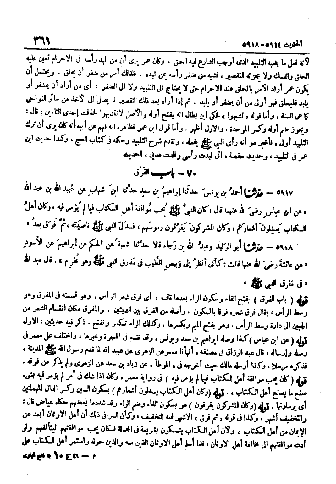 [5917] قَوْله عَن بن عَبَّاسٍ كَذَا وَصَلَهُ إِبْرَاهِيمُ بْنُ سَعْدٍ وَيُونُسُ وَقَدْ تَقَدَّمَ فِي الْهِجْرَةِ وَغَيْرِهَا وَاخْتُلِفَ عَلَى مَعْمَرٍ فِي وَصْلِهِ وَإِرْسَالِهِ قَالَ عَبْدُ الرَّزَّاقِ فِي مُصَنَّفِهِ أَنْبَأَنَا مَعْمَرٌ عَنِ الزُّهْرِيِّ عَنْ عُبَيْدِ اللَّهِ لَمَّا قَدِمَ رَسُولُ اللَّهِ صَلَّى اللَّهُ عَلَيْهِ وَسَلَّمَ الْمَدِينَةَ فَذَكَرَهُ مُرْسَلًا وَكَذَا أَرْسَلَهُ مَالِكٌ حَيْثُ أَخْرَجَهُ فِي الْمُوَطَّأِ عَنْ زِيَادِ بْنِ سَعْدٍ عَنِ الزُّهْرِيِّ وَلَمْ يَذْكُرْ مَنْ فَوْقَهُ قَوْلُهُ كَانَ يُحِبُّ مُوَافَقَةَ أَهْلِ الْكِتَابِ فِيمَا لَمْ يُؤْمَرْ فِيهِ فِي رِوَايَةِ مَعْمَرٍ وَكَانَ إِذَا شَكَّ فِي أَمْرٍ لَمْ يُؤْمَرْ فِيهِ بِشَيْءٍ صَنَعَ مَا يَصْنَعُ أَهْلُ الْكِتَابِ قَوْلُهُ وَكَانَ أَهْلُ الْكِتَابِ يَسْدِلُونَ أَشْعَارَهُمْ بِسُكُونِ السِّينِ وَكَسْرِ الدَّالِ الْمُهْمَلَتَيْنِ أَيْ يُرْسِلُونَهَا قَوْلُهُ وَكَانَ الْمُشْرِكُونَ يَفْرُقُونَ هُوَ بِسُكُونِ الْفَاءِ وَضَمِّ الرَّاءِ وَقَدْ شَدَّدَهَا بَعْضُهُمْ حَكَاهُ عِيَاضٌ قَالَ وَالتَّخْفِيفُ أَشْهَرُ وَكَذَا فِي قَوْلِهِ ثُمَّ فَرَقَ الْأَشْهَرُ فِيهِ التَّخْفِيفُ وَكَأَنَّ السِّرَّ فِي ذَلِكَ أَنَّ أَهْلَ الْأَوْثَانِ أَبْعَدُ عَنِ الْإِيمَانِ مِنْ أَهْلِ الْكِتَابِ وَلِأَنَّ أَهْلَ الْكِتَابِ يَتَمَسَّكُونَ بِشَرِيعَةٍ فِي الْجُمْلَةِ فَكَانَ يُحِبُّ مُوَافَقَتَهُمْ لِيَتَأَلَّفَهُمْ وَلَوْ أَدَّتْ مُوَافَقَتُهُمْ إِلَى مُخَالَفَةِ أَهْلِ الْأَوْثَانِ فَلَمَّا أَسْلَمَ أَهْلُ الْأَوْثَانِ الَّذِينَ مَعَهُ وَالَّذِينَ حَوْلَهُ وَاسْتَمَرَّ أَهْلُ الْكِتَابِ عَلَى