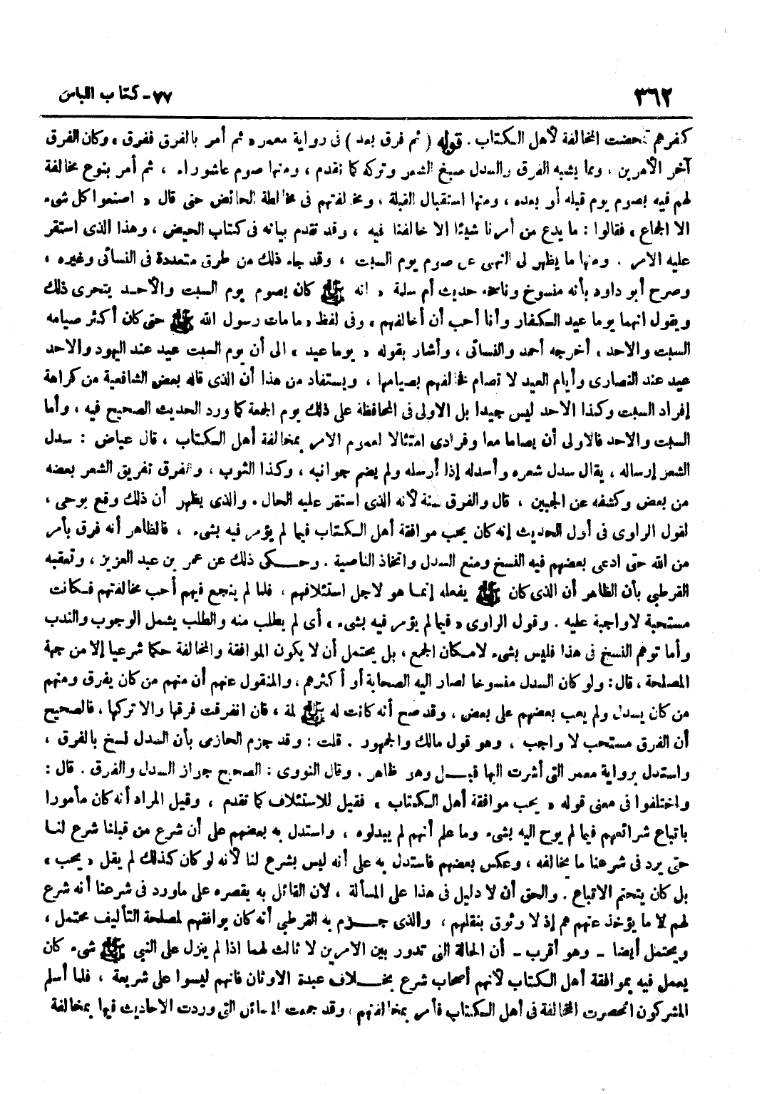 كُفْرِهِمْ تَمَحَّضَتِ الْمُخَالَفَةُ لِأَهْلِ الْكِتَابِ قَوْلُهُ ثُمَّ فَرَقَ بَعْدُ فِي رِوَايَةِ مَعْمَرٍ ثُمَّ أَمَرَ بِالْفَرْقِ فَفَرَقَ وَكَانَ الْفَرْقُ آخِرُ الْأَمْرَيْنِ وَمِمَّا يُشْبِهُ الْفَرْقَ وَالسَّدْلَ صَبْغُ الشَّعْرِ وَتَرْكُهُ كَمَا تَقَدَّمَ وَمِنْهَا صَوْمُ عَاشُورَاءَ ثُمَّ أَمَرَ بِنَوْعِ مُخَالَفَةٍ لَهُمْ فِيهِ بِصَوْمِ يَوْمٍ قَبْلَهُ أَوْ بَعْدَهُ وَمِنْهَا اسْتِقْبَالُ الْقِبْلَةِ وَمُخَالَفَتُهُمْ فِي مُخَالَطَةِ الْحَائِضِ حَتَّى قَالَ اصْنَعُوا كُلَّ شَيْءٍ إِلَّا الْجِمَاعَ فَقَالُوا مَا يَدَعُ مِنْ أَمْرِنَا شَيْئًا إِلَّا خَالَفَنَا فِيهِ وَقَدْ تَقَدَّمَ بَيَانُهُ فِي كِتَابِ الْحَيْضِ وَهَذَا الَّذِي اسْتَقَرَّ عَلَيْهِ الْأَمْرُ وَمِنْهَا مَا يظْهر لي النَّهْيِ عَنْ صَوْمِ يَوْمِ السَّبْتِ وَقَدْ جَاءَ ذَلِكَ مِنْ طُرُقٍ مُتَعَدِّدَةٍ فِي النَّسَائِيِّ وَغَيْرِهِ وَصَرَّحَ أَبُو دَاوُدَ بِأَنَّهُ مَنْسُوخٌ وَنَاسِخُهُ حَدِيثُ أُمِّ سَلَمَةَ أَنَّهُ صَلَّى اللَّهُ عَلَيْهِ وَسَلَّمَ كَانَ يَصُومُ يَوْمَ السَّبْتِ وَالْأَحَدِ يَتَحَرَّى ذَلِكَ وَيَقُولُ إِنَّهُمَا يَوْمَا عَيدِ الْكُفَّارِ وَأَنَا أُحِبُّ أَنْ أُخَالِفَهُمْ وَفِي لَفْظٍ مَا مَاتَ رَسُولِ اللَّهِ صَلَّى اللَّهُ عَلَيْهِ وَسَلَّمَ حَتَّى كَانَ أَكْثَرُ صِيَامِهِ السَّبْتَ وَالْأَحَدَ أَخْرَجَهُ أَحْمَدُ وَالنَّسَائِيُّ وَأَشَارَ بِقَوْلِهِ يَوْمَا عِيدٍ إِلَى أَنَّ يَوْمَ السَّبْتِ عِيدٌ عِنْدَ الْيَهُودِ وَالْأَحَدُ عِيدٌ عِنْدَ النَّصَارَى وَأَيَّامُ الْعِيدِ لَا تُصَامُ فَخَالَفَهُمْ بِصِيَامِهَا وَيُسْتَفَادُ مِنْ هَذَا أَنَّ الَّذِي قَالَهُ بَعْضُ الشَّافِعِيَّةِ مِنْ كَرَاهَةِ إِفْرَادِ السَّبْتِ وَكَذَا الْأَحَدُ لَيْسَ جَيِّدًا بَلِ الْأَوْلَى فِي الْمُحَافَظَةِ عَلَى ذَلِكَ يَوْمُ الْجُمُعَةِ كَمَا وَرَدَ الْحَدِيثُ الصَّحِيحُ فِيهِ وَأما السبت والأحد فَالْأولى أَنْ يُصَامَا مَعًا وَفُرَادَى امْتِثَالًا لِعُمُومِ الْأَمْرِ بِمُخَالَفَةِ أَهْلِ الْكِتَابِ قَالَ عِيَاضٌ سَدْلُ الشَّعْرِ إِرْسَالُهُ يُقَالُ سَدَلَ شَعْرَهُ وَأَسْدَلَهُ إِذَا أَرْسَلَهُ وَلَمْ يَضُمَّ جَوَانِبَهُ وَكَذَا الثَّوْبُ وَالْفَرْقُ تَفْرِيقُ الشَّعْرِ بَعْضُهُ مِنْ بَعْضٍ وَكَشْفُهُ عَنِ الْجَبِينِ قَالَ وَالْفَرْقُ سُنَّةٌ لِأَنَّهُ الَّذِي اسْتَقَرَّ عَلَيْهِ الْحَالُ وَالَّذِي يَظْهَرُ أَنَّ ذَلِكَ وَقَعَ بِوَحْيٍ لِقَوْلِ الرَّاوِي فِي أَوَّلِ الْحَدِيثِ إِنَّهُ كَانَ يُحِبُّ مُوَافَقَةَ أَهْلِ الْكِتَابِ فِيمَا لَمْ يُؤْمَرْ فِيهِ بِشَيْءٍ فَالظَّاهِرُ أَنَّهُ فَرَقَ بِأَمْرٍ مِنَ اللَّهِ حَتَّى ادَّعَى بَعْضُهُمْ فِيهِ النَّسْخَ وَمَنْعَ السَّدْلَ وَاتِّخَاذَ النَّاصِيَةِ وَحُكِيَ ذَلِكَ عَنْ عُمَرَ بْنِ عَبْدِ الْعَزِيزِ وَتَعَقَّبَهُ الْقُرْطُبِيُّ بِأَنَّ الظَّاهِرَ أَنَّ الَّذِي كَانَ صَلَّى اللَّهُ عَلَيْهِ وَسَلَّمَ يَفْعَلُهُ إِنَّمَا هُوَ لِأَجْلِ اسْتِئْلَافِهِمْ فَلَمَّا لَمْ يُنْجَعْ فِيهِمْ أَحَبَّ مُخَالَفَتَهُمْ فَكَانَتْ مُسْتَحَبَّةً لَا وَاجِبَةً عَلَيْهِ وَقَوْلُ الرَّاوِي فِيمَا لَمْ يُؤْمَرْ فِيهِ بِشَيْءٍ أَيْ لَمْ يُطْلَبْ مِنْهُ وَالطَّلَبُ يَشْمَلُ الْوُجُوبَ وَالنَّدْبَ وَأَمَّا تَوَهُّمُ النَّسْخِ فِي هَذَا فَلَيْسَ بِشَيْء لَا مَكَان الْجَمْعِ بَلْ يُحْتَمَلُ أَنْ لَا يَكُونَ الْمُوَافَقَةُ وَالْمُخَالَفَةُ حُكْمًا شَرْعِيًّا إِلَّا مِنْ جِهَةِ الْمَصْلَحَةِ قَالَ وَلَوْ كَانَ السَّدْلُ مَنْسُوخًا لَصَارَ إِلَيْهِ الصَّحَابَةُ أَوْ أَكْثَرُهُمْ وَالْمَنْقُولُ عَنْهُمْ أَنَّ مِنْهُمْ مَنْ كَانَ يَفْرُقُ وَمِن