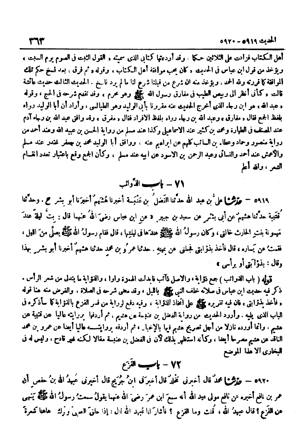 [5919] قَوْلُهُ فَأَخَذَ بِذُؤَابَتِي فَإِنَّ فِيهِ تَقْرِيرُهُ صَلَّى اللَّهُ عَلَيْهِ وَسَلَّمَ عَلَى اتِّخَاذ الذؤابة وَفِيه دفع لرِوَايَة مَنْ فَسَّرَ الْقَزَعَ بِالذُّؤَابَةِ كَمَا سَأَذْكُرُهُ فِي الْبَاب الَّذِي يَلِيهِ وَأورد الْحَدِيثَ مِنْ رِوَايَةِ الْفَضْلِ بْنِ عَنْبَسَةَ عَنْ هُشَيْمٍ ثُمَّ أَرْدَفَهَا بِرِوَايَتِهِ عَالِيًا عَنْ قُتَيْبَةَ عَنْ هُشَيْمٍ وَإِنَّمَا أَوْرَدَهُ نَازِلًا مِنْ أَجْلِ تَصْرِيحِ هُشَيْمٍ فِيهَا بِالْإِخْبَارِ ثُمَّ أَرْدَفَهُ بِرِوَايَتِهِ عَالِيًا أَيْضًا عَنْ عَمْرِو بْنِ مُحَمَّدٍ النَّاقِدِ عَنْ هُشَيْمٍ مُصَرَّحًا أَيْضًا وَكَأَنَّهُ اسْتَظْهَرَ بِذَلِكَ لِأَنَّ فِي الْفَضْلِ بْنِ عَنْبَسَةَ مَقَالًا لَكِنَّهُ غَيْرُ قَادِحٍ وَلَيْسَ لَهُ فِي الْبُخَارِيِّ إِلَّا هَذَا الْمَوْضِعُ