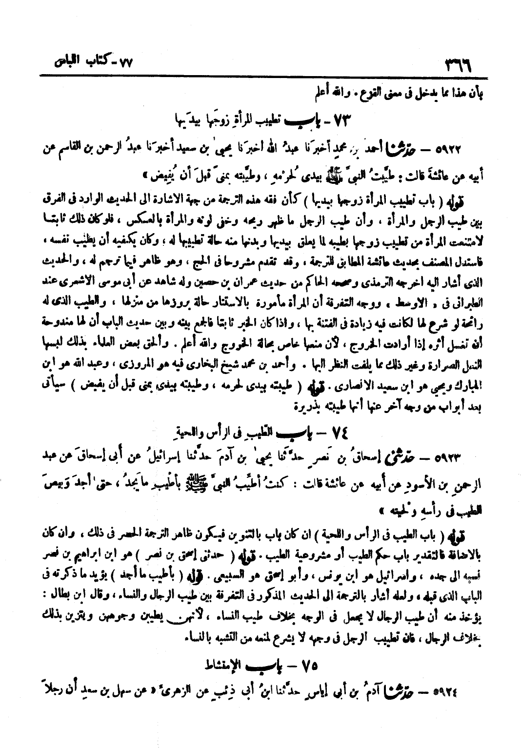 إِنْ كَانَ بَابٌ بِالتَّنْوِينِ فَيَكُونُ ظَاهِرَ التَّرْجَمَةِ الْحَصْرُ فِي ذَلِكَ وَإِنْ كَانَ بِالْإِضَافَةِ فَالتَّقْدِيرُ بَابُ حُكْمِ الطِّيبِ أَوْ مَشْرُوعِيَّةُ الطِّيبِ