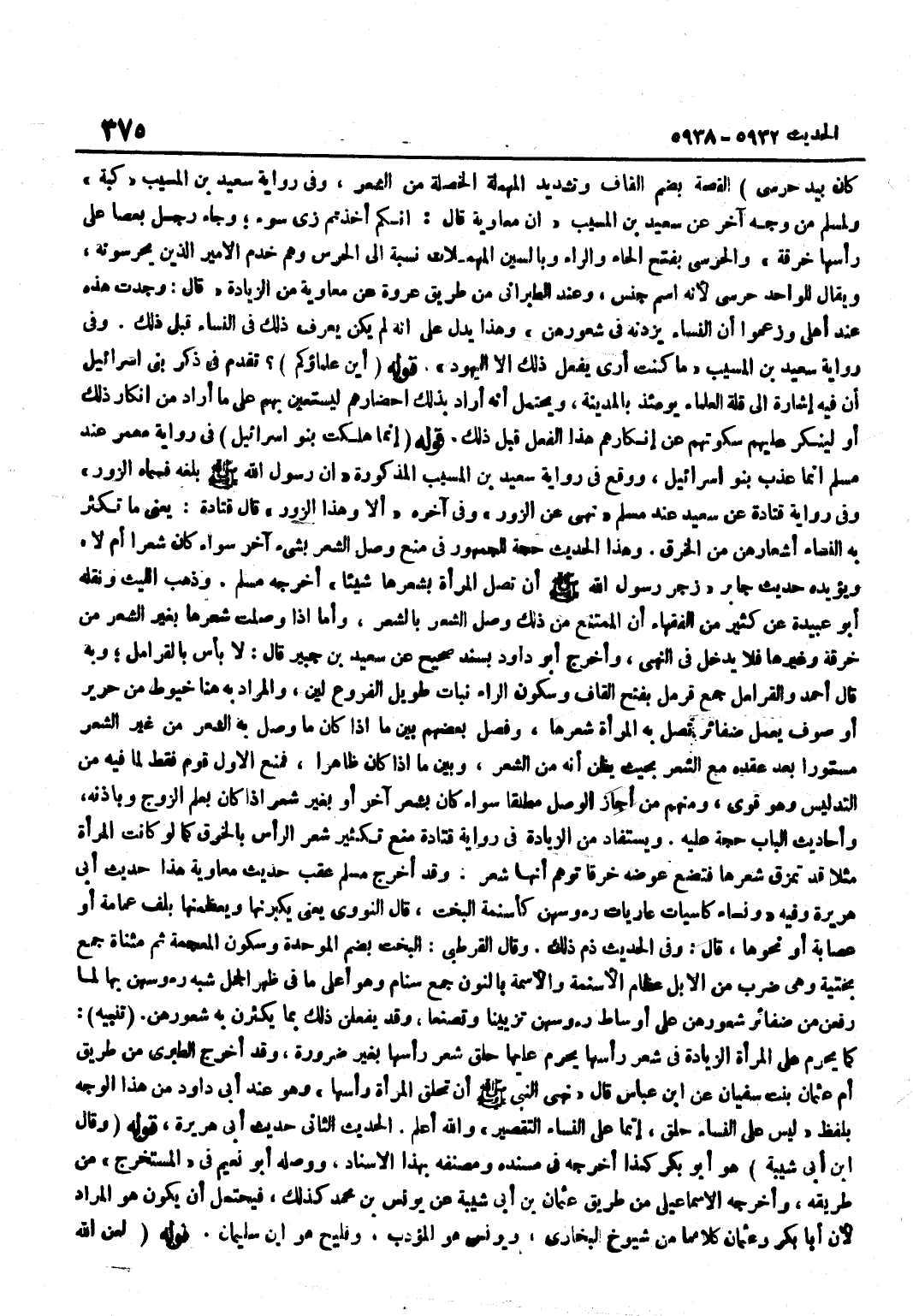 كَانَ بِيَدِ حَرَسِيٍّ الْقُصَّةُ بِضَمِّ الْقَافِ وَتَشْدِيدِ الْمُهْمَلَةِ الْخُصْلَةُ مِنَ الشَّعْرِ وَفِي رِوَايَةِ سَعِيدِ بْنِ الْمُسَيَّبِ كُبَّةٌ وَلِمُسْلِمٍ مِنْ وَجْهٍ آخَرَ عَنْ سَعِيدِ بْنِ الْمُسَيَّبِ أَنَّ مُعَاوِيَةَ قَالَ إِنَّكُمْ أَخَذْتُمْ زِيَّ سُوءٍ وَجَاءَ رَجُلٌ بِعَصًا عَلَى رَأْسِهَا خِرْقَةٌ وَالْحَرَسِيُّ بِفَتْحِ الْحَاءِ وَالرَّاءِ وَبِالسِّينِ الْمُهْمَلَاتِ نِسْبَةٌ إِلَى الْحَرَسِ وَهُمْ خَدَمُ الْأَمِيرِ الَّذِينَ يَحْرُسُونَهُ وَيُقَالُ لِلْوَاحِدِ حَرَسِيٌّ لِأَنَّهُ اسْمُ جِنْسٍ وَعِنْدَ الطَّبَرَانِيِّ مِنْ طَرِيقِ عُرْوَةَ عَنْ مُعَاوِيَةَ مِنَ الزِّيَادَةِ قَالَ وَجَدْتُ هَذِهِ عِنْدَ أَهْلِي وَزَعَمُوا أَنَّ النِّسَاءَ يَزِدْنَهُ فِي شُعُورِهِنَّ وَهَذَا يَدُلُّ عَلَى أَنَّهُ لَمْ يَكُنْ يُعْرَفُ ذَلِكَ فِي النِّسَاءِ قَبْلَ ذَلِكَ وَفِي رِوَايَةِ سَعِيدِ بْنِ الْمُسَيَّبِ مَا كُنْتُ أَرَى يَفْعَلُ ذَلِكَ إِلَّا الْيَهُودُ قَوْلُهُ أَيْنَ عُلَمَاؤُكُمْ تَقَدَّمَ فِي ذِكْرِ بَنِي إِسْرَائِيلَ أَنَّ فِيهِ إِشَارَةً إِلَى قِلَّةِ الْعُلَمَاءِ يَوْمئِذٍ بِالْمَدِينَةِ وَيُحْتَمَلُ أَنَّهُ أَرَادَ بِذَلِكَ إِحْضَارَهُمْ لِيَسْتَعِينَ بِهِمْ عَلَى مَا أَرَادَ مِنْ إِنْكَارِ ذَلِكَ أَوْ لِيُنْكِرَ عَلَيْهِمْ سُكُوتَهُمْ عَنْ إِنْكَارِهِمْ هَذَا الْفِعْلَ قَبْلَ ذَلِكَ قَوْلُهُ إِنَّمَا هَلَكَتْ بَنُو إِسْرَائِيلَ فِي رِوَايَةِ مَعْمَرٍ عِنْدَ مُسْلِمٍ إِنَّمَا عُذِّبَ بَنُو إِسْرَائِيلَ وَوَقَعَ فِي رِوَايَةِ سَعِيدِ بْنِ الْمُسَيَّبِ الْمَذْكُورَةِ أَنَّ رَسُولَ اللَّهِ صَلَّى اللَّهُ عَلَيْهِ وَسَلَّمَ بَلَغَهُ فَسَمَّاهُ الزُّورَ وَفِي رِوَايَةِ قَتَادَةَ عَنْ سَعِيدٍ عِنْدَ مُسْلِمٍ نَهَى عَنِ الزُّورِ وَفِي آخِرِهِ أَلَا وَهَذَا الزُّورُ قَالَ قَتَادَةُ يَعْنِي مَا تُكْثِرُ بِهِ النِّسَاءُ أَشْعَارَهُنَّ مِنَ الْخِرَقِ وَهَذَا الْحَدِيثُ حُجَّةٌ لِلْجُمْهُورِ فِي مَنْعِ وَصْلِ الشَّعْرِ بِشَيْءٍ آخَرَ سَوَاءٌ كَانَ شَعْرًا أَمْ لَا وَيُؤَيِّدُهُ حَدِيثُ جَابِرٍ زَجَرَ رَسُولُ اللَّهِ صَلَّى اللَّهُ عَلَيْهِ وَسَلَّمَ أَنْ تَصِلَ الْمَرْأَةُ بِشَعْرِهَا شَيْئًا أَخْرَجَهُ مُسْلِمٌ وَذَهَبَ اللَّيْثُ وَنَقَلَهُ أَبُو عُبَيْدَةَ عَنْ كَثِيرٍ مِنَ الْفُقَهَاءِ أَنَّ الْمُمْتَنِعَ مِنْ ذَلِكَ وَصْلُ الشَّعْرِ بِالشَّعْرِ وَأَمَّا إِذَا وَصَلَتْ شَعْرَهَا بِغَيْرِ الشَّعْرِ مِنْ خِرْقَةٍ وَغَيْرِهَا فَلَا يَدْخُلُ فِي النَّهْيِ وَأَخْرَجَ أَبُو دَاوُدَ بِسَنَدٍ صَحِيحٍ عَنْ سَعِيدِ بْنِ جُبَيْرٍ قَالَ لَا بَأْسَ بِالْقَرَامِلِ وَبِهِ قَالَ أَحْمَدُ وَالْقَرَامِلُ جَمْعُ قَرْمَلٍ بِفَتْحِ الْقَافِ وَسُكُونِ الرَّاءِ نَبَاتٌ طَوِيلُ الْفُرُوعِ لَيِّنٌ وَالْمُرَادُ بِهِ هُنَا خُيُوطٌ مِنْ حَرِيرٍ أَوْ صُوفٍ يُعْمَلُ ضَفَائِرَ تَصِلُ بِهِ الْمَرْأَةُ شَعْرَهَا وَفَصَلَ بَعْضُهُمْ بَيْنَ مَا إِذا كَانَ مَا وصل بِهِ الشّعْر من غير الشّعْر مَسْتُورا بعد عقده مَعَ الشّعْر بِحَيْثُ يظنّ أَنه من الشّعْر وَبَين مَا إِذا كَانَ ظَاهرا فَمنع الأول قوم فَقَطْ لِمَا فِيهِ مِنَ التَّدْلِيسِ وَهُوَ قَوِيٌّ وَمِنْهُمْ مَنْ أَجَازَ الْوَصْلَ مُطْلَقًا سَوَاءٌ كَانَ بِشَعْرٍ آخَرَ أَوْ بِغَيْرِ شَعْرٍ إِذَا كَانَ بِعِلْمِ الزَّوْجِ وَبِإِذْنِهِ وَأَحَادِيثُ الْبَابِ حُجَّةٌ عَلَيْهِ وَيُسْتَفَادُ مِنَ الزِّيَادَةِ فِي رِوَايَةِ قَتَادَةَ مَنْعَ تَكْثِيرِ شَعْرِ الرَّأْسِ بِالْخِرَقِ كَمَا لَوْ كَانَتِ الْمَرْأَةُ مَثَلًا قَدْ تَمَزَّقَ شَعْرُهَا فَتَضَعُ عِوَضَهُ خِرَقًا تُوهِمُ أَنَّهَا شَعْرٌ وَقَدْ أَخْرَجَ مُسْلِمٌ عَق