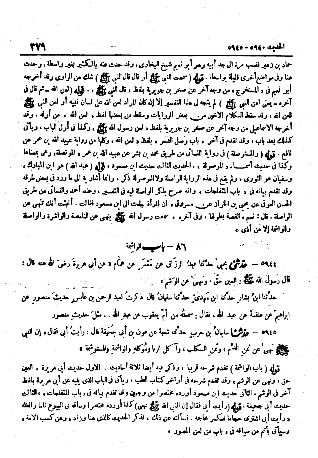 تَقَدَّمَ شَرْحُهُ قَرِيبًا وَذَكَرَ فِيهِ أَيْضًا ثَلَاثَةَ أَحَادِيثَ الْأَوَّلُ حَدِيثُ أَبِي هُرَيْرَةَ الْعَيْنُ حَقٌّ وَنَهَى عَنِ الْوَشْمِ وَقَدْ تَقَدَّمَ شَرْحُهُ فِي أَوَاخِرِ كِتَابِ الطِّبِّ وَيَأْتِي فِي الْبَابِ الَّذِي يَلِيهِ عَنْ أَبِي هُرَيْرَةَ بِلَفْظ آخر فِي الوشم الثَّانِي حَدِيث بن مَسْعُودٍ أَوْرَدَهُ مُخْتَصَرًا مِنْ وَجْهَيْنِ وَقَدْ تَقَدَّمَ بَيَانُهُ فِي بَابِ الْمُتَفَلِّجَاتِ الثَّالِثُ حَدِيثُ أَبِي جُحَيْفَةَ