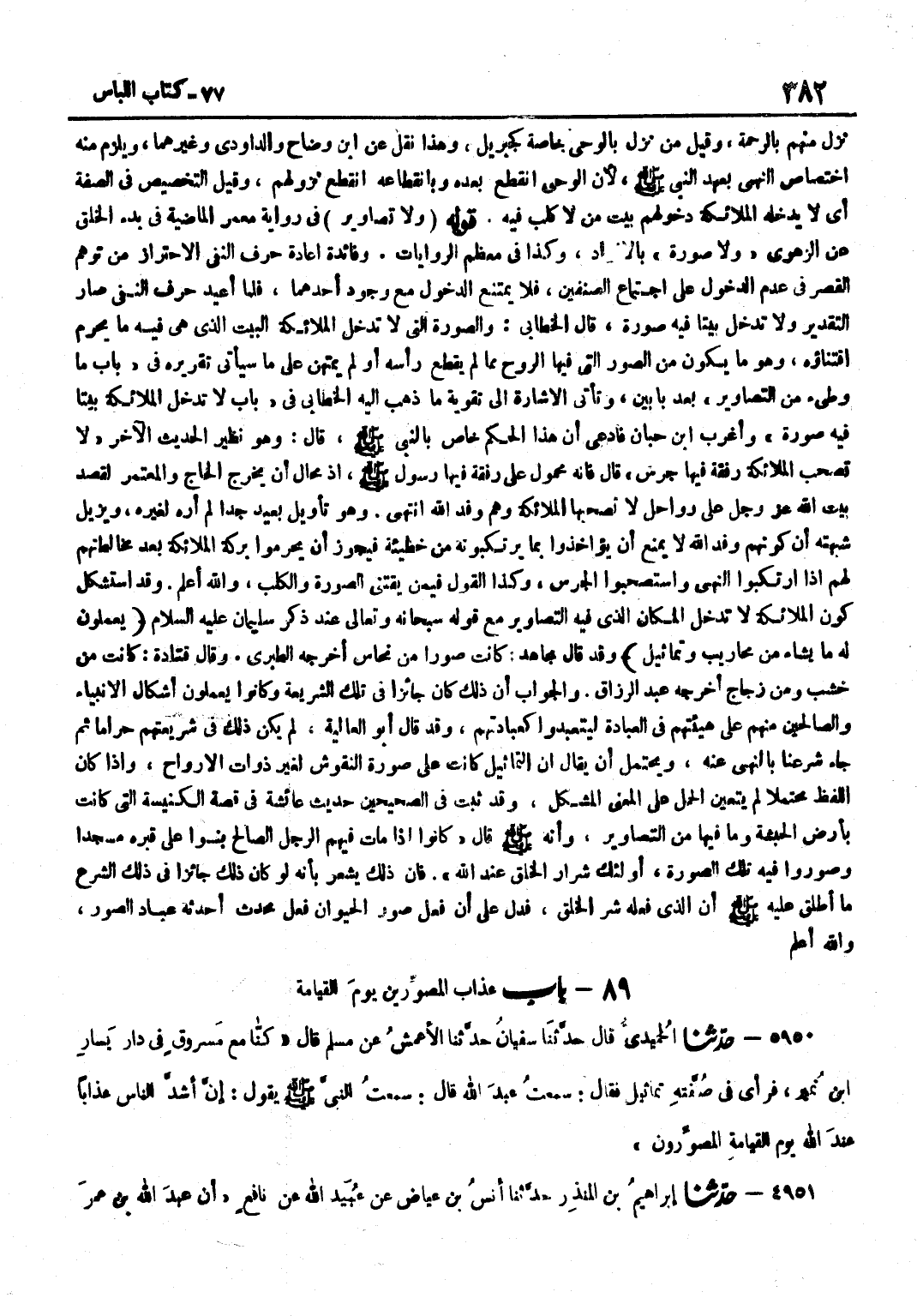 نَزَلَ مِنْهُمْ بِالرَّحْمَةِ وَقِيلَ مَنْ نَزَلَ بِالْوَحْيِ خَاصَّة كجبريل وَهَذَا نقل عَن بن وَضَّاحٍ وَالدَّاوُدِيُّ وَغَيْرِهِمَا وَيَلْزَمُ مِنْهُ اخْتِصَاصُ النَّهْيِ بِعَهْدِ النَّبِيِّ صَلَّى اللَّهُ عَلَيْهِ وَسَلَّمَ لِأَنَّ الْوَحْيَ انْقَطَعَ بَعْدَهُ وَبِانْقِطَاعِهِ انْقَطَعَ نُزُولُهُمْ وَقِيلَ التَّخْصِيصُ فِي الصِّفَةِ أَيْ لَا يَدْخُلُهُ الْمَلَائِكَةُ دُخُولَهُمْ بَيْتَ مَنْ لَا كَلْبَ فِيهِ قَوْلُهُ وَلَا تَصَاوِيرُ فِي رِوَايَةِ مَعْمَرٍ الْمَاضِيَةِ فِي بَدْءِ الْخَلْقِ عَنِ الزُّهْرِيِّ وَلَا صُورَةٌ بِالْإِفْرَادِ وَكَذَا فِي مُعْظَمِ الرِّوَايَاتِ وَفَائِدَةُ إِعَادَةِ حَرْفِ النَّفْيِ الِاحْتِرَازُ مِنْ تَوَهُّمِ الْقَصْرِ فِي عَدَمِ الدُّخُولِ عَلَى اجْتِمَاعِ الصِّنْفَيْنِ فَلَا يَمْتَنِعُ الدُّخُولُ مَعَ وُجُودِ أَحَدِهِمَا فَلَمَّا أُعِيدَ حَرْفُ النَّفْيِ صَارَ التَّقْدِيرُ وَلَا تَدْخُلُ بَيْتًا فِيهِ صُورَةٌ قَالَ الْخَطَّابِيُّ وَالصُّورَةُ الَّتِي لَا تُدْخِلُ الْمَلَائِكَةَ الْبَيْتَ الَّذِي هِيَ فِيهِ مَا يَحْرُمُ اقْتِنَاؤُهُ وَهُوَ مَا يَكُونُ مِنَ الصُّوَرِ الَّتِي فِيهَا الرُّوحُ مِمَّا لَمْ يُقْطَعْ رَأْسُهُ أَوْ لَمْ يُمْتَهَنْ عَلَى مَا سَيَأْتِي تَقْرِيرُهُ فِي بَابِ مَا وطيء مِنَ التَّصَاوِيرِ بَعْدَ بَابَيْنِ وَتَأْتِي الْإِشَارَةُ إِلَى تَقْوِيَةِ مَا ذَهَبَ إِلَيْهِ الْخَطَّابِيُّ فِي بَابِ لَا تَدْخُلُ الْمَلَائِكَةُ بَيْتًا فِيهِ صُورَةٌ وَأَغْرَبَ بن حِبَّانَ فَادَّعَى أَنَّ هَذَا الْحُكْمَ خَاصٌّ بِالنَّبِيِّ صَلَّى اللَّهُ عَلَيْهِ وَسَلَّمَ قَالَ وَهُوَ نَظِيرُ الْحَدِيثِ الْآخَرِ لَا تَصْحَبُ الْمَلَائِكَةُ رُفْقَةً فِيهَا جَرَسٌ قَالَ فَإِنَّهُ مَحْمُولٌ عَلَى رُفْقَةٍ فِيهَا رَسُولِ اللَّهِ صَلَّى اللَّهُ عَلَيْهِ وَسَلَّمَ إِذْ مُحَالٌ أَنْ يَخْرُجَ الْحَاجُّ وَالْمُعْتَمِرُ لِقَصْدِ بَيْتِ اللَّهِ عَزَّ وَجَلَّ عَلَى رَوَاحِلَ لَا تَصْحَبُهَا الْمَلَائِكَةُ وَهُمْ وَفْدُ اللَّهِ انْتَهَى وَهُوَ تَأْوِيلٌ بَعِيدٌ جِدًّا لَمْ أَرَهُ لِغَيْرِهِ وَيُزِيلُ شُبْهَتَهُ أَنَّ كَوْنَهُمْ وَفْدُ اللَّهِ لَا يَمْنَعُ أَنْ يُؤَاخَذُوا بِمَا يَرْتَكِبُونَهُ مِنْ خَطِيئَةٍ فَيَجُوزُ أَنْ يُحْرَمُوا بَرَكَةَ الْمَلَائِكَةِ بَعْدَ مُخَالَطَتِهِمْ لَهُمْ إِذَا ارْتَكَبُوا النَّهْيَ وَاسْتَصْحَبُوا الْجَرَسَ وَكَذَا الْقَوْلُ فِيمَنْ يَقْتَنِي الصُّورَةَ وَالْكَلْبَ وَاللَّهُ أَعْلَمُ وَقَدِ اسْتَشْكَلَ كَوْنُ الْمَلَائِكَةِ لَا تَدْخُلُ الْمَكَانَ الَّذِي فِيهِ التَّصَاوِيرُ مَعَ قَوْلِهِ سُبْحَانَهُ وَتَعَالَى عِنْدَ ذِكْرِ سُلَيْمَانَ عَلَيْهِ السَّلَامُ يَعْمَلُونَ لَهُ مَا يَشَاءُ من محاريب وتماثيل وَقَدْ قَالَ مُجَاهِدٌ كَانَتْ صُوَرًا مِنْ نُحَاسٍ أَخْرَجَهُ الطَّبَرِيُّ وَقَالَ قَتَادَةُ كَانَتْ مِنْ خَشَبٍ وَمِنْ زُجَاجٍ أَخْرَجَهُ عَبْدُ الرَّزَّاقِ وَالْجَوَابُ أَنَّ ذَلِكَ كَانَ جَائِزًا فِي تِلْكَ الشَّرِيعَةِ وَكَانُوا يَعْمَلُونَ أَشْكَالَ الْأَنْبِيَاءِ وَالصَّالِحِينَ مِنْهُمْ عَلَى هَيْئَتِهِمْ فِي الْعِبَادَةِ لِيَتَعَبَّدُوا كَعِبَادَتِهِمْ وَقَدْ قَالَ أَبُو الْعَالِيَةِ لَمْ يَكُنْ ذَلِكَ فِي شَرِيعَتِهِمْ حَرَامًا ثُمَّ جَاءَ شَرْعُنَا بِالنَّهْيِ عَنْهُ وَيُحْتَمَلُ أَنْ يُقَالَ إِنَّ التَّمَاثِيلَ كَانَتْ عَلَى صُورَةِ النُّقُوشِ لِغَيْرِ ذَوَاتِ الْأَرْوَاحِ وَإِذَا كَانَ اللَّفْظُ مُحْتَمَلًا لَمْ يَتَعَيَّنِ الْحَمْلُ عَلَى الْمَعْنَى الْمُشْكِلِ وَقَدْ ثَبَتَ فِي الصَّحِيحَيْنِ حَدِيثُ عَائِشَةَ فِي قِصَّةِ الْكَنِيسَةِ الَّتِي كَانَتْ بِأَرْضِ الْحَبَشَة