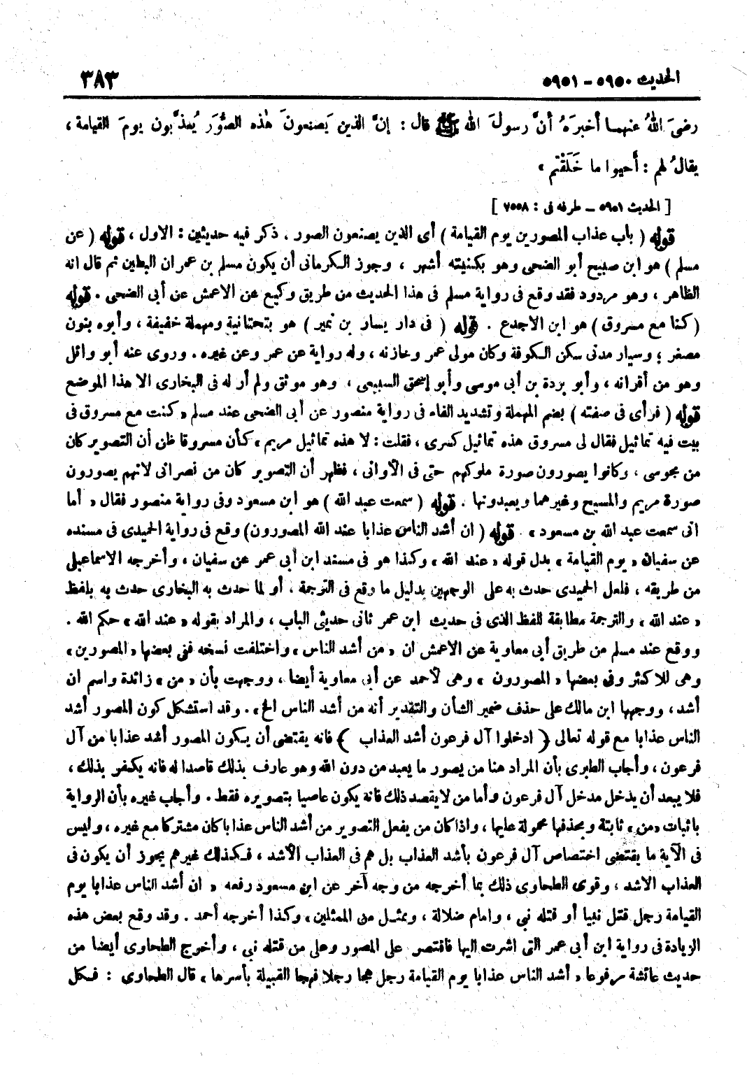 [5950] قَوْله عَن مُسلم هُوَ بن صُبَيْحٍ أَبُو الضُّحَى وَهُوَ بِكُنْيَتِهِ أَشْهَرُ وَجَوَّزَ الْكِرْمَانِيُّ أَنْ يَكُونَ مُسْلِمَ بْنَ عِمْرَانَ الْبَطِينَ ثُمَّ قَالَ إِنَّهُ الظَّاهِرُ وَهُوَ مَرْدُودٌ فَقَدْ وَقَعَ فِي رِوَايَةِ مُسْلِمٍ فِي هَذَا الْحَدِيثِ مِنْ طَرِيقِ وَكِيعٍ عَنِ الْأَعْمَشِ عَنْ أَبِي الضُّحَى قَوْله كُنَّا مَعَ مَسْرُوق هُوَ بن الْأَجْدَعِ قَوْلُهُ فِي دَارِ يَسَارِ بْنِ نُمَيْرٍ هُوَ بِتَحْتَانِيَّةٍ وَمُهْمَلَةٍ خَفِيفَةٍ وَأَبُوهُ بِنُونٍ مُصَغَّرٌ وسيار مَدَنِيٌّ سَكَنَ الْكُوفَةَ وَكَانَ مَوْلَى عُمَرَ وَخَازِنَهُ وَلَهُ رِوَايَةٌ عَنْ عُمَرَ وَعَنْ غَيْرِهِ وَرَوَى عَنْهُ أَبُو وَائِلٍ وَهُوَ مِنْ أَقْرَانِهِ وَأَبُو بُرْدَةَ بْنُ أَبِي مُوسَى وَأَبُو إِسْحَاقَ السَّبِيعِيُّ وَهُوَ مُوَثَّقٌ وَلَمْ أَرَ لَهُ فِي الْبُخَارِيِّ إِلَّا هَذَا الْمَوْضِعُ قَوْلُهُ فَرَأَى فِي صُفَّتِهِ بِضَمِّ الْمُهْمَلَةِ وَتَشْدِيدِ الْفَاءِ فِي رِوَايَةِ مَنْصُورٍ عَنْ أَبِي الضُّحَى عِنْدَ مُسْلِمٍ كُنْتُ مَعَ مَسْرُوقٍ فِي بَيْتٍ فِيهِ تَمَاثِيلُ فَقَالَ لِي مَسْرُوقٌ هَذِهِ تَمَاثِيلُ كِسْرَى فَقُلْتُ لَا هَذِهِ تَمَاثِيلُ مَرْيَمَ كَأَنَّ مَسْرُوقًا ظَنَّ أَنَّ التَّصْوِيرَ كَانَ مِنْ مَجُوسِيٍّ وَكَانُوا يُصَوِّرُونَ صُورَةَ مُلُوكِهِمْ حَتَّى فِي الْأَوَانِي فَظَهَرَ أَنَّ التَّصْوِيرَ كَانَ مِنْ نَصْرَانِيٍّ لِأَنَّهُمْ يُصَوِّرُونَ صُورَةَ مَرْيَمَ وَالْمَسِيحِ وَغَيْرِهِمَا وَيَعْبُدُونَهَا قَوْلُهُ سَمِعْتُ عَبْدَ اللَّهِ هُوَ بن مَسْعُودٍ وَفِي رِوَايَةِ مَنْصُورٍ فَقَالَ أَمَا إِنِّي سَمِعْتُ عَبْدَ اللَّهِ بْنَ مَسْعُودٍ قَوْلُهُ إِنَّ أَشَدَّ النَّاسِ عَذَابًا عِنْدَ اللَّهِ الْمُصَوِّرُونَ وَقَعَ فِي رِوَايَةِ الْحُمَيْدِيِّ فِي مُسْنَدِهِ عَنْ سُفْيَانَ يَوْمَ الْقِيَامَةِ بَدَلَ قَوْلِهِ عِنْدَ اللَّهِ وَكَذَا هُوَ فِي مُسْند بن أبي عمر عَن سُفْيَان وَأخرجه الْإِسْمَاعِيلِيِّ مِنْ طَرِيقِهِ فَلَعَلَّ الْحُمَيْدِيَّ حَدَّثَ بِهِ عَلَى الْوَجْهَيْنِ بِدَلِيلِ مَا وَقَعَ فِي التَّرْجَمَةِ أَوْ لَمَّا حَدَّثَ بِهِ الْبُخَارِيُّ حَدَّثَ بِهِ بِلَفْظِ عِنْدَ اللَّهِ وَالتَّرْجَمَةُ مُطَابِقَةٌ لِلَّفْظِ الَّذِي فِي حَدِيث بن عُمَرَ ثَانِي حَدِيثَيِ الْبَابِ وَالْمُرَادُ بِقَوْلِهِ عِنْدَ اللَّهِ حُكْمُ اللَّهِ وَوَقَعَ عِنْدَ مُسْلِمٌ مِنْ طَرِيقِ أَبِي مُعَاوِيَةَ عَنِ الْأَعْمَشِ أَنَّ مِنْ أَشد النَّاس وَاخْتلفت نَسْخُهُ فَفِي بَعْضِهَا الْمُصَوِّرِينَ وَهِيَ لِلْأَكْثَرِ وَفِي بَعْضِهَا الْمُصَوِّرُونَ وَهِيَ لِأَحْمَدَ عَنْ أَبِي مُعَاوِيَةَ أَيْضًا وَوُجِّهَتْ بِأَنَّ مِنْ زَائِدَةٌ وَاسْمُ إِنَّ أَشد ووجهها بن مَالِكٍ عَلَى حَذْفِ ضَمِيرِ الشَّأْنِ وَالتَّقْدِيرُ أَنَّهُ مِنْ أَشَدِّ النَّاسِ إِلَخْ وَقَدِ اسْتَشْكَلَ كَوْنُ الْمُصَوِّرِ أَشَدَّ النَّاسِ عَذَابًا مَعَ قَوْلِهِ تَعَالَى ادخُلُوا آل فِرْعَوْن أَشد الْعَذَاب فَإِنَّهُ يَقْتَضِي أَنْ يَكُونَ الْمُصَوِّرُ أَشَدَّ عَذَابًا مِنْ آلِ فِرْعَوْنَ وَأَجَابَ الطَّبَرِيُّ بِأَنَّ الْمُرَادَ هُنَا مَنْ يُصَوِّرُ مَا يُعْبَدُ مِنْ دُونِ اللَّهِ وَهُوَ عَارِفٌ بِذَلِكَ قَاصِدًا لَهُ فَإِنَّهُ يَكْفُرُ بِذَلِكَ فَلَا يَبْعُدُ أَنْ يُدْخَلَ مُدْخَلَ آلِ فِرْعَوْنَ وَأَمَّا مَنْ لَا يَقْصِدُ ذَلِكَ فَإِنَّهُ يَكُونُ عَاصِيًا بِتَصْوِيرِهِ فَقَطْ وَأَجَابَ غَيْرُهُ بِأَنَّ الرِّوَايَةَ بِإِثْبَاتِ مِنْ ثَابِتَةٌ وَبِحَذْفِهَا مَحْمُولَةٌ عَلَيْهَا وَإِذَا كَانَ مَنْ يَفْعَلُ التَّصْوِيرَ مِنْ أَشَدِّ النَّاسِ عَذَابًا كَانَ مُشْتَرِكًا مَعَ غَيْرِهِ وَلَيْسَ