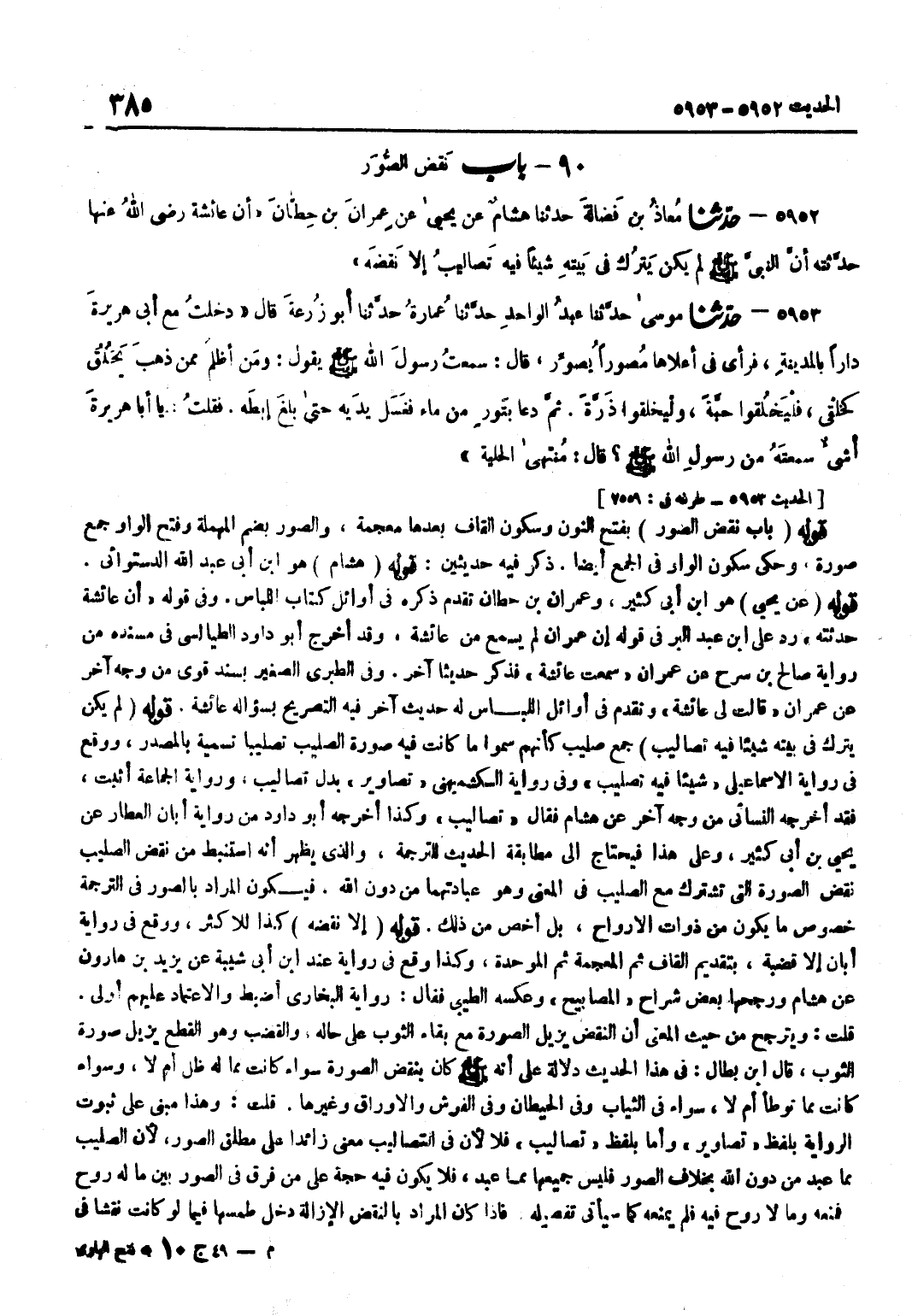 [5952] قَوْلُهُ هِشَامٌ هُوَ بن أَبِي عَبْدِ اللَّهِ الدَّسْتَوَائِيُّ قَوْلُهُ عَنْ يَحْيَى هُوَ بن أَبِي كَثِيرٍ وَعِمْرَانُ بْنُ حِطَّانَ تَقَدَّمَ ذِكْرُهُ فِي أَوَائِلِ كِتَابِ اللِّبَاسِ وَفِي قَوْلِهِ إِنَّ عَائِشَة حدثته رد على بن عَبْدِ الْبَرِّ فِي قَوْلِهِ إِنَّ عِمْرَانَ لَمْ يَسْمَعْ مِنْ عَائِشَةَ وَقَدْ أَخْرَجَ أَبُو دَاوُدَ الطَّيَالِسِيُّ فِي مُسْنَدِهِ مِنْ رِوَايَةِ صَالِحِ بْنِ سَرْحٍ عَنْ عِمْرَانَ سَمِعْتُ عَائِشَةَ فَذَكَرَ حَدِيثًا آخَرَ وَفِي الطَّبَرِيِّ الصَّغِيرِ بِسَنَدٍ قَوِيٍّ مِنْ وَجْهٍ آخَرَ عَنْ عِمْرَانَ قَالَتْ لِي عَائِشَةُ وَتَقَدَّمَ فِي أَوَائِلِ اللِّبَاسِ لَهُ حَدِيثٌ آخَرُ فِيهِ التَّصْرِيحُ بِسُؤَالِهِ عَائِشَةَ قَوْلُهُ لَمْ يَكُنْ يَتْرُكُ فِي بَيْتِهِ شَيْئًا فِيهِ تَصَالِيبُ جَمْعُ صَلِيبٍ كَأَنَّهُمْ سَمَّوْا مَا كَانَتْ فِيهِ صُورَةُ الصَّلِيبِ تَصْلِيبًا تَسْمِيَةً بِالْمَصْدَرِ وَوَقَعَ فِي رِوَايَةِ الْإِسْمَاعِيلِيِّ شَيْئًا فِيهِ تَصْلِيبٌ وَفِي رِوَايَةِ الْكُشْمِيهَنِيِّ تصاوير بدل تصاليب وَرِوَايَة الْجَمَاعَة أثبت فقد أَخْرَجَهُ النَّسَائِيُّ مِنْ وَجْهٍ آخَرَ عَنْ هِشَامٍ فَقَالَ تَصَالِيبُ وَكَذَا أَخْرَجَهُ أَبُو دَاوُدَ مِنْ رِوَايَةِ أَبَانٍ الْعَطَّارِ عَنْ يَحْيَى بْنِ أَبِي كَثِيرٍ وَعَلَى هَذَا فَيُحْتَاجُ إِلَى مُطَابَقَةِ الْحَدِيثِ لِلتَّرْجَمَةِ وَالَّذِي يَظْهَرُ أَنَّهُ اسْتَنْبَطَ مِنْ نَقْضِ الصَّلِيبِ نَقْضَ الصُّورَةِ الَّتِي تَشْتَرِكُ مَعَ الصَّلِيبِ فِي الْمَعْنَى وَهُوَ عِبَادَتُهُمَا مِنْ دُونِ اللَّهِ فَيَكُونُ الْمُرَادُ بِالصُّوَرِ فِي التَّرْجَمَةِ خُصُوصَ مَا يَكُونُ مِنْ ذَوَاتِ الْأَرْوَاحِ بَلْ أَخَصُّ مِنْ ذَلِكَ قَوْلُهُ إِلَّا نَقَضَهُ كَذَا لِلْأَكْثَرِ وَوَقَعَ فِي رِوَايَةِ أَبَانَ إِلَّا قَضَبَهُ بِتَقْدِيمِ الْقَافِ ثُمَّ الْمُعْجَمَةُ ثُمَّ الْمُوَحَّدَةُ وَكَذَا وَقَعَ فِي رِوَايَة عِنْد بْنِ أَبِي شَيْبَةَ عَنْ يَزِيدَ بْنِ هَارُونَ عَنْ هِشَامٍ وَرَجَّحَهَا بَعْضُ شُرَّاحِ الْمَصَابِيحِ وَعَكَسَهُ الطِّيبِيُّ فَقَالَ رِوَايَةُ الْبُخَارِيِّ أَضْبَطُ وَالِاعْتِمَادُ عَلَيْهِمْ أَوْلَى قُلْتُ وَيَتَرَجَّحُ مِنْ حَيْثُ الْمَعْنَى أَنَّ النَّقْضَ يُزِيلُ الصُّورَةَ مَعَ بَقَاءِ الثَّوْبِ عَلَى حَالِهِ وَالْقَضْبُ وَهُوَ الْقَطْعُ يُزِيلُ صُورَةَ الثَّوْبِ قَالَ بن بَطَّالٍ فِي هَذَا الْحَدِيثِ دَلَالَةٌ عَلَى أَنَّهُ صَلَّى اللَّهُ عَلَيْهِ وَسَلَّمَ كَانَ يَنْقُضُ الصُّورَةَ سَوَاءٌ كَانَتْ مِمَّا لَهُ ظِلٌّ أَمْ لَا وَسَوَاءٌ كَانَتْ مِمَّا تُوطَأُ أَمْ لَا سَوَاءٌ فِي الثِّيَابِ وَفِي الْحِيطَانِ وَفِي الْفُرُشِ وَالْأَوْرَاقِ وَغَيْرِهَا قُلْتُ وَهَذَا مَبْنِيٌّ عَلَى ثُبُوتِ الرِّوَايَةِ بِلَفْظِ تَصَاوِيرَ وَأَمَّا بِلَفْظِ تَصَالِيبَ فَلَا لِأَنَّ فِي التَّصَالِيبَ مَعْنًى زَائِدًا عَلَى مُطْلَقِ الصُّوَرِ لِأَنَّ الصَّلِيبَ مِمَّا عُبِدَ مِنْ دُونِ اللَّهِ بِخِلَافِ الصُّوَرِ فَلَيْسَ جَمِيعُهَا مِمَّا عُبِدَ فَلَا يَكُونُ فِيهِ حُجَّةٌ عَلَى مَنْ فَرَّقَ فِي الصُّوَرِ بَيْنَ مَا لَهُ رُوحٌ فَمَنَعَهُ وَمَا لَا رُوحَ فِيهِ فَلَمْ يَمْنَعْهُ كَمَا سَيَأْتِي تَفْصِيلُهُ فَإِذَا كَانَ الْمُرَادُ بِالنَّقْضِ الْإِزَالَةَ دَخَلَ طَمْسُهَا فِيمَا لَوْ كَانَتْ نَقْشًا فِي