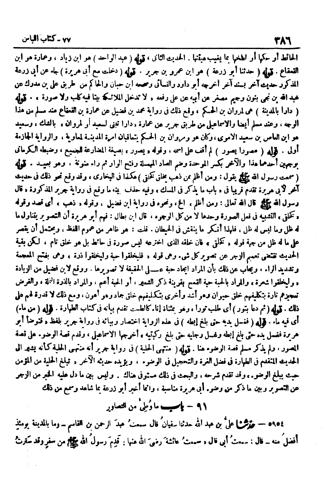 [5953] قَوْلُهُ عَبْدُ الْوَاحِد هُوَ بن زِيَاد وَعمارَة هُوَ بن الْقَعْقَاع قَوْله حَدثنَا أَبُو زرْعَة هُوَ بن عَمْرِو بْنِ جَرِيرٍ قَوْلُهُ دَخَلْتُ مَعَ أَبِي هُرَيْرَةَ جَاءَ عَنْ أَبِي زُرْعَةَ الْمَذْكُورِ حَدِيثٌ آخَرُ بِسَنَدٍ آخَرَ أَخْرَجَهُ أَبُو دَاوُدَ وَالنَّسَائِيُّ وَصَححهُ بن حِبَّانَ وَالْحَاكِمُ مِنْ طَرِيقِ عَلِيِّ بْنِ مُدْرِكٍ عَنْ عَبْدِ اللَّهِ بْنِ نُجَيٍّ بِنُونٍ وَجِيمٍ مُصَغَّرٌ عَنْ أَبِيهِ عَنْ عَلِيٍّ رَفَعَهُ لَا تَدْخُلُ الْمَلَائِكَةُ بَيْتًا فِيهِ كَلْبٌ وَلَا صُورَةٌ قَوْلُهُ دَارًا بِالْمَدِينَةِ هِيَ لِمَرْوَانَ بْنِ الْحَكَمِ وَقَعَ ذَلِكَ فِي رِوَايَةِ مُحَمَّدِ بْنِ فُضَيْلٍ عَنْ عُمَارَةَ بْنِ الْقَعْقَاعِ عِنْدَ مُسْلِمٍ مِنْ هَذَا الْوَجْهِ وَعِنْدَ مُسْلِمٍ أَيْضًا وَالْإِسْمَاعِيلِيِّ مِنْ طَرِيقِ جَرِيرٍ عَنْ عُمَارَةَ دَارًا تُبْنَى لِسَعِيدٍ أَو لمروان بِالشَّكِّ وَسَعِيد هُوَ بن الْعَاصِ بْنِ سَعِيدٍ الْأُمَوِيُّ وَكَانَ هُوَ وَمَرْوَانُ بْنُ الْحَكَمِ يَتَعَاقَبَانِ إِمْرَةَ الْمَدِينَةِ لِمُعَاوِيَةَ وَالرِّوَايَةُ الْجَازِمَةُ أَوْلَى قَوْلُهُ مُصَوِّرًا يُصَوِّرُ لَمْ أَقِفْ عَلَى اسْمِهِ وَقَوْلُهُ يُصَوِّرُ بِصِيغَةِ الْمُضَارَعَةِ لِلْجَمِيعِ وَضَبَطَهُ الْكِرْمَانِيُّ بِوَجْهَيْنِ أَحَدُهُمَا هَذَا وَالْآخَرُ بِكَسْرِ الْمُوَحَّدَةِ وَضَمِّ الصَّادِ الْمُهْمَلَةِ وَفَتْحِ الْوَاوِ ثُمَّ رَاءٍ مُنَوَّنَةٍ وَهُوَ بَعِيدٌ قَوْلُهُ سَمِعْتُ رَسُولَ اللَّهِ صَلَّى اللَّهُ عَلَيْهِ وَسَلَّمَ يَقُولُ وَمَنْ أَظْلَمُ مِمَّنْ ذَهَبَ يَخْلُقُ كَخَلْقِي هَكَذَا فِي الْبُخَارِيِّ وَقَدْ وَقَعَ نَحْوَ ذَلِكَ فِي حَدِيثٍ آخَرَ لِأَبِي هُرَيْرَةَ تَقَدَّمَ قَرِيبًا فِي بَابِ مَا يُذْكَرُ فِي الْمِسْكِ وَفِيهِ حَذْفٌ بَيَّنَهُ مَا وَقَعَ فِي رِوَايَةِ جَرِيرٍ الْمَذْكُورَةِ قَالَ رَسُولُ اللَّهِ صَلَّى اللَّهُ عَلَيْهِ وَسَلَّمَ قَالَ اللَّهُ تَعَالَى وَمَنْ أَظْلَمُ إِلَخْ وَنَحْوَهُ فِي رِوَايَة بن فُضَيْلٍ وَقَوْلُهُ ذَهَبَ أَيْ قَصَدَ وَقَوْلُهُ كَخَلْقِي التَّشْبِيهُ فِي فِعْلِ الصُّورَةِ وَحْدَهَا لَا مِنْ كل الْوُجُوه قَالَ بن بَطَّالٍ فَهِمَ أَبُو هُرَيْرَةَ أَنَّ التَّصْوِيرَ يَتَنَاوَلُ مَا لَهُ ظِلٌّ وَمَا لَيْسَ لَهُ ظِلٌّ فَلِهَذَا أَنْكَرَ مَا يُنْقَشُ فِي الْحِيطَانِ قُلْتُ هُوَ ظَاهِرٌ مِنْ عُمُومِ اللَّفْظِ وَيُحْتَمَلُ أَنْ يُقْصَرَ عَلَى مَا لَهُ ظِلٌّ مِنْ جِهَةِ قَوْلِهِ كَخَلْقِي فَإِنَّ خَلْقَهُ الَّذِي اخْتَرَعَهُ لَيْسَ صُورَةً فِي حَائِطٍ بَلْ هُوَ خَلْقٌ تَامٌّ لَكِنْ بَقِيَّةُ الْحَدِيثِ تَقْتَضِي تَعْمِيمَ الزَّجْرِ عَنْ تَصْوِيرِ كُلِّ شَيْءٍ وَهِيَ قَوْلُهُ فَلْيَخْلُقُوا حَبَّةً وَلْيَخْلُقُوا ذَرَّةً وَهِيَ بِفَتْحِ الْمُعْجَمَةِ وَتَشْدِيدِ الرَّاءِ وَيُجَابُ عَنْ ذَلِكَ بِأَنَّ الْمُرَادَ إِيجَادُ حَبَّةٍ عَلَى الْحَقِيقَةِ لَا تَصْوِيرُهَا وَوَقَعَ لِابْنِ فُضَيْلٍ من الزِّيَادَة وليخلقوا شَعْرَة وَالْمُرَادُ بِالْحَبَّةِ حَبَّةُ الْقَمْحِ بِقَرِينَةِ ذِكْرِ الشَّعِيرِ أَوِ الْحَبَّةُ أَعَمُّ وَالْمُرَادُ بِالذَّرَّةِ النَّمْلَةُ وَالْغَرَضُ تَعْجِيزُهُمْ تَارَةً بِتَكْلِيفِهِمْ خَلْقَ حَيَوَانٍ وَهُوَ أَشَدُّ وَأُخْرَى بِتَكْلِيفِهِمْ خَلْقَ جَمَادٍ وَهُوَ أَهْوَنُ وَمَعَ ذَلِكَ لَا قُدْرَةَ لَهُمْ عَلَى ذَلِكَ قَوْلُهُ ثُمَّ دَعَا بِتَوْرٍ أَيْ طَلَبَ تَوْرًا وَهُوَ بِمُثَنَّاةٍ إِنَاءٌ كَالطَّسْتِ تَقَدَّمَ بَيَانُهُ فِي كِتَابِ الطَّهَارَةِ قَوْلُهُ مِنْ مَاءٍ أَيْ فِيهِ مَاءٌ قَوْلُهُ فَغَسَلَ يَدَيْهِ حَتَّى بَلَغَ إِبْطَهُ فِي هَذِهِ الرِّوَايَةِ اخْتِصَ