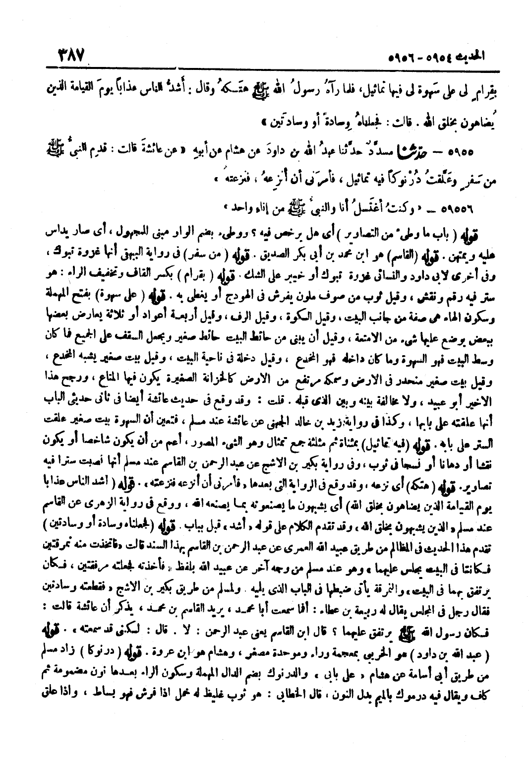 [5954] قَوْله الْقَاسِم هُوَ بن مُحَمَّدِ بْنِ أَبِي بَكْرٍ الصِّدِّيقِ قَوْلُهُ مِنْ سَفَرٍ فِي رِوَايَةِ الْبَيْهَقِيِّ أَنَّهَا غَزْوَةُ تَبُوكَ وَفِي أُخْرَى لِأَبِي دَاوُدَ وَالنَّسَائِيِّ غَزْوَةُ تَبُوكَ أَوْ خَيْبَرَ عَلَى الشَّكِّ قَوْلُهُ بِقِرَامٍ بِكَسْرِ الْقَافِ وَتَخْفِيفِ الرَّاءِ هُوَ سِتْرٌ فِيهِ رَقْمٌ وَنَقْشٌ وَقِيلَ ثَوْبٌ مِنْ صُوفٍ مُلَوَّنٍ يُفْرَشُ فِي الْهَوْدَجِ أَوْ يُغَطَّى بِهِ قَوْلُهُ عَلَى سَهْوَةٍ بِفَتْحِ الْمُهْمَلَةِ وَسُكُونِ الْهَاءِ هِيَ صِفَةٌ مِنْ جَانِبِ الْبَيْتِ وَقِيلَ الْكُوَّةُ وَقِيلَ الرَّفُّ وَقِيلَ أَرْبَعَةُ أَعْوَادٍ أَوْ ثَلَاثَةٌ يُعَارَضُ بَعْضُهَا بِبَعْضٍ يُوضَعُ عَلَيْهَا شَيْءٌ مِنَ الْأَمْتِعَةِ وَقِيلَ إِنْ يُبْنَى مِنْ حَائِطِ الْبَيْتِ حَائِطٌ صَغِيرٌ وَيُجْعَلُ السَّقْفُ عَلَى الْجَمِيعِ فَمَا كَانَ وَسَطَ الْبَيْتِ فَهُوَ السَّهْوَةُ وَمَا كَانَ دَاخِلَهُ فَهُوَ الْمِخْدَعُ وَقِيلَ دُخْلَةٌ فِي نَاحِيَةِ الْبَيْتِ وَقِيلَ بَيْتٌ صَغِيرٌ يُشْبِهُ الْمِخْدَعَ وَقِيلَ بَيْتٌ صَغِيرٌ مُنْحَدِرٌ فِي الْأَرْضِ وَسُمْكُهُ مُرْتَفِعٌ مِنَ الْأَرْضِ كَالْخِزَانَةِ الصَّغِيرَةِ يَكُونُ فِيهَا الْمَتَاعُ وَرَجَّحَ هَذَا الْأَخِيرَ أَبُو عُبَيْدٍ وَلَا مُخَالَفَةَ بَيْنَهُ وَبَيْنَ الَّذِي قَبْلَهُ قُلْتُ وَقَدْ وَقَعَ فِي حَدِيثِ عَائِشَةَ أَيْضًا فِي ثَانِي حَدِيثَيِ الْبَابِ أَنَّهَا عَلَّقَتْهُ عَلَى بَابِهَا وَكَذَا فِي رِوَايَةِ زَيْدِ بْنِ خَالِدٍ الْجُهَنِيِّ عَنْ عَائِشَةَ عِنْدَ مُسْلِمٍ فَتَعَيَّنَ أَنَّ السَّهْوَةَ بَيْتٌ صَغِيرٌ عَلَّقَتِ السِّتْرَ عَلَى بَابِهِ قَوْلُهُ فِيهِ تَمَاثِيلُ بِمُثَنَّاةٍ ثُمَّ مُثَلَّثَةٍ جَمْعُ تِمْثَالٍ وَهُوَ الشَّيْءُ الْمُصَوَّرُ أَعَمُّ مِنْ أَنْ يَكُونَ شَاخِصًا أَوْ يَكُونَ نَقْشًا أَوْ دِهَانًا أَوْ نَسْجًا فِي ثَوْبٍ وَفِي رِوَايَةِ بُكَيْرِ بْنِ الْأَشَجِّ عَنْ عَبْدِ الرَّحْمَنِ بْنِ الْقَاسِمِ عِنْدَ مُسْلِمٍ أَنَّهَا نَصَبَتْ سِتْرًا فِيهِ تَصَاوِيرُ قَوْلُهُ هَتَكَهُ أَيْ نَزَعَهُ وَقَدْ وَقَعَ فِي الرِّوَايَةِ الَّتِي بَعْدَهَا فَأَمَرَنِي أَنْ أَنْزِعَهُ فَنَزَعْتُهُ قَوْلُهُ أَشَدُّ النَّاسِ عَذَابًا يَوْمَ الْقِيَامَةِ الَّذِينَ يُضَاهُونَ بِخَلْقِ اللَّهِ أَيْ يُشَبِّهُونَ مَا يَصْنَعُونَهُ بِمَا يَصْنَعُهُ اللَّهُ وَوَقَعَ فِي رِوَايَةِ الزُّهْرِيِّ عَنِ الْقَاسِمِ عِنْدَ مُسْلِمٍ الَّذِينَ يُشَبِّهُونَ بِخَلْقِ اللَّهِ وَقَدْ تَقَدَّمَ الْكَلَامُ عَلَى قَوْلِهِ أَشَدُّ قَبْلُ بِبَابٍ قَوْلُهُ فَجَعَلْنَاهُ وِسَادَةً أَوْ وِسَادَتَيْنِ تَقَدَّمَ هَذَا الْحَدِيثُ فِي الْمَظَالِمِ مِنْ طَرِيقِ عُبَيْدِ اللَّهِ الْعُمَرِيِّ عَنْ عَبْدِ الرَّحْمَنِ بْنِ الْقَاسِمِ بِهَذَا السَّنَدِ قَالَتْ فَاتَّخَذْتُ مِنْهُ نُمْرُقَتَيْنِ فَكَانَتَا فِي الْبَيْتِ يَجْلِسُ عَلَيْهِمَا وَهُوَ عِنْدَ مُسْلِمٍ مِنْ وَجْهٍ آخَرَ عَنْ عُبَيْدِ اللَّهِ بِلَفْظِ فَأَخَذَتْهُ فَجَعَلَتْهُ مِرْفَقَتَيْنِ فَكَانَ يَرْتَفِقُ بِهِمَا فِي الْبَيْتِ وَالنُّمْرُقَةُ يَأْتِي ضَبْطُهَا فِي الْبَابِ الَّذِي يَلِيهِ وَلِمُسْلِمٍ مِنْ طَرِيقِ بُكَيْرِ بْنِ الْأَشَجِّ فَقَطَعَتْهُ وِسَادَتَيْنِ فَقَالَ رَجُلٌ فِي الْمَجْلِسِ يُقَالُ لَهُ رَبِيعَةُ بْنُ عَطَاءٍ أَفَمَا سَمِعْتَ أَبَا مُحَمَّدٍ يُرِيدُ الْقَاسِمَ بْنَ مُحَمَّدٍ يَذْكُرُ أَنَّ عَائِشَةَ قَالَتْ فَكَانَ رَسُولُ اللَّهِ صَلَّى اللَّهُ عَلَيْهِ وَسَلَّمَ يَرْتَفِقُ عَلَيْهِمَا قَالَ بن الْقَاسِمِ يَعْنِي عَبْدَ الرَّحْمَنِ لَا قَالَ لَكِنِّي قَدْ سَمِعْتُهُ