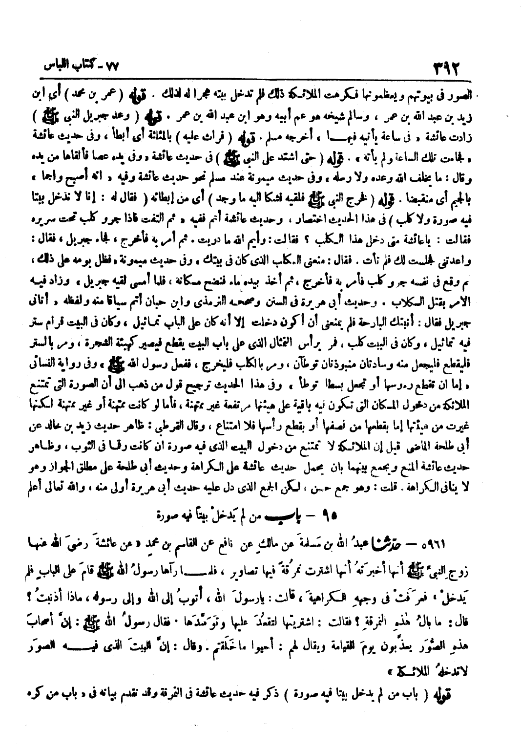 [5960] قَوْلُهُ عمر بن مُحَمَّد أَي بْنَ زَيْدِ بْنِ عَبْدِ اللَّهِ بْنِ عُمَرَ وَسَالِمٌ شَيْخُهُ هُوَ عَم أَبِيه وَهُوَ بن عَبْدِ اللَّهِ بْنِ عُمَرَ قَوْلُهُ وَعَدَ جِبْرِيلُ النَّبِيَّ صَلَّى اللَّهُ عَلَيْهِ وَسَلَّمَ زَادَتْ عَائِشَةُ فِي سَاعَةٍ يَأْتِيهِ فِيهَا أَخْرَجَهُ مُسْلِمٌ قَوْلُهُ فَرَاثَ عَلَيْهِ بِالْمُثَلَّثَةِ أَيْ أَبْطَأَ وَفِي حَدِيثِ عَائِشَةَ فَجَاءَتْ تِلْكَ السَّاعَةُ وَلَمْ يَأْتِهِ قَوْلُهُ حَتَّى اشْتَدَّ عَلَى النَّبِيِّ صَلَّى اللَّهُ عَلَيْهِ وَسَلَّمَ فِي حَدِيثِ عَائِشَةَ وَفِي يَدِهِ عَصًا فَأَلْقَاهَا مِنْ يَدِهِ وَقَالَ مَا يُخْلِفُ اللَّهُ وَعْدَهُ وَلَا رُسُلُهُ وَفِي حَدِيثِ مَيْمُونَةَ عِنْدَ مُسْلِمٍ نَحْوَ حَدِيثِ عَائِشَةَ وَفِيهِ أَنَّهُ أَصْبَحَ وَاجِمًا بِالْجِيمِ أَيْ مُنْقَبِضًا قَوْلُهُ فَخَرَجَ النَّبِيُّ صَلَّى اللَّهُ عَلَيْهِ وَسَلَّمَ فَلَقِيَهُ فَشَكَا إِلَيْهِ مَا وَجَدَ أَيْ مِنْ إِبْطَائِهِ فَقَالَ لَهُ إِنَّا لَا نَدْخُلُ بَيْتًا فِيهِ صُورَةٌ وَلَا كَلْبٌ فِي هَذَا الْحَدِيثِ اخْتِصَارٌ وَحَدِيثُ عَائِشَةَ أَتَمُّ فَفِيهِ ثُمَّ الْتَفَتَ فَإِذَا جِرْوُ كَلْبٍ تَحت سَرِيره فَقَالَت يَا عَائِشَةُ مَتَى دَخَلَ هَذَا الْكَلْبُ فَقَالَتْ وَايْمُ اللَّهِ مَا دَرَيْتُ ثُمَّ أَمَرَ بِهِ فَأُخْرِجَ فَجَاءَ جِبْرِيلُ فَقَالَ وَاعَدْتَنِي فَجَلَسْتُ لَكَ فَلَمْ تَأْتِ فَقَالَ مَنَعَنِي الْكَلْبُ الَّذِي كَانَ فِي بَيْتِكَ وَفِي حَدِيثِ مَيْمُونَةَ فَظَلَّ يَوْمَهُ عَلَى ذَلِكَ ثُمَّ وَقَعَ فِي نَفْسِهِ جِرْوُ كَلْبٍ فَأَمَرَ بِهِ فَأُخْرِجَ ثُمَّ أَخَذَ بِيَدِهِ مَاءً فَنَضَحَ مَكَانَهُ فَلَمَّا أَمْسَى لَقِيَهُ جِبْرِيلُ وَزَادَ فِيهِ الْأَمْرَ بِقَتْلِ الْكِلَابِ وَحَدِيثُ أَبِي هُرَيْرَة فِي السّنَن وَصَححهُ التِّرْمِذِيّ وبن حِبَّانَ أَتَمُّ سِيَاقًا مِنْهُ وَلَفْظُهُ أَتَانِي جِبْرِيلُ فَقَالَ أَتَيْتُكَ الْبَارِحَةَ فَلَمْ يَمْنَعْنِي أَنْ أَكُونَ دَخَلْتُ إِلَّا أَنَّهُ كَانَ عَلَى الْبَابِ تَمَاثِيلُ وَكَانَ فِي الْبَيْتِ قِرَامُ سِتْرٍ فِيهِ تَمَاثِيلُ وَكَانَ فِي الْبَيْتِ كَلْبٌ فَمُرْ بِرَأْسِ التِّمْثَالِ الَّذِي عَلَى بَابِ الْبَيْتِ يُقْطَعْ فَيَصِيرُ كَهَيْئَةِ الشَّجَرَة وَمر بالستر فليقطع فليجعل مِنْهُ وسادتان منبوذتان تُوطَآنِ وَمُرْ بِالْكَلْبِ فَلْيُخْرَجْ فَفَعَلَ رَسُولُ اللَّهِ صَلَّى اللَّهُ عَلَيْهِ وَسَلَّمَ وَفِي رِوَايَةِ النَّسَائِيِّ إِمَّا أَنْ تُقْطَعَ رُءُوسُهَا أَوْ تُجْعَلَ بُسُطًا تُوطَأُ وَفِي هَذَا الْحَدِيثِ تَرْجِيحُ قَوْلِ مَنْ ذَهَبَ إِلَى أَنَّ الصُّورَةَ الَّتِي تَمْتَنِعُ الْمَلَائِكَةُ مِنْ دُخُولِ الْمَكَانِ الَّتِي تَكُونُ فِيهِ بَاقِيَةٌ عَلَى هَيْئَتِهَا مُرْتَفِعَةٌ غَيْرُ مُمْتَهَنَةٍ فَأَمَّا لَوْ كَانَتْ مُمْتَهَنَةً أَوْ غَيْرَ مُمْتَهَنَةٍ لَكِنَّهَا غُيِّرَتْ مِنْ هَيْئَتِهَا إِمَّا بِقَطْعِهَا مِنْ نِصْفِهَا أَوْ بِقَطْعِ رَأْسِهَا فَلَا امْتِنَاعَ وَقَالَ الْقُرْطُبِيُّ ظَاهِرُ حَدِيثِ زَيْدِ بْنِ خَالِدٍ عَنْ أَبِي طَلْحَةَ الْمَاضِي قِيلَ إِنَّ الْمَلَائِكَةَ لَا تَمْتَنِعُ مِنْ دُخُولِ الْبَيْتِ الَّذِي فِيهِ صُورَةٌ إِنْ كَانَتْ رَقْمًا فِي الثَّوْبِ وَظَاهِرُ حَدِيثِ عَائِشَةَ الْمَنْعُ وَيُجْمَعُ بَيْنَهُمَا بِأَنْ يُحْمَلَ حَدِيثُ عَائِشَةَ عَلَى الْكَرَاهَةِ وَحَدِيثُ أَبِي طَلْحَةَ عَلَى مُطْلَقِ الْجَوَازِ وَهُوَ لَا يُنَافِي الْكَرَاهَةَ قُلْتُ وَهُوَ جَمْعٌ حَسَنٌ لَكِنَّ الْجَمْعَ الَّذِي دَلَّ عَلَيْهِ حَدِيثُ أَبِي هُرَيْرَةَ أَوْلَى مِنْهُ وَاللَّهُ تَعَالَى أَعْلَمُ