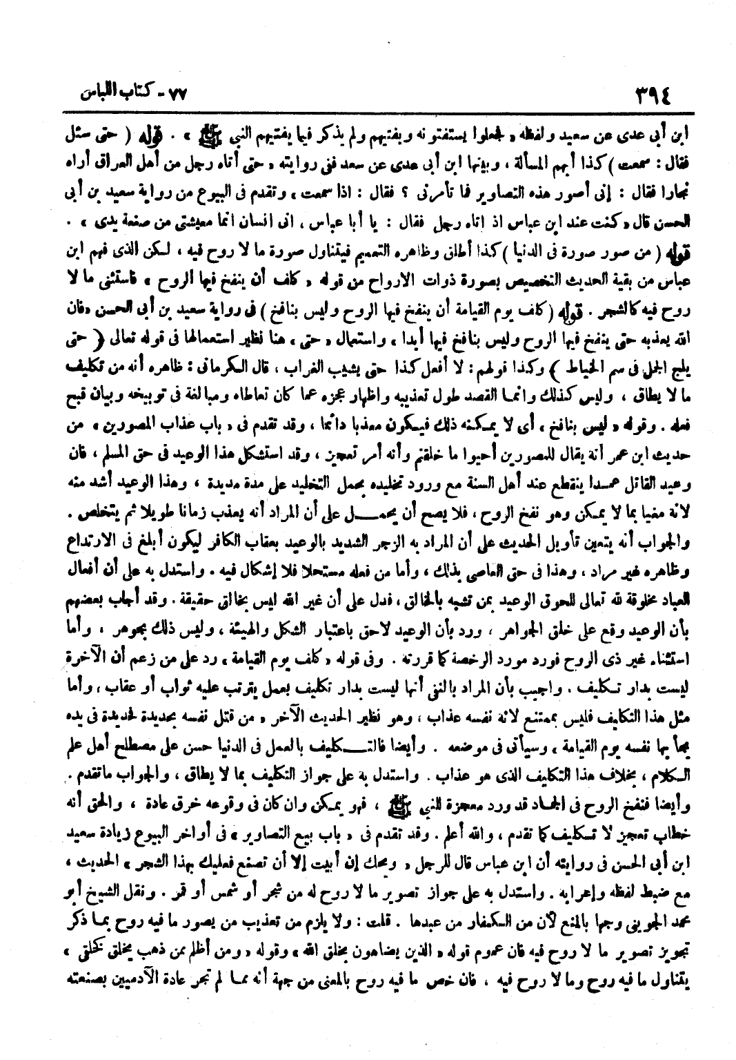 بن أَبِي عَدِيٍّ عَنْ سَعِيدٍ وَلَفْظُهُ فَجَعَلُوا يَسْتَفْتُونَهُ وَيُفْتِيهِمْ وَلَمْ يَذْكُرْ فِيمَا يُفْتِيهِمُ النَّبِيُّ صَلَّى اللَّهُ عَلَيْهِ وَسَلَّمَ قَوْلُهُ حَتَّى سُئِلَ فَقَالَ سَمِعت كَذَا أبهم الْمَسْأَلَة وَبَينهَا بن أَبِي عَدِيٍّ عَنْ سَعْدٍ فَفِي رِوَايَتِهِ حَتَّى أَتَاهُ رَجُلٌ مِنْ أَهْلِ الْعِرَاقِ أَرَاهُ نَجَّارًا فَقَالَ إِنِّي أُصَوِّرُ هَذِهِ التَّصَاوِيرَ فَمَا تَأْمُرنِي فَقَالَ إِذًا سَمِعْتُ وَتَقَدَّمَ فِي الْبُيُوعِ مِنْ رِوَايَةِ سَعِيدِ بْنِ أَبِي الْحَسَنِ قَالَ كُنْتُ عِنْد بن عَبَّاسٍ إِذْ أَتَاهُ رَجُلٌ فَقَالَ يَا أَبَا عَبَّاسٍ إِنِّي إِنْسَانٌ إِنَّمَا مَعِيشَتِي مِنْ صَنْعَةِ يَدِي قَوْلُهُ مَنْ صَوَّرَ صُورَةً فِي الدُّنْيَا كَذَا أَطْلَقَ وَظَاهِرُهُ التَّعْمِيمُ فَيَتَنَاوَلُ صُورَةَ مَا لَا روح فِيهِ لَكِن الَّذِي فهم بن عَبَّاسٍ مِنْ بَقِيَّةِ الْحَدِيثِ التَّخْصِيصَ بِصُورَةِ ذَوَاتِ الْأَرْوَاحِ مِنْ قَوْلِهِ كُلِّفَ أَنْ يَنْفُخَ فِيهَا الرُّوحَ فَاسْتَثْنَى مَا لَا رُوحَ فِيهِ كَالشَّجَرِ قَوْلُهُ كُلِّفَ يَوْمَ الْقِيَامَةِ أَنْ يَنْفُخَ فِيهَا الرُّوحَ وَلَيْسَ بِنَافِخٍ فِي رِوَايَةِ سَعِيدِ بْنِ أَبِي الْحَسَنِ فَإِنَّ اللَّهَ يُعَذِّبُهُ حَتَّى يَنْفُخَ فِيهَا الرُّوحَ وَلَيْسَ بِنَافِخٍ فِيهَا أَبَدًا وَاسْتِعْمَالُ حَتَّى هُنَا نَظِيرُ اسْتِعْمَالِهَا فِي قَوْلُهُ تَعَالَى حَتَّى يَلِجَ الْجَمَلُ فِي سَمِّ الْخياط وَكَذَا قَوْلُهُمْ لَا أَفْعَلُ كَذَا حَتَّى يَشِيبَ الْغُرَابُ قَالَ الْكِرْمَانِيُّ ظَاهِرُهُ أَنَّهُ مِنْ تَكْلِيفِ مَا لَا يُطَاقُ وَلَيْسَ كَذَلِكَ وَإِنَّمَا الْقَصْدُ طُولُ تَعْذِيبِهِ وَإِظْهَارُ عَجْزِهِ عَمَّا كَانَ تَعَاطَاهُ وَمُبَالَغَةٌ فِي تَوْبِيخِهِ وَبَيَانُ قُبْحِ فِعْلِهِ وَقَوْلُهُ لَيْسَ بِنَافِخٍ أَيْ لَا يُمْكِنُهُ ذَلِكَ فَيَكُونُ مُعَذَّبًا دَائِمًا وَقَدْ تَقَدَّمَ فِي بَابِ عَذَابِ المصورين من حَدِيث بن عُمَرَ أَنَّهُ يُقَالُ لِلْمُصَوِّرِينَ أَحْيُوا مَا خَلَقْتُمْ وَأَنَّهُ أَمْرُ تَعْجِيزٍ وَقَدِ اسْتَشْكَلَ هَذَا الْوَعِيدُ فِي حَقِّ الْمُسْلِمِ فَإِنَّ وَعِيدَ الْقَاتِلِ عَمْدًا يَنْقَطِعُ عِنْدَ أَهْلِ السُّنَّةِ مَعَ وُرُودِ تَخْلِيدِهِ بِحَمْلِ التَّخْلِيدِ عَلَى مُدَّةٍ مَدِيدَةٍ وَهَذَا الْوَعِيدُ أَشَدُّ مِنْهُ لِأَنَّهُ مُغَيًّا بِمَا لَا يُمْكِنُ وَهُوَ نَفْخُ الرُّوحِ فَلَا يَصِحُّ أَنْ يُحْمَلَ عَلَى أَنَّ الْمُرَادَ أَنَّهُ يُعَذَّبُ زَمَانًا طَوِيلًا ثُمَّ يَتَخَلَّصُ وَالْجَوَابُ أَنَّهُ يَتَعَيَّنُ تَأْوِيلَ الْحَدِيثِ عَلَى أَنَّ الْمُرَادَ بِهِ الزَّجْرُ الشَّدِيدُ بِالْوَعِيدِ بِعِقَابِ الْكَافِرِ لِيَكُونَ أَبْلَغُ فِي الِارْتِدَاعِ وَظَاهِرُهُ غَيْرُ مُرَادٍ وَهَذَا فِي حَقِّ الْعَاصِي بِذَلِكَ وَأَمَّا مَنْ فَعَلَهُ مُسْتَحِلًّا فَلَا إِشْكَالَ فِيهِ وَاسْتُدِلَّ بِهِ عَلَى أَنَّ أَفْعَالَ الْعِبَادِ مَخْلُوقَةٌ لِلَّهِ تَعَالَى لِلُحُوقِ الْوَعِيدِ بِمَنْ تَشَبَّهَ بِالْخَالِقِ فَدَلَّ عَلَى أَنَّ غَيْرَ اللَّهِ لَيْسَ بِخَالِقٍ حَقِيقَةً وَقَدْ أَجَابَ بَعْضُهُمْ بِأَنَّ الْوَعِيدَ وَقَعَ عَلَى خَلْقِ الْجَوَاهِرِ وَرُدَّ بِأَنَّ الْوَعِيدَ لَاحِقٌ بِاعْتِبَارِ الشَّكْلِ وَالْهَيْئَةِ وَلَيْسَ ذَلِكَ بِجَوْهَرٍ وَأَمَّا اسْتِثْنَاءُ غَيْرِ ذِي الرُّوحِ فَوَرَدَ مَوْرِدَ الرُّخْصَةِ كَمَا قَرَّرْتُهُ وَفِي قَوْلِهِ كُلِّفَ يَوْمَ الْقِيَامَةِ رَدٌّ عَلَى مَنْ زَعَمَ أَنَّ الْآخِرَةَ لَيْسَتْ بِدَارِ تَكْلِيفٍ وَأُجِيبَ بِأَنَّ الْمُرَادَ بِالنَّفْيِ أَنَّهَا لَيْسَتْ بِدَارِ تَكْلِيفٍ بِعَمَلٍ يَتَرَتَّبُ عَ