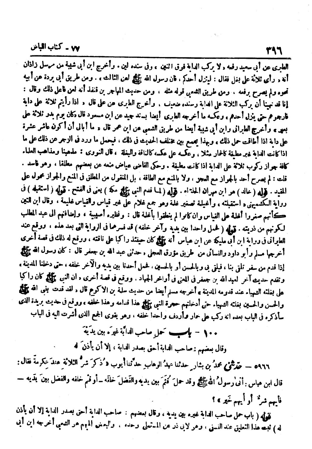 الطَّبَرِيّ عَنْ أَبِي سَعِيدٍ رَفَعَهُ لَا يَرْكَبُ الدَّابَّةَ فَوق اثْنَيْنِ وَفِي سَنَده لين وَأخرج بن أَبِي شَيْبَةَ مِنْ مُرْسَلِ زَاذَانَ أَنَّهُ رَأَى ثَلَاثَةً عَلَى بَغْلٍ فَقَالَ لِيَنْزِلْ أَحَدُكُمْ فَإِنَّ رَسُولَ اللَّهِ صَلَّى اللَّهُ عَلَيْهِ وَسَلَّمَ لعن الثَّالِثَ وَمِنْ طَرِيقِ أَبِي بُرْدَةَ عَنْ أَبِيهِ نَحْوَهُ وَلَمْ يُصَرِّحْ بِرَفْعِهِ وَمِنْ طَرِيقِ الشَّعْبِيِّ قَوْلَهُ مِثْلَهُ وَمِنْ حَدِيثِ الْمُهَاجِرِ بْنِ قُنْفُذٍ أَنَّهُ لَعَنَ فَاعِلَ ذَلِكَ وَقَالَ إِنَّا قَدْ نُهِينَا أَنْ يَرْكَبَ الثَّلَاثَةُ عَلَى الدَّابَّةِ وَسَنَدُهُ ضَعِيفٌ وَأَخْرَجَ الطَّبَرِيُّ عَنْ عَلِيٍّ قَالَ إِذَا رَأَيْتُمْ ثَلَاثَةً عَلَى دَابَّةٍ فَارْجُمُوهُمْ حَتَّى يَنْزِلَ أَحَدُهُمْ وَعَكْسُهُ مَا أَخْرَجَهُ الطَّبَرِيُّ أَيْضًا بِسَنَدٍ جيد عَن بن مَسْعُودٍ قَالَ كَانَ يَوْمُ بَدْرٍ ثَلَاثَةٌ عَلَى بعير وَأخرج الطَّبَرَانِيّ وبن أَبِي شَيْبَةَ أَيْضًا مِنْ طَرِيقِ الشَّعْبِيِّ عَنِ بن عُمَرَ قَالَ مَا أُبَالِي أَنْ أَكُونَ عَاشِرَ عَشْرَةٍ عَلَى دَابَّةٍ إِذَا أَطَاقَتْ حَمْلَ ذَلِكَ وَبِهَذَا يُجْمَعُ بَيْنَ مُخْتَلِفِ الْحَدِيثِ فِي ذَلِكَ فَيحمل مَا وَرَدَ فِي الزَّجْرِ عَنْ ذَلِكَ عَلَى مَا إِذَا كَانَتِ الدَّابَّةُ غَيْرَ مُطِيقَةٍ كَالْحِمَارِ مَثَلًا وَعَكْسُهُ عَلَى عَكْسِهِ كَالنَّاقَةِ وَالْبَغْلَةِ قَالَ النَّوَوِيُّ مَذْهَبُنَا وَمَذَاهِبُ الْعُلَمَاءِ كَافَّةً جَوَازُ رُكُوبِ ثَلَاثَةٍ عَلَى الدَّابَّةِ إِذَا كَانَتْ مُطِيقَةً وَحَكَى الْقَاضِي عِيَاضٌ مَنْعَهُ عَنْ بَعْضِهِمْ مُطْلَقًا وَهُوَ فَاسِدٌ قُلْتُ لَمْ يُصَرِّحْ أَحَدٌ بِالْجَوَازِ مَعَ الْعَجْزِ وَلَا بِالْمَنْعِ مَعَ الطَّاقَةِ بَلِ الْمَنْقُولُ مِنَ الْمُطْلَقِ فِي الْمَنْعِ وَالْجَوَازِ مَحْمُولٌ عَلَى الْمُقَيد