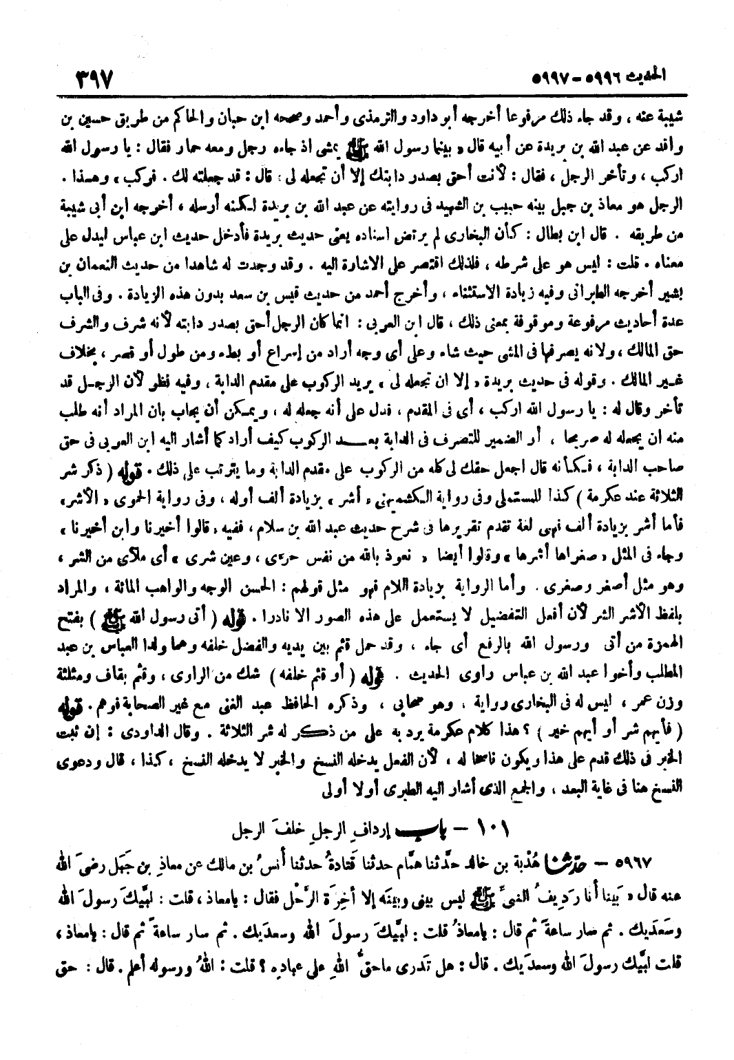شَيْبَةَ عَنْهُ وَقَدْ جَاءَ ذَلِكَ مَرْفُوعًا أَخْرَجَهُ أَبُو دَاوُد وَالتِّرْمِذِيّ وَأحمد وَصَححهُ بن حِبَّانَ وَالْحَاكِمُ مِنْ طَرِيقِ حُسَيْنِ بْنِ وَاقِدٍ عَنْ عَبْدِ اللَّهِ بْنِ بُرَيْدَةَ عَنْ أَبِيهِ قَالَ بَيْنَمَا رَسُولُ اللَّهِ صَلَّى اللَّهُ عَلَيْهِ وَسَلَّمَ يَمْشِي إِذْ جَاءَهُ رَجُلٌ وَمَعَهُ حِمَارٌ فَقَالَ يَا رَسُولَ اللَّهِ ارْكَبْ وَتَأَخَّرَ الرَّجُلُ فَقَالَ لَأَنْتَ أَحَقُّ بِصَدْرِ دَابَّتِكَ إِلَّا أَنْ تَجْعَلَهُ لِي قَالَ قَدْ جَعَلْتُهُ لَكَ فَرَكِبَ وَهَذَا الرَّجُلُ هُوَ مُعَاذُ بْنُ جَبَلٍ بَيَّنَهُ حَبِيبُ بْنُ الشَّهِيدِ فِي رِوَايَتِهِ عَنْ عَبْدِ الله بن بُرَيْدَة لكنه أرْسلهُ أخرجه بن أبي شيبَة من طَرِيقه قَالَ بن بَطَّالٍ كَأَنَّ الْبُخَارِيَّ لَمْ يَرْتَضِ إِسْنَادَهُ يَعْنِي حَدِيث بُرَيْدَة فَأدْخل حَدِيث بن عَبَّاسٍ لِيَدُلُّ عَلَى مَعْنَاهُ قُلْتُ لَيْسَ هُوَ عَلَى شَرْطِهِ فَلِذَلِكَ اقْتَصَرَ عَلَى الْإِشَارَةِ إِلَيْهِ وَقَدْ وَجَدْتُ لَهُ شَاهِدًا مِنْ حَدِيثِ النُّعْمَانِ بْنِ بَشِيرٍ أَخْرَجَهُ الطَّبَرَانِيُّ وَفِيهِ زِيَادَةٌ الِاسْتِثْنَاءُ وَأَخْرَجَ أَحْمَدُ مِنْ حَدِيثِ قَيْسِ بْنِ سَعْدٍ بِدُونِ هَذِهِ الزِّيَادَةِ وَفِي الْبَابِ عِدَّةُ أَحَادِيثَ مَرْفُوعَة وموقوفة بِمَعْنى ذَلِك قَالَ بن الْعَرَبِيِّ إِنَّمَا كَانَ الرَّجُلُ أَحَقُّ بِصَدْرِ دَابَّتِهِ لِأَنَّهُ شَرَفٌ وَالشَّرَفُ حَقُّ الْمَالِكِ وَلِأَنَّهُ يَصْرِفُهَا فِي الْمَشْيِ حَيْثُ شَاءَ وَعَلَى أَيِّ وَجْهٍ أَرَادَ مِنْ إِسْرَاعٍ أَوْ بُطْءٍ وَمِنْ طُولٍ أَوْ قِصَرٍ بِخِلَافِ غَيْرِ الْمَالِكِ وَقَوْلُهُ فِي حَدِيثِ بُرَيْدَةَ إِلَّا أَنْ تَجْعَلَهُ لِي يُرِيدُ الرُّكُوبَ عَلَى مُقَدَّمِ الدَّابَّةِ وَفِيهِ نَظَرٌ لِأَنَّ الرَّجُلَ قَدْ تَأَخَّرَ وَقَالَ لَهُ يَا رَسُولَ اللَّهِ ارْكَبْ أَيْ فِي الْمُقَدَّمِ فَدَلَّ عَلَى أَنَّهُ جَعَلَهُ لَهُ وَيُمْكِنُ أَنْ يُجَابَ بِأَنَّ الْمُرَادَ أَنَّهُ طَلَبَ مِنْهُ أَنْ يَجْعَلَهُ لَهُ صَرِيحًا أَوِ الضَّمِيرُ لِلتَّصَرُّفِ فِي الدَّابَّةِ بَعْدَ الرّكُوب كَيفَ أَرَادَ كَمَا أَشَارَ إِلَيْهِ بن الْعَرَبِيِّ فِي حَقِّ صَاحِبِ الدَّابَّةِ فَكَأَنَّهُ قَالَ اجْعَلْ حَقَّكَ لِي كُلَّهُ مِنَ الرُّكُوبِ عَلَى مُقَدَّمِ الدَّابَّةِ وَمَا يَتَرَتَّبُ عَلَى ذَلِكَ