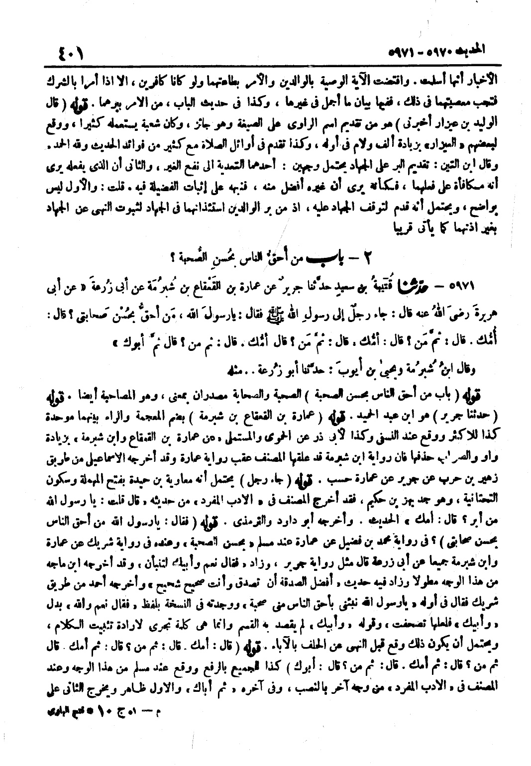[5971] قَوْله حَدثنَا جرير هُوَ بن عَبْدِ الْحَمِيدِ قَوْلُهُ عُمَارَةُ بْنُ الْقَعْقَاعِ بْنِ شُبْرُمَةَ بِضَمِّ الْمُعْجَمَةِ وَالرَّاءِ بَيْنَهُمَا مُوَحَّدَةٌ كَذَا لِلْأَكْثَرِ وَوَقَعَ عِنْدَ النَّسَفِيِّ وَكَذَا لِأَبِي ذَرٍّ عَنِ الْحَمَوِيِّ وَالْمُسْتَمْلِي عَنْ عُمَارَةَ بْنِ الْقَعْقَاعِ وبن شُبْرُمَةَ بِزِيَادَةِ وَاوٍ وَالصَّوَابُ حَذْفُهَا فَإِنَّ رِوَايَةَ بن شُبْرُمَةَ قَدْ عَلَّقَهَا الْمُصَنِّفُ عَقِبَ رِوَايَةِ عُمَارَةَ وَقَدْ أَخْرَجَهُ الْإِسْمَاعِيلِيُّ مِنْ طَرِيقِ زُهَيْرِ بْنِ حَرْبٍ عَنْ جَرِيرٍ عَنْ عُمَارَةَ حَسْبَ قَوْلِهِ جَاءَ رَجُلٌ يُحْتَمَلُ أَنَّهُ مُعَاوِيَةُ بْنُ حَيْدَةَ بِفَتْحِ الْمُهْمَلَةِ وَسُكُونِ التَّحْتَانِيَّةِ وَهُوَ جَدُّ بَهْزِ بْنِ حَكِيمٍ فَقَدْ أَخْرَجَ الْمُصَنِّفُ فِي الْأَدَبِ الْمُفْرَدِ مِنْ حَدِيثِهِ قَالَ قُلْتُ يَا رَسُولَ اللَّهِ مَنْ أَبَرُّ قَالَ أُمُّكَ الْحَدِيثَ وَأَخْرَجَهُ أَبُو دَاوُدَ وَالتِّرْمِذِيُّ قَوْلُهُ فَقَالَ يَا رَسُولَ اللَّهِ مَنْ أَحَقُّ النَّاسِ بِحُسْنِ صَحَابَتِي فِي رِوَايَةِ مُحَمَّدِ بْنِ فُضَيْلٍ عَنْ عُمَارَةَ عِنْدَ مُسْلِمٍ بِحُسْنِ الصُّحْبَةِ وَعِنْدَهُ فِي رِوَايَةِ شَرِيكٍ عَن عمَارَة وبن شُبْرُمَةَ جَمِيعًا عَنْ أَبِي زُرْعَةَ قَالَ مِثْلَ رِوَايَةِ جَرِيرٍ وَزَادَ فَقَالَ نَعَمْ وَأَبِيكَ لَتُنَبَّأَنَّ وَقد أخرجه بن مَاجَهْ مِنْ هَذَا الْوَجْهِ مُطَوَّلًا وَزَادَ فِيهِ حَدِيثَ أَفْضَلُ الصَّدَقَةِ أَنْ تَصَّدَّقَ وَأَنْتَ صَحِيحٌ شَحِيحٌ وَأَخْرَجَهُ أَحْمَدُ مِنْ طَرِيقِ شَرِيكٍ فَقَالَ فِي أَوَّلِهِ يَا رَسُولَ اللَّهِ نَبِّئْنِي بِأَحَقِّ النَّاسِ مِنِّي صُحْبَةً وَوَجَدْتُهُ فِي النُّسْخَةِ بِلَفْظِ فَقَالَ نَعَمْ وَاللَّهِ بَدَلَ وَأَبِيكَ فَلَعَلَّهَا تَصَحَّفَتْ وَقَوْلُهُ وَأَبِيكَ لَمْ يَقْصِدْ بِهِ الْقَسَمَ وَإِنَّمَا هِيَ كَلِمَةٌ تَجْرِي لِإِرَادَةِ تَثْبِيتِ الْكَلَامِ وَيُحْتَمَلُ أَنْ يَكُونَ ذَلِكَ وَقَعَ قَبْلَ النَّهْيِ عَنِ الْحَلِفِ بِالْآبَاءِ قَوْلُهُ قَالَ أُمُّكَ قَالَ ثُمَّ مَنْ قَالَ ثُمَّ أُمُّكَ قَالَ ثُمَّ مَنْ قَالَ ثُمَّ أُمُّكَ قَالَ ثُمَّ مَنْ قَالَ أَبُوكَ كَذَا لِلْجَمِيعِ بِالرَّفْعِ وَوَقَعَ عِنْدَ مُسْلِمٍ مِنْ هَذَا الْوَجْهِ وَعِنْدَ الْمُصَنِّفِ فِي الْأَدَبِ الْمُفْرَدِ مِنْ وَجْهٍ آخَرَ بِالنَّصْبِ وَفِي آخَرِهِ ثُمَّ أَبَاكَ وَالْأَوَّلُ ظَاهِرٌ وَيَخْرُجُ الثَّانِي عَلَى