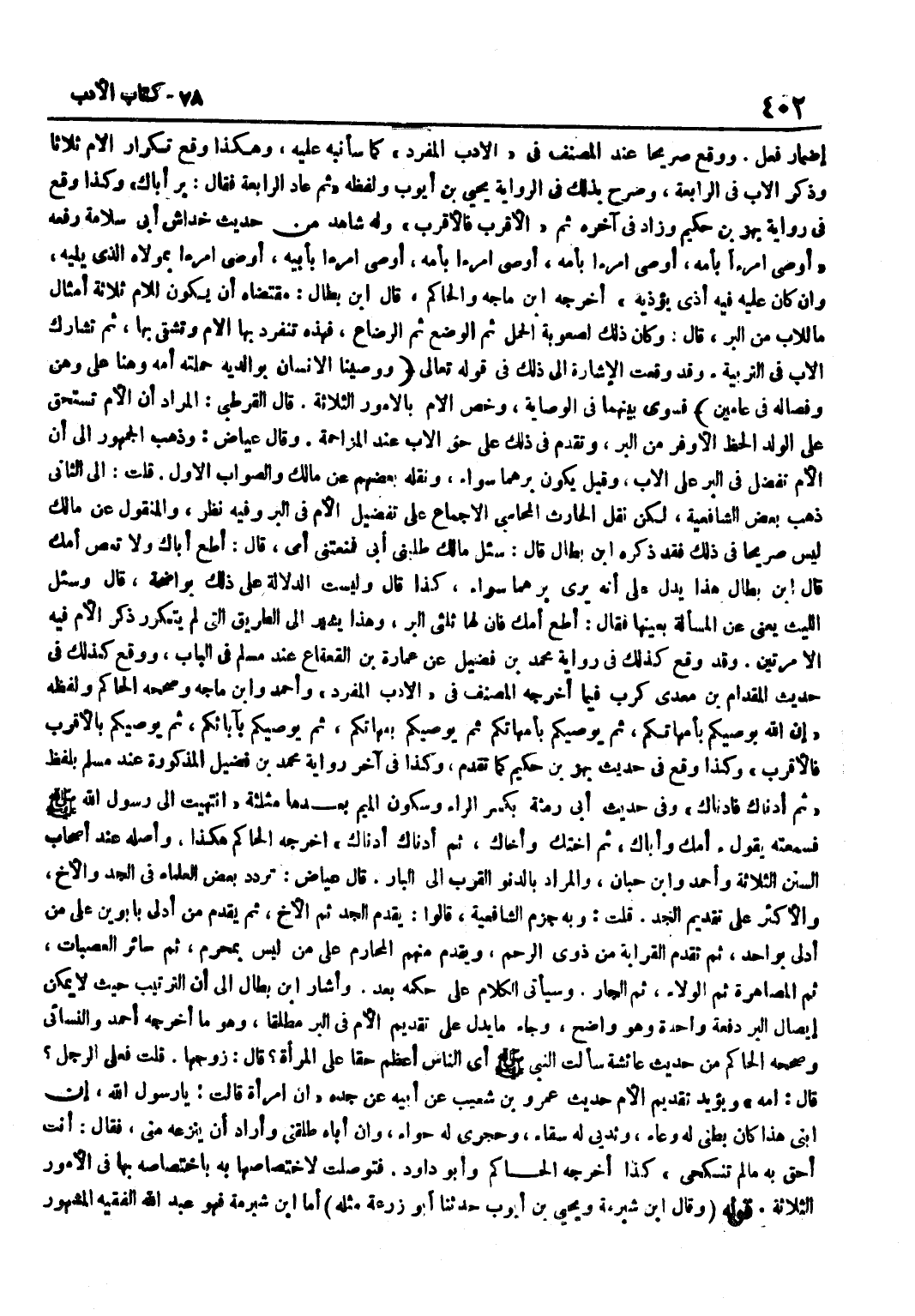 إِضْمَارِ فِعْلٍ وَوَقَعَ صَرِيحًا عِنْدَ الْمُصَنِّفِ فِي الْأَدَبِ الْمُفْرَدِ كَمَا سَأُنَبِّهُ عَلَيْهِ وَهَكَذَا وَقَعَ تَكْرَارُ الْأُمِّ ثَلَاثًا وَذِكْرُ الْأَبِ فِي الرَّابِعَةِ وَصَرَّحَ بِذَلِكَ فِي الرِّوَايَةِ يَحْيَى بْنُ أَيُّوبَ وَلَفْظُهُ ثُمَّ عَادَ الرَّابِعَةَ فَقَالَ بِرَّ أَبَاكَ وَكَذَا وَقَعَ فِي رِوَايَةِ بَهْزِ بْنِ حَكِيمٍ وَزَادَ فِي آخِرِهِ ثُمَّ الْأَقْرَبَ فَالْأَقْرَبَ وَلَهُ شَاهِدٌ مِنْ حَدِيثِ خِدَاشٍ أَبِي سَلَامَةَ رَفَعَهُ أوصى امْرَءًا بِأُمِّهِ أوصى امْرَءًا بِأُمِّهِ أوصى امْرَءًا بِأُمِّهِ أوصى امْرَءًا بِأَبِيهِ أوصِي امْرَءًا بِمَوْلَاهُ الَّذِي يَلِيهِ وَإِنْ كَانَ عَلَيْهِ فِيهِ أَذَى يُؤْذِيه أخرجه بن ماجة وَالْحَاكِم قَالَ بن بَطَّالٍ مُقْتَضَاهُ أَنْ يَكُونَ لِلْأُمِّ ثَلَاثَةُ أَمْثَالِ مَا لِلْأَبِ مِنَ الْبِرِّ قَالَ وَكَانَ ذَلِكَ لِصُعُوبَةِ الْحَمْلِ ثُمَّ الْوَضْعِ ثُمَّ الرَّضَاعِ فَهَذِهِ تَنْفَرِدُ بِهَا الْأُمُّ وَتَشْقَى بِهَا ثُمَّ تُشَارِكُ الْأَبَ فِي التَّرْبِيَةِ وَقَدْ وَقَعَتِ الْإِشَارَةُ إِلَى ذَلِكَ فِي قَوْلِهِ تَعَالَى وَوَصَّيْنَا الْإِنْسَانَ بِوَالِدَيْهِ حَمَلَتْهُ أُمُّهُ وَهْنًا عَلَى وَهْنٍ وَفِصَالُهُ فِي عَاميْنِ فَسَوَّى بَيْنَهُمَا فِي الْوِصَايَةِ وَخَصَّ الْأُمَّ بِالْأُمُورِ الثَّلَاثَةِ قَالَ الْقُرْطُبِيُّ الْمُرَادُ أَنَّ الْأُمَّ تَسْتَحِقُّ عَلَى الْوَلَدِ الْحَظَّ الْأَوْفَرَ مِنَ الْبِرِّ وَتُقَدَّمَ فِي ذَلِكَ عَلَى حَقِّ الْأَبِ عِنْدَ الْمُزَاحَمَةِ وَقَالَ عِيَاضٌ وَذَهَبَ الْجُمْهُورُ إِلَى أَنَّ الْأُمَّ تَفْضُلُ فِي الْبِرِّ عَلَى الْأَبِ وَقِيلَ يَكُونُ بِرُّهُمَا سَوَاءً وَنَقَلَهُ بَعْضُهُمْ عَنْ مَالِكٍ وَالصَّوَابُ الْأَوَّلُ قُلْتُ إِلَى الثَّانِي ذَهَبَ بَعْضُ الشَّافِعِيَّةِ لَكِنْ نَقَلَ الْحَارِثُ الْمُحَاسِبِيُّ الْإِجْمَاعَ عَلَى تَفْضِيلِ الْأُمِّ فِي الْبِرِّ وَفِيهِ نَظَرٌ وَالْمَنْقُولُ عَنْ مَالِكٍ لَيْسَ صَرِيحًا فِي ذَلِكَ فَقَدْ ذَكَرَهُ بن بَطَّالٍ قَالَ سُئِلَ مَالِكٌ طَلَبَنِي أَبِي فَمَنَعَتْنِي أُمِّي قَالَ أَطِعْ أَبَاكَ وَلَا تَعْصِ أُمَّكَ قَالَ بن بَطَّالٍ هَذَا يَدُلُّ عَلَى أَنَّهُ يَرَى بِرَّهُمَا سَوَاءً كَذَا قَالَ وَلَيْسَتِ الدَّلَالَةُ عَلَى ذَلِكَ بِوَاضِحَةٍ قَالَ وَسُئِلَ اللَّيْثُ يَعْنِي عَنِ الْمَسْأَلَةِ بِعَيْنِهَا فَقَالَ أَطِعْ أُمَّكَ فَإِنَّ لَهَا ثُلُثَيِ الْبِرِّ وَهَذَا يُشِيرُ إِلَى الطَّرِيقِ الَّتِي لَمْ يتَكَرَّر ذكر الْأُم فِيهِ الأمرتين وَقَدْ وَقْعَ كَذَلِكَ فِي رِوَايَةِ مُحَمَّدِ بْنِ فُضَيْلٍ عَنْ عُمَارَةَ بْنِ الْقَعْقَاعِ عِنْدَ مُسْلِمٍ فِي الْبَابِ وَوَقَعَ كَذَلِكَ فِي حَدِيثِ الْمِقْدَامِ بْنِ مَعْدِي كَرِبَ فِيمَا أَخْرَجَهُ الْمُصَنِّفُ فِي الْأَدَب الْمُفْرد وَأحمد وبن مَاجَهْ وَصَحَّحَهُ الْحَاكِمُ وَلَفْظُهُ إِنَّ اللَّهَ يُوصِيكُمْ بِأُمَّهَاتِكُمْ ثُمَّ يُوصِيكُمْ بِأُمَّهَاتِكُمْ ثُمَّ يُوصِيكُمْ بِأُمَّهَاتِكُمْ ثُمَّ يُوصِيكُمْ بِآبَائِكُمْ ثُمَّ يُوصِيكُمْ بِالْأَقْرَبِ فَالْأَقْرَبِ وَكَذَا وَقَعَ فِي حَدِيثِ بَهْزِ بْنِ حَكِيمٍ كَمَا تَقَدَّمَ وَكَذَا فِي آخِرِ رِوَايَةِ مُحَمَّدِ بْنِ فُضَيْلٍ الْمَذْكُورَةِ عِنْدَ مُسْلِمٍ بِلَفْظِ ثُمَّ أَدْنَاكَ فَأَدْنَاكَ وَفِي حَدِيثِ أَبِي رِمْثَةَ بِكَسْرِ الرَّاءِ وَسُكُونِ الْمِيمِ بَعْدَهَا مُثَلَّثَةً انْتَهَيْتُ إِلَى رَسُولِ اللَّهِ صَلَّى اللَّهُ عَلَيْهِ وَسَلَّمَ فَسَمِعْتُهُ يَقُولُ أُمَّكَ وَأَبَاكَ ثُمَّ أُخْتَكَ وَأَخَاكَ ثُمَّ أَدْنَاكَ أَدْنَاكَ أَخْرَجَهُ الْحَاكِمُ هَكَذَا وَأَصْلُهُ عِنْدَ أَ