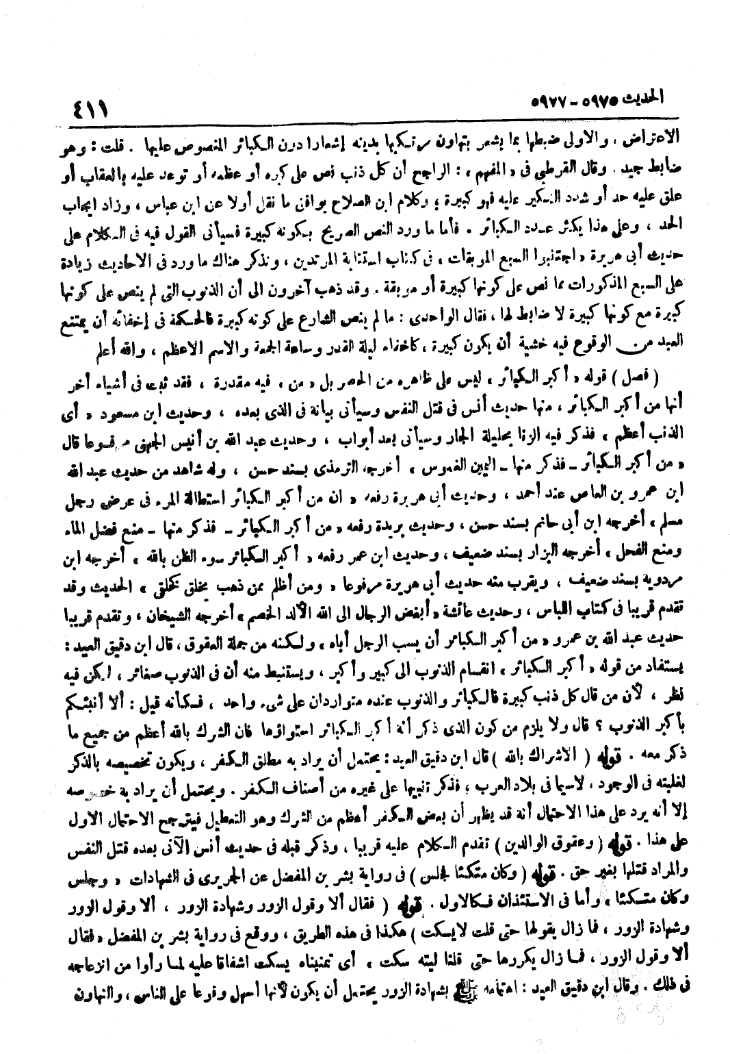 الِاعْتِرَاضِ وَالْأَوْلَى ضَبْطُهَا بِمَا يُشْعِرُ بِتَهَاوُنِ مُرْتَكِبِهَا بِدِينِهِ إِشْعَارًا دُونَ الْكَبَائِرِ الْمَنْصُوصِ عَلَيْهَا قُلْتُ وَهُوَ ضَابِطٌ جَيِّدٌ وَقَالَ الْقُرْطُبِيُّ فِي الْمُفْهِمِ الرَّاجِحُ أَنَّ كُلَّ ذَنْبٍ نُصَّ عَلَى كِبَرِهِ أَوْ عِظَمِهِ أَوْ تُوُعِّدَ عَلَيْهِ بِالْعِقَابِ أَوْ عُلِّقَ عَلَيْهِ حَدٌّ أَوْ شُدِّدَ النَّكِيرُ عَلَيْهِ فَهُوَ كَبِيرَة وَكَلَام بن الصّلاح يُوَافق مَا نقل أَولا عَن بن عَبَّاسٍ وَزَادَ إِيجَابُ الْحَدِّ وَعَلَى هَذَا يَكْثُرُ عَدَدُ الْكَبَائِرِ فَأَمَّا مَا وَرَدَ النَّصُّ الصَّرِيحُ بِكَوْنِهِ كَبِيرَةً فَسَيَأْتِي الْقَوْلُ فِيهِ فِي الْكَلَامِ عَلَى حَدِيثِ أَبِي هُرَيْرَةَ اجْتَنِبُوا السَّبْعَ الْمُوبِقَاتِ فِي كِتَابِ اسْتِتَابَةِ الْمُرْتَدِّينَ وَنَذْكُرُ هُنَاكَ مَا وَرَدَ فِي الْأَحَادِيثِ زِيَادَةً عَلَى السَّبْعِ الْمَذْكُورَاتِ مِمَّا نَصَّ عَلَى كَوْنِهَا كَبِيرَةً أَوْ مُوبِقَةً وَقَدْ ذَهَبَ آخَرُونَ إِلَى أَنَّ الذُّنُوبَ الَّتِي لَمْ يُنَصَّ عَلَى كَوْنِهَا كَبِيرَةً مَعَ كَوْنِهَا كَبِيرَةً لَا ضَابِطَ لَهَا فَقَالَ الْوَاحِدِيُّ مَا لَمْ يَنُصَّ الشَّارِعُ عَلَى كَوْنِهِ كَبِيرَةً فَالْحِكْمَةُ فِي إِخْفَائِهِ أَنْ يَمْتَنِعَ الْعَبْدُ مِنَ الْوُقُوعِ فِيهِ خَشْيَةَ أَنْ يَكُونَ كَبِيرَةً كَإِخْفَاءِ لَيْلَةِ الْقَدْرِ وَسَاعَةِ الْجُمُعَةِ وَالِاسْمِ الْأَعْظَمِ وَاللَّهُ أَعْلَمُ فَصْلٌ قَوْلُهُ أَكْبَرُ الْكَبَائِرِ لَيْسَ عَلَى ظَاهِرِهِ مِنَ الْحَصْرِ بَلْ مِنْ فِيهِ مُقَدَّرَةٌ فَقَدْ ثَبَتَ فِي أَشْيَاءَ أُخَرَ أَنَّهَا مِنْ أَكْبَرِ الْكَبَائِرِ مِنْهَا حَدِيثُ أَنَسٍ فِي قَتْلِ النَّفْسِ وَسَيَأْتِي بَيَانه فِي الَّذِي بعده وَحَدِيث بن مَسْعُودٍ أَيِ الذَّنْبِ أَعْظَمُ فَذَكَرَ فِيهِ الزِّنَا بِحَلِيلَةِ الْجَارِ وَسَيَأْتِي بَعْدَ أَبْوَابٍ وَحَدِيثُ عَبْدِ اللَّهِ بْنِ أُنَيْسٍ الْجُهَنِيِّ مَرْفُوعًا قَالَ مِنْ أَكْبَرِ الْكَبَائِرِ فَذَكَرَ مِنْهَا الْيَمِينَ الْغَمُوسَ أَخْرَجَهُ التِّرْمِذِيُّ بِسَنَدٍ حَسَنٍ وَلَهُ شَاهِدٌ مِنْ حَدِيثِ عَبْدِ اللَّهِ بْنِ عَمْرِو بْنِ الْعَاصِ عِنْدَ أَحْمَدَ وَحَدِيثِ أَبِي هُرَيْرَةَ رَفَعَهُ إِنَّ مِنْ أَكْبَرِ الْكَبَائِرِ اسْتِطَالَةُ الْمَرْءِ فِي عِرْضِ رَجُلٍ مُسلم أخرجه بن أَبِي حَاتِمٍ بِسَنَدٍ حَسَنٍ وَحَدِيثِ بُرَيْدَةَ رَفَعَهُ مِنْ أَكْبَرِ الْكَبَائِرِ فَذَكَرَ مِنْهَا مَنْعَ فَضْلِ الْمَاءِ وَمَنْعَ الْفَحْلِ أَخْرَجَهُ الْبَزَّارُ بِسَنَدٍ ضَعِيفٍ وَحَدِيث بن عُمَرَ رَفَعَهُ أَكْبَرُ الْكَبَائِرِ سُوءُ الظَّنِّ بِاللَّهِ أخرجه بن مَرْدَوَيْهِ بِسَنَدٍ ضَعِيفٍ وَيَقْرَبُ مِنْهُ حَدِيثُ أَبِي هُرَيْرَةَ مَرْفُوعًا وَمَنْ أَظْلَمُ مِمَّنْ ذَهَبَ يَخْلُقُ كَخَلْقِي الْحَدِيثَ وَقَدْ تَقَدَّمَ قَرِيبًا فِي كِتَابِ اللِّبَاسِ وَحَدِيثُ عَائِشَةَ أَبْغَضُ الرِّجَالِ إِلَى اللَّهِ الْأَلَدُّ الْخَصِمُ أَخْرَجَهُ الشَّيْخَانِ وَتَقَدَّمَ قَرِيبًا حَدِيثُ عَبْدِ اللَّهِ بْنِ عَمْرٍو مِنْ أَكْبَرِ الْكَبَائِرِ أَنْ يَسُبَّ الرَّجُلُ أَبَاهُ وَلَكِنَّهُ مِنْ جُمْلَةِ العقوق قَالَ بن دَقِيقِ الْعِيدِ يُسْتَفَادُ مِنْ قَوْلِهِ أَكْبَرُ الْكَبَائِرِ انْقِسَامُ الذُّنُوبِ إِلَى كَبِيرٍ وَأَكْبَرَ وَيُسْتَنْبَطُ مِنْهُ أَنَّ فِي الذُّنُوبِ صَغَائِرَ لَكِنْ فِيهِ نَظَرٌ لِأَنَّ مَنْ قَالَ كُلُّ ذَنْبٍ كَبِيرَةٌ فَالْكَبَائِرُ وَالذُّنُوبُ عِنْدَهُ مُتَوَارِدَانِ عَلَى شَيْءٍ وَاحِدٍ فَكَأَنَّهُ قِيلَ أَلَا أُنَبِّئُكُمْ بِأَكْبَرِ الذُّنُوبِ قَالَ وَلَا يَلْزَمُ مِنْ كَوْنِ الَّذِي ذُكِرَ أَنَّهُ 