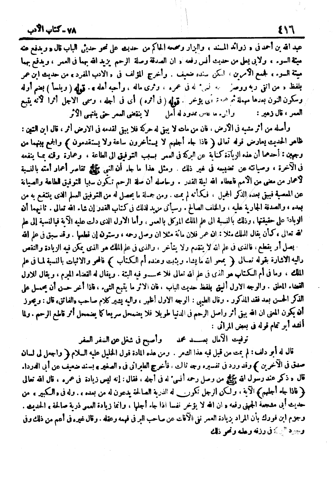 عَبْدُ اللَّهِ بْنُ أَحْمَدَ فِي زَوَائِدِ الْمُسْنَدِ وَالْبَزَّارُ وَصَحَّحَهُ الْحَاكِمُ مِنْ حَدِيثِ عَلِيٍّ نَحْوَ حَدِيثَيِ الْبَابِ قَالَ وَيَدْفَعُ عَنْهُ مِيتَةَ السُّوءِ وَلِأَبِي يَعْلَى مِنْ حَدِيثِ أَنَسٍ رَفَعَهُ إِنَّ الصَّدَقَةَ وَصِلَةَ الرَّحِمِ يَزِيدُ اللَّهُ بِهِمَا فِي الْعُمُرِ وَيَدْفَعُ بِهِمَا مِيتَةَ السُّوءِ فَجَمَعَ الْأَمْرَيْنِ لَكِنْ سَنَدُهُ ضَعِيفٌ وَأَخْرَجَ الْمُؤَلِّفُ فِي الْأَدَبِ الْمُفْرد من حَدِيث بن عُمَرَ بِلَفْظٍ مَنِ اتَّقَى رَبَّهُ وَوَصَلَ رَحِمَهُ نُسِئَ لَهُ فِي عُمُرِهِ وَثَرِيَ مَالُهُ وَأَحَبَّهُ أَهْلُهُ قَوْلُهُ وَيُنْسَأُ بِضَمِّ أَوَّلِهِ وَسُكُونِ النُّونِ بَعْدَهَا مُهْمَلَةٌ ثُمَّ هَمْزَةٌ أَيْ يُؤَخَّرُ قَوْلُهُ فِي أَثَرِهِ أَيْ فِي أَجَلِهِ وَسُمِّيَ الْأَجَلُ أَثَرًا لِأَنَّهُ يَتْبَعُ الْعُمُرِ قَالَ زُهَيْرٌ وَالْمَرْءُ مَا عَاشَ مَمْدُودٌ لَهُ أَمَلٌ لَا يَنْقَضِي الْعُمْرُ حَتَّى يَنْتَهِي الْأَثَرُ وَأَصْلُهُ مِنْ أَثَرِ مَشْيِهِ فِي الْأَرْضِ فَإِنَّ مَنْ مَاتَ لَا يَبْقَى لَهُ حَرَكَةٌ فَلَا يَبْقَى لِقَدَمِهِ فِي الأَرْض أثر قَالَ بن التِّينِ ظَاهِرُ الْحَدِيثِ يُعَارِضُ قَوْلَهُ تَعَالَى فَإِذَا جَاءَ أَجَلُهُمْ لَا يَسْتَأْخِرُونَ سَاعَةً وَلَا يَسْتَقْدِمُونَ وَالْجَمْعُ بَيْنَهُمَا مِنْ وَجْهَيْنِ أَحَدُهُمَا أَنَّ هَذِهِ الزِّيَادَةَ كِنَايَةٌ عَنِ الْبَرَكَةِ فِي الْعُمُرِ بِسَبَبِ التَّوْفِيقِ إِلَى الطَّاعَةِ وَعِمَارَةِ وَقْتِهِ بِمَا يَنْفَعُهُ فِي الْآخِرَةِ وَصِيَانَتِهِ عَنْ تَضْيِيعِهِ فِي غَيْرِ ذَلِكَ وَمِثْلُ هَذَا مَا جَاءَ أَنَّ النَّبِيَّ صَلَّى اللَّهُ عَلَيْهِ وَسَلَّمَ تَقَاصَرَ أَعْمَارَ أُمَّتِهِ بِالنِّسْبَةِ لِأَعْمَارِ مَنْ مَضَى مِنَ الْأُمَمِ فَأَعْطَاهُ اللَّهُ لَيْلَةَ الْقَدْرِ وَحَاصِلُهُ أَنَّ صِلَةَ الرَّحِمِ تَكُونُ سَبَبًا لِلتَّوْفِيقِ لِلطَّاعَةِ وَالصِّيَانَةِ عَنِ الْمَعْصِيَةِ فَيَبْقَى بَعْدَهُ الذِّكْرُ الْجَمِيلُ فَكَأَنَّهُ لَمْ يَمُتْ وَمِنْ جُمْلَةِ مَا يَحْصُلُ لَهُ مِنَ التَّوْفِيقِ الْعِلْمُ الَّذِي يُنْتَفَعُ بِهِ مِنْ بَعْدِهِ وَالصَّدَقَةُ الْجَارِيَةُ عَلَيْهِ وَالْخَلَفُ الصَّالِحُ وَسَيَأْتِي مَزِيدٌ لِذَلِكَ فِي كِتَابِ الْقَدَرِ إِنْ شَاءَ اللَّهُ تَعَالَى ثَانِيهمَا أَنَّ الزِّيَادَةَ عَلَى حَقِيقَتِهَا وَذَلِكَ بِالنِّسْبَةِ إِلَى عِلْمِ الْمَلَكِ الْمُوَكَّلِ بِالْعُمُرِ وَأَمَّا الْأَوَّلُ الَّذِي دَلَّتْ عَلَيْهِ الْآيَةُ فَبِالنِّسْبَةِ إِلَى عِلْمِ اللَّهِ تَعَالَى كَأَنْ يُقَالَ لِلْمَلَكِ مَثَلًا إِنَّ عُمُرَ فُلَانٍ مِائَةٌ مَثَلًا إِنْ وَصَلَ رَحِمَهُ وَسِتُّونَ إِنْ قَطَعَهَا وَقَدْ سَبَقَ فِي عِلْمِ اللَّهِ أَنَّهُ يَصِلُ أَوْ يَقْطَعُ فَالَّذِي فِي عِلْمِ اللَّهِ لَا يَتَقَدَّمُ وَلَا يَتَأَخَّرُ وَالَّذِي فِي عِلْمِ الْمَلَكِ هُوَ الَّذِي يُمْكِنُ فِيهِ الزِّيَادَةُ وَالنَّقْصُ وَإِلَيْهِ الْإِشَارَةُ بِقَوْلِهِ تَعَالَى يَمْحُو اللَّهُ مَا يَشَاءُ وَيُثْبِتُ وَعِنْدَهُ أُمُّ الْكِتَابِ فَالْمَحْوُ وَالْإِثْبَاتُ بِالنِّسْبَةِ لِمَا فِي عِلْمِ الْمَلَكِ وَمَا فِي أُمِّ الْكِتَابِ هُوَ الَّذِي فِي عِلْمِ اللَّهِ تَعَالَى فَلَا مَحْوَ فِيهِ أَلْبَتَّةَ وَيُقَالُ لَهُ الْقَضَاءُ الْمُبْرَمُ وَيُقَالُ لِلْأَوَّلِ الْقَضَاءُ الْمُعَلَّقُ وَالْوَجْهُ الْأَوَّلُ أَلْيَقُ بِلَفْظِ حَدِيثِ الْبَابِ فَإِنَّ الْأَثَرَ مَا يَتْبَعُ الشَّيْءَ فَإِذَا أُخِّرَ حَسُنَ أَنْ يُحْمَلَ عَلَى الذِّكْرِ الْحَسَنِ بَعْدَ فَقْدِ الْمَذْكُورِ وَقَالَ الطِّيبِيُّ الْوَجْهُ الْأَوَّلُ أَظْهَرُ وَإِلَيْهِ يُشِير