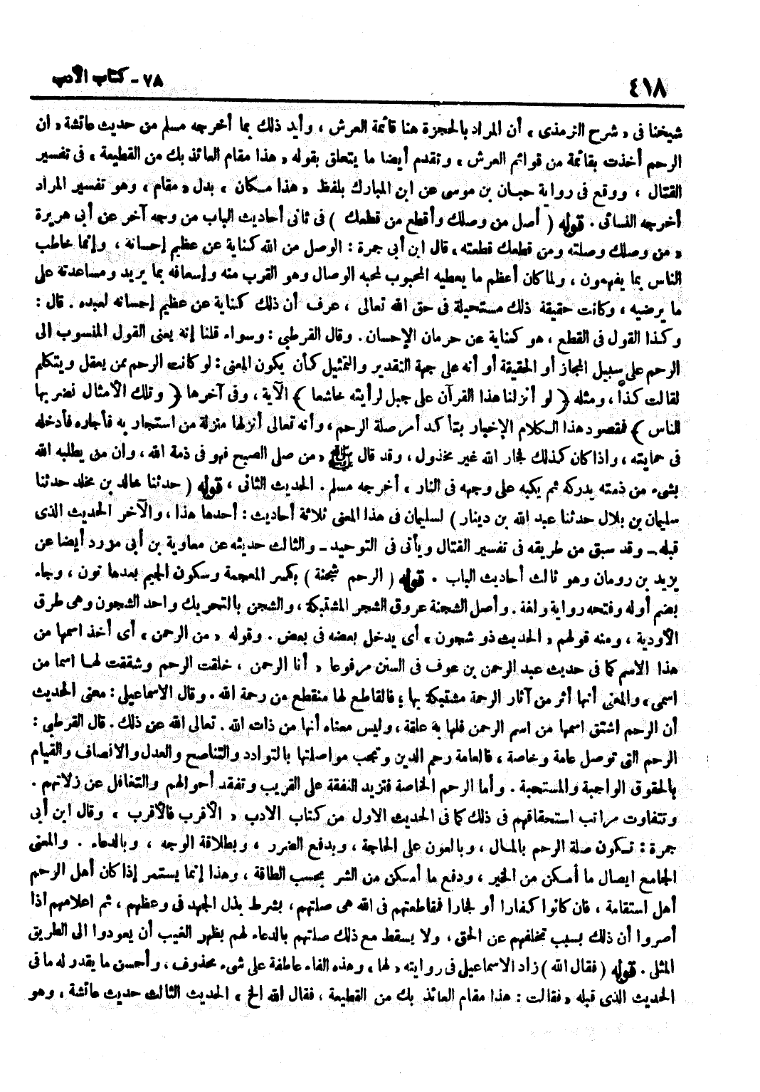 [5988] قَوْلُهُ حَدَّثَنَا خَالِدُ بْنُ مَخْلَدٍ حَدَّثَنَا سُلَيْمَانُ بْنُ بِلَالٍ حَدَّثَنَا عَبْدُ اللَّهِ بْنُ دِينَارٍ لِسُلَيْمَانَ فِي هَذَا الْمَعْنَى ثَلَاثَةُ أَحَادِيثَ أَحَدُهَا هَذَا وَالْآخَرُ الْحَدِيثُ الَّذِي قَبْلَهُ وَقَدْ سَبَقَ مِنْ طَرِيقِهِ فِي تَفْسِيرِ الْقِتَالِ وَيَأْتِي فِي التَّوْحِيد وَالثَّالِث حَدِيثه عَن مُعَاوِيَة بن أبي مزرد أَيْضا عَن يزِيد بن رُومَان وَهُوَ ثَالِث أَحَادِيث الْبَاب قَوْلُهُ الرَّحِمُ شِجْنَةٌ بِكَسْرِ الْمُعْجَمَةِ وَسُكُونِ الْجِيمِ بَعْدَهَا نُونٌ وَجَاءَ بِضَمِّ أَوَّلِهِ وَفَتْحِهِ رِوَايَةً وَلُغَةً وَأَصْلُ الشِّجْنَةِ عُرُوقُ الشَّجَرِ الْمُشْتَبِكَةُ وَالشَّجَنُ بِالتَّحْرِيكِ وَاحِدُ الشُّجُونِ وَهِيَ طُرُقُ الْأَوْدِيَةِ وَمِنْهُ قَوْلُهُمْ الْحَدِيثُ ذُو شُجُونٍ أَيْ يَدْخُلُ بَعْضُهُ فِي بَعْضٍ وَقَوْلُهُ مِنَ الرَّحْمَنِ أَيْ أُخِذَ اسْمُهَا مِنْ هَذَا الِاسْمِ كَمَا فِي حَدِيثِ عَبْدِ الرَّحْمَنِ بْنِ عَوْفٍ فِي السُّنَنِ مَرْفُوعًا أَنَا الرَّحْمَنُ خَلَقْتُ الرَّحِمَ وَشَقَقْتُ لَهَا اسْمًا مِنَ اسْمِي وَالْمَعْنَى أَنَّهَا أَثَرٌ مِنْ أَثَارِ الرَّحْمَةِ مُشْتَبِكَةٌ بِهَا فَالْقَاطِعُ لَهَا مُنْقَطِعٌ مِنْ رَحْمَةِ اللَّهِ وَقَالَ الْإِسْمَاعِيلِيُّ مَعْنَى الْحَدِيثِ أَنَّ الرَّحِمَ اشْتُقَّ اسْمُهَا مِنَ اسْمِ الرَّحْمَنِ فَلَهَا بِهِ عَلَقَةٌ وَلَيْسَ مَعْنَاهُ أَنَّهَا مِنْ ذَاتِ اللَّهِ تَعَالَى اللَّهُ عَنْ ذَلِكَ قَالَ الْقُرْطُبِيُّ الرَّحِمُ الَّتِي تُوصَلُ عَامَّةٌ وَخَاصَّةٌ فَالْعَامَّةُ رَحِمُ الدِّينِ وَتَجِبُ مُوَاصَلَتُهَا بِالتَّوَادُدِ وَالتَّنَاصُحِ وَالْعَدْلِ وَالْإِنْصَافِ وَالْقِيَامِ بِالْحُقُوقِ الْوَاجِبَةِ وَالْمُسْتَحَبَّةِ وَأَمَّا الرَّحِمُ الْخَاصَّةُ فَتَزِيدُ لِلنَّفَقَةِ عَلَى الْقَرِيبِ وَتَفَقُّدِ أَحْوَالِهِمْ وَالتَّغَافُلِ عَنْ زَلَّاتِهِمْ وَتَتَفَاوَتُ مَرَاتِبُ اسْتِحْقَاقِهِمْ فِي ذَلِكَ كَمَا فِي الْحَدِيثِ الْأَوَّلِ مِنْ كِتَابِ الْأَدَبِ الْأَقْرَب فَالْأَقْرَب وَقَالَ بن أَبِي جَمْرَةَ تَكُونُ صِلَةُ الرَّحِمِ بِالْمَالِ وَبِالْعَوْنِ عَلَى الْحَاجَةِ وَبِدَفْعِ الضَّرَرِ وَبِطَلَاقَةِ الْوَجْهِ وَبِالدُّعَاءِ وَالْمَعْنَى الْجَامِعُ إِيصَالُ مَا أَمْكَنَ مِنَ الْخَيْرِ وَدَفْعُ مَا أَمْكَنَ مِنَ الشَّرِّ بِحَسَبِ الطَّاقَةِ وَهَذَا إِنَّمَا يَسْتَمِرُّ إِذَا كَانَ أَهْلُ الرَّحِمِ أَهْلَ اسْتِقَامَةٍ فَإِنْ كَانُوا كُفَّارًا أَوْ فُجَّارًا فَمُقَاطَعَتُهُمْ فِي اللَّهِ هِيَ صِلَتُهُمْ بِشَرْطِ بَذْلِ الْجَهْدِ فِي وَعْظِهِمْ ثُمَّ إِعْلَامِهِمْ إِذَا أَصَرُّوا أَنَّ ذَلِكَ بِسَبَبِ تَخَلُّفِهِمْ عَنِ الْحَقِّ وَلَا يَسْقُطُ مَعَ ذَلِكَ صِلَتُهُمْ بِالدُّعَاءِ لَهُمْ بِظَهْرِ الْغَيْبِ أَنْ يَعُودُوا إِلَى الطَّرِيقِ الْمُثْلَى قَوْلُهُ فَقَالَ اللَّهُ زَادَ الْإِسْمَاعِيلِيُّ فِي رِوَايَتِهِ لَهَا وَهَذِهِ الْفَاءُ عَاطِفَةٌ عَلَى شَيْءٍ مَحْذُوفٍ وَأَحْسَنُ مَا يُقَدَّرُ لَهُ مَا فِي الْحَدِيثِ الَّذِي قَبْلَهُ فَقَالَتْ هَذَا مَقَامُ الْعَائِذِ بِكَ مِنَ الْقَطِيعَةِ فَقَالَ اللَّهُ إِلَخْ الْحَدِيثُ الثَّالِثُ حَدِيثُ عَائِشَة وَهُوَ