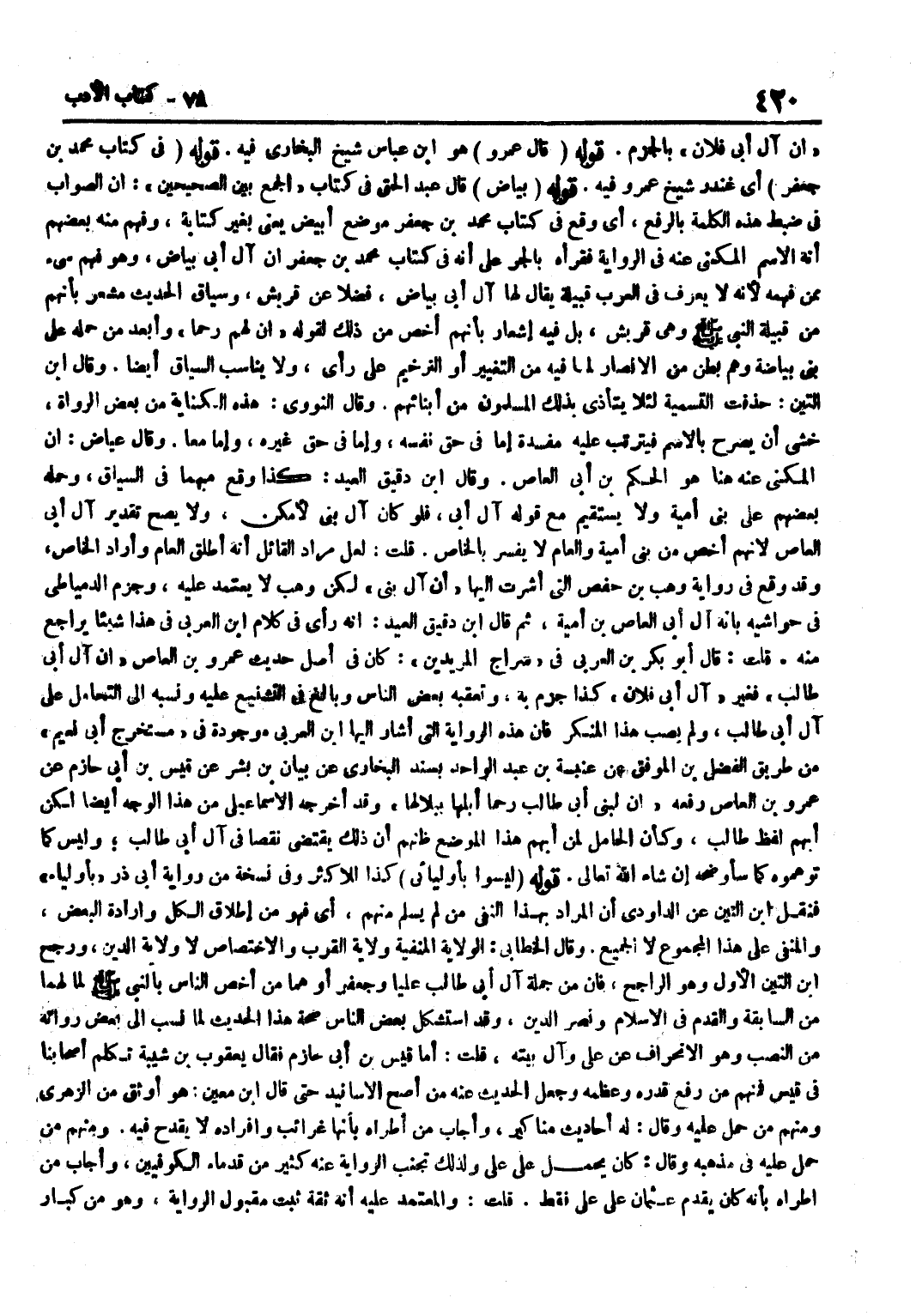 إِنَّ آلَ أَبِي فُلَانٍ بِالْجَزْمِ قَوْلُهُ قَالَ عَمْرو هُوَ بن عَبَّاسٍ شَيْخُ الْبُخَارِيِّ فِيهِ قَوْلُهُ فِي كِتَابِ مُحَمَّدِ بْنِ جَعْفَرٍ أَيْ غُنْدَرٌ شَيْخُ عَمْرٍو فِيهِ قَوْلُهُ بَيَاضٌ قَالَ عَبْدُ الْحَقِّ فِي كِتَابِ الْجَمْعِ بَيْنَ الصَّحِيحَيْنِ إِنَّ الصَّوَابَ فِي ضَبْطِ هَذِهِ الْكَلِمَةِ بِالرَّفْعِ أَيْ وَقَعَ فِي كِتَابِ مُحَمَّدِ بْنِ جَعْفَرٍ مَوْضِعٌ أَبْيَضُ يَعْنِي بِغَيْرِ كِتَابَةٍ وَفَهِمَ مِنْهُ بَعْضُهُمْ أَنَّهُ الِاسْمُ الْمُكَنَّى عَنْهُ فِي الرِّوَايَةِ فَقَرَأَهُ بِالْجَرِّ عَلَى أَنَّهُ فِي كِتَابِ مُحَمَّدِ بْنِ جَعْفَرٍ إِنَّ آل أبي بَيَاض وَهُوَ فهم سيء مِمَّنْ فَهِمَهُ لِأَنَّهُ لَا يُعْرَفُ فِي الْعَرَبِ قَبِيلَةٌ يُقَالُ لَهَا آلُ أَبِي بَيَاضٍ فَضْلًا عَنْ قُرَيْشٍ وَسِيَاقُ الْحَدِيثِ مُشْعِرٌ بِأَنَّهُمْ مِنْ قَبِيلَةِ النَّبِيِّ صَلَّى اللَّهُ عَلَيْهِ وَسَلَّمَ وَهِيَ قُرَيْشٌ بَلْ فِيهِ إِشْعَارٌ بِأَنَّهُمْ أَخَصُّ مِنْ ذَلِكَ لِقَوْلِهِ إِنَّ لَهُمْ رَحِمًا وَأَبْعَدَ مَنْ حَمَلَهُ عَلَى بَنِي بَيَاضَةَ وَهُمْ بَطْنٌ مِنَ الْأَنْصَارِ لِمَا فِيهِ مِنَ التَّغْيِيرِ أَوِ التَّرْخِيمِ عَلَى رَأْيٍ وَلَا يُنَاسِبُ السِّيَاقَ أَيْضًا وَقَالَ بن التِّينِ حُذِفَتِ التَّسْمِيَةُ لِئَلَّا يَتَأَذَّى بِذَلِكَ الْمُسْلِمُونَ مِنْ أَبْنَائِهِمْ وَقَالَ النَّوَوِيُّ هَذِهِ الْكِنَايَةُ مِنْ بَعْضِ الرُّوَاةِ خَشِيَ أَنْ يُصَرِّحَ بِالِاسْمِ فَيَتَرَتَّبَ عَلَيْهِ مَفْسَدَةٌ إِمَّا فِي حَقِّ نَفْسِهِ وَإِمَّا فِي حَقِّ غَيْرِهِ وَإِمَّا مَعًا وَقَالَ عِيَاضٌ إِنَّ الْمَكْنِيَّ عَنْهُ هُنَا هُوَ الْحَكَمُ بْنُ أبي الْعَاصِ وَقَالَ بن دَقِيقِ الْعِيدِ كَذَا وَقَعَ مُبْهَمًا فِي السِّيَاقِ وَحَمَلَهُ بَعْضُهُمْ عَلَى بَنِي أُمَيَّةَ وَلَا يَسْتَقِيمُ مَعَ قَوْلِهِ آلَ أَبِي فَلَوْ كَانَ آلَ بَنِي لَأَمْكَنَ وَلَا يَصِحُّ تَقْدِيرُ آلِ أَبِي الْعَاصِ لِأَنَّهُمْ أَخَصُّ مِنْ بَنِي أُمَيَّةَ وَالْعَامُّ لَا يُفَسَّرُ بِالْخَاصِّ قُلْتُ لَعَلَّ مُرَادَ الْقَائِلِ أَنَّهُ أَطْلَقَ الْعَامَّ وَأَرَادَ الْخَاصَّ وَقَدْ وَقَعَ فِي رِوَايَةِ وَهْبِ بْنِ حَفْصٍ الَّتِي أَشَرْتُ إِلَيْهَا أَنَّ آلَ بَنِي لَكِنْ وَهْبٌ لَا يُعْتَمَدُ عَلَيْهِ وَجَزَمَ الدِّمْيَاطِيُّ فِي حَوَاشِيهِ بِأَنَّهُ آلُ أَبِي الْعَاصِ بْنِ أُمَيَّةَ ثُمَّ قَالَ بن دَقِيق الْعِيد أَنه رأى فِي كَلَام بن الْعَرَبِيِّ فِي هَذَا شَيْئًا يُرَاجَعُ مِنْهُ قُلْتُ قَالَ أَبُو بَكْرِ بْنُ الْعَرَبِيِّ فِي سِرَاجِ الْمُرِيدِينَ كَانَ فِي أَصْلِ حَدِيثِ عَمْرِو بْنِ الْعَاصِ أَنَّ آلَ أَبِي طَالِبٍ فَغَيَّرَ آلَ أَبِي فُلَانٍ كَذَا جَزَمَ بِهِ وَتَعَقَّبَهُ بَعْضُ النَّاس وَبَالغ فِي التشنيع عَلَيْهِ وَنَسَبَهُ إِلَى التَّحَامُلِ عَلَى آلِ أَبِي طَالِبٍ وَلَمْ يُصِبْ هَذَا الْمُنْكِرُ فَإِنَّ هَذِهِ الرِّوَايَةَ الَّتِي أَشَارَ إِلَيْهَا بن الْعَرَبِيِّ مَوْجُودَةٌ فِي مُسْتَخْرَجِ أَبِي نُعَيْمٍ مِنْ طَرِيقِ الْفَضْلِ بْنِ الْمُوَفَّقِ عَنْ عَنْبَسَةَ بْنِ عَبْدِ الْوَاحِدِ بِسَنَدِ الْبُخَارِيِّ عَنْ بَيَانِ بْنِ بِشْرٍ عَنْ قَيْسِ بْنِ أَبِي حَازِمٍ عَنْ عَمْرِو بْنِ الْعَاصِ رَفَعَهُ إِنَّ لِبَنِي أَبِي طَالِبٍ رَحِمًا أَبُلُّهَا بِبَلَالِهَا وَقَدْ أَخْرَجَهُ الْإِسْمَاعِيلِيُّ مِنْ هَذَا الْوَجْهِ أَيْضًا لَكِنْ أَبْهَمَ لَفْظَ طَالِبٍ وَكَأَنَّ الْحَامِلَ لِمَنْ أَبْهَمَ هَذَا الْمَوْضِعَ ظَنُّهُمْ أَنَّ ذَلِكَ يَقْتَضِي نَقْصًا فِي آلِ أَبِي طَالِبٍ وَلَيْسَ كَمَا تَوَهَّمُوهُ كَمَا سَأُوَضِّحُهُ إِنْ شَاءَ اللَّهُ تَعَالَى قَوْلُهُ لَيْسُوا بِأَوْ