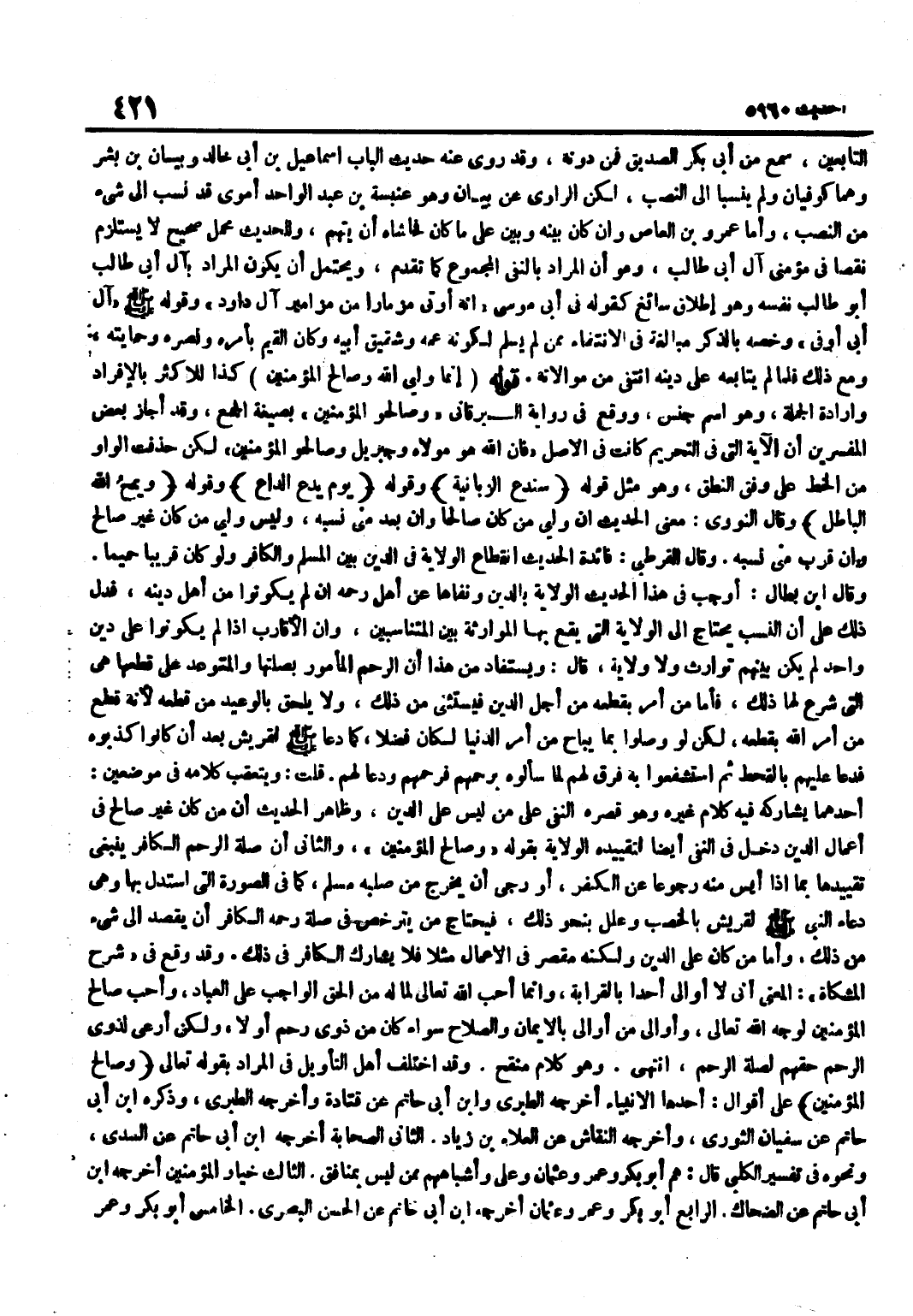 التَّابِعِينَ سَمِعَ مِنْ أَبِي بَكْرٍ الصِّدِّيقِ فَمَنْ دُونَهُ وَقَدْ رَوَى عَنْهُ حَدِيثَ الْبَابِ إِسْمَاعِيلُ بْنُ أَبِي خَالِدٍ وَبَيَانُ بْنُ بِشْرٍ وَهُمَا كُوفِيَّانِ وَلَمْ يُنْسَبَا إِلَى النَّصْبِ لَكِنَّ الرَّاوِي عَنْ بَيَانٍ وَهُوَ عَنْبَسَةُ بْنُ عَبْدِ الْوَاحِدِ أُمَوِيٌّ قَدْ نُسِبَ إِلَى شَيْءٍ مِنَ النَّصْبِ وَأَمَّا عَمْرُو بْنُ الْعَاصِ وَإِنْ كَانَ بَيْنَهُ وَبَيْنَ عَلِيٍّ مَا كَانَ فَحَاشَاهُ أَنْ يُتَّهَمَ وَلِلْحَدِيثِ مَحْمَلٌ صَحِيحٌ لَا يَسْتَلْزِمُ نَقْصًا فِي مُؤْمِنِي آلِ أَبِي طَالِبٍ وَهُوَ أَنَّ الْمُرَادَ بِالنَّفْيِ الْمَجْمُوعُ كَمَا تَقَدَّمَ وَيَحْتَمِلُ أَنْ يَكُونَ الْمُرَادَ بِآلِ أَبِي طَالِبٍ أَبُو طَالِبٍ نَفْسُهُ وَهُوَ إِطْلَاقٌ سَائِغٌ كَقَوْلِهِ فِي أَبِي مُوسَى أَنَّهُ أُوتِيَ مِزْمَارًا مِنْ مَزَامِيرِ آلِ دَاوُدَ وَقَوْلُهُ صَلَّى اللَّهُ عَلَيْهِ وَسَلَّمَ آلُ أَبِي أَوْفَى وَخَصَّهُ بِالذِّكْرِ مُبَالَغَةً فِي الِانْتِفَاءِ مِمَّنْ لَمْ يُسْلِمْ لِكَوْنِهِ عَمَّهُ وَشَقِيقَ أَبِيهِ وَكَانَ الْقَيِّمَ بِأَمْرِهِ وَنَصْرِهِ وَحِمَايَتِهِ وَمَعَ ذَلِكَ فَلَمَّا لَمْ يُتَابِعْهُ عَلَى دِينِهِ انْتَفَى مِنْ مُوَالَاتِهِ قَوْلُهُ إِنَّمَا وَلِيِّيَ اللَّهُ وَصَالِحُ الْمُؤْمِنِينَ كَذَا لِلْأَكْثَرِ بِالْإِفْرَادِ وَإِرَادَةِ الْجُمْلَةِ وَهُوَ اسْمُ جِنْسٍ وَوَقَعَ فِي رِوَايَةِ الْبَرْقَانِيِّ وَصَالِحُو الْمُؤْمِنِينَ بِصِيغَةِ الْجَمْعِ وَقَدْ أَجَازَ بَعْضُ الْمُفَسِّرِينَ أَنَّ الْآيَةَ الَّتِي فِي التَّحْرِيمِ كَانَتْ فِي الْأَصْلِ فَإِنَّ اللَّهَ هُوَ مَوْلَاهُ وَجِبْرِيلُ وَصَالِحُو الْمُؤْمِنِينَ لَكِنْ حُذِفَتِ الْوَاوُ مِنَ الْخَطِّ عَلَى وَفْقِ النُّطْقِ وَهُوَ مثل قَوْله سَنَدع الزَّبَانِيَة وَقَوله يَوْم يدع الداع وَقَوله ويمح الله الْبَاطِل وَقَالَ النَّوَوِيّ معنى الحَدِيث ان ولي مَنْ كَانَ صَالِحًا وَإِنْ بَعُدَ مِنِّي نَسَبُهُ وَلَيْسَ وَلِيِّيَ مَنْ كَانَ غَيْرَ صَالِحٍ وَإِنْ قَرُبَ مِنِّي نَسَبُهُ وَقَالَ الْقُرْطُبِيُّ فَائِدَةُ الْحَدِيثِ انْقِطَاعُ الْوِلَايَةِ فِي الدِّينِ بَيْنَ الْمُسْلِمِ وَالْكَافِرِ وَلَو كَانَ قَرِيبا حميما وَقَالَ بن بَطَّالٍ أَوْجَبَ فِي هَذَا الْحَدِيثِ الْوِلَايَةَ بِالدِّينِ وَنَفَاهَا عَنْ أَهْلِ رَحِمِهِ إِنْ لَمْ يَكُونُوا مِنْ أَهْلِ دِينِهِ فَدَلَّ ذَلِكَ عَلَى أَنَّ النَّسَبَ يَحْتَاجُ إِلَى الْوِلَايَةِ الَّتِي يَقَعُ بِهَا الْمُوَارَثَةُ بَيْنَ الْمُتَنَاسِبِينَ وَأَنَّ الْأَقَارِبَ إِذَا لَمْ يَكُونُوا عَلَى دِينٍ وَاحِدٍ لَمْ يَكُنْ بَيْنَهُمْ تَوَارُثٌ وَلَا وِلَايَةٌ قَالَ وَيُسْتَفَادُ مِنْ هَذَا أَنَّ الرَّحِمَ الْمَأْمُورَ بِصِلَتِهَا وَالْمُتَوَعَّدَ عَلَى قَطْعِهَا هِيَ الَّتِي شُرِعَ لَهَا ذَلِكَ فَأَمَّا مَنْ أُمِرَ بِقَطْعِهِ مِنْ أَجْلِ الدِّينِ فَيُسْتَثْنَى مِنْ ذَلِكَ وَلَا يَلْحَقُ بِالْوَعِيدِ مَنْ قَطَعَهُ لِأَنَّهُ قَطَعَ مَنْ أَمَرَ اللَّهُ بِقَطْعِهِ لَكِنْ لَوْ وَصَلُوا بِمَا يُبَاحُ مِنْ أَمْرِ الدُّنْيَا لَكَانَ فَضْلًا كَمَا دَعَا صَلَّى اللَّهُ عَلَيْهِ وَسَلَّمَ لِقُرَيْشٍ بَعْدَ أَنْ كَانُوا كَذَّبُوهُ فَدَعَا عَلَيْهِمْ بِالْقَحْطِ ثُمَّ اسْتَشْفَعُوا بِهِ فَرَقَّ لَهُمْ لَمَّا سَأَلُوهُ بِرَحِمِهِمْ فَرَحِمَهُمْ وَدَعَا لَهُمْ قُلْتُ وَيُتَعَقَّبُ كَلَامُهُ فِي مَوْضِعَيْنِ أَحَدُهُمَا يُشَارِكُهُ فِيهِ كَلَامُ غَيْرِهِ وَهُوَ قَصْرُهُ النَّفْيَ عَلَى مَنْ لَيْسَ عَلَى الدِّينِ وَظَاهِرُ الْحَدِيثِ أَنَّ مَنْ كَانَ غَيْرَ صَالِحٍ فِي أَعْمَالِ الدِّينِ دَخَلَ فِي النَّفْيِ أَيْضًا لِتَقْيِيدِ