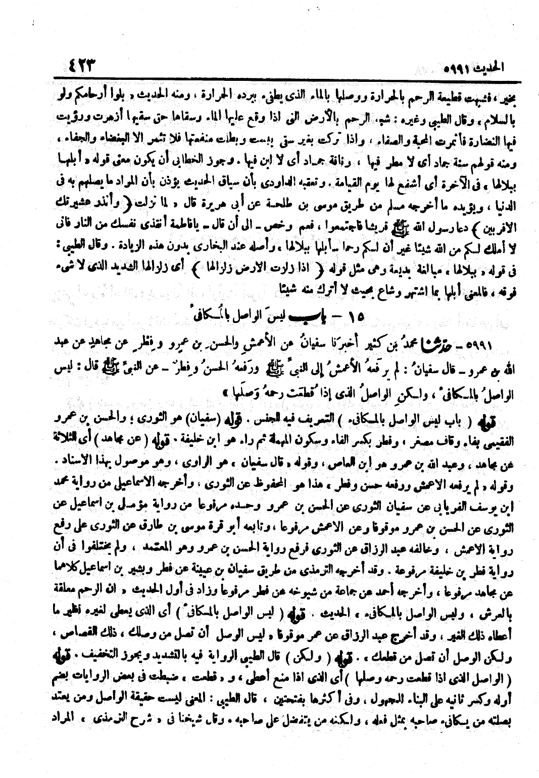 [5991] قَوْلُهُ سُفْيَانُ هُوَ الثَّوْرِيُّ وَالْحَسَنُ بْنُ عَمْرٍو الْفُقَيْمِيُّ بِفَاءٍ وَقَافٍ مُصَغَّرٌ وَفِطْرٌ بِكَسْرِ الْفَاء وَسُكُون الْمُهْملَة ثمَّ رَاء هُوَ بن خَلِيفَةَ قَوْلُهُ عَنْ مُجَاهِدٍ أَيِ الثَّلَاثَةُ عَنْ مُجَاهِد وَعبد الله بن عَمْرو هُوَ بن الْعَاصِ وَقَوْلُهُ قَالَ سُفْيَانُ هُوَ الرَّاوِي وَهُوَ مَوْصُولٌ بِهَذَا الْإِسْنَادِ وَقَوْلُهُ لَمْ يَرْفَعْهُ الْأَعْمَشُ وَرَفْعُهُ حَسَنٌ وَفِطْرٌ هَذَا هُوَ الْمَحْفُوظُ عَنِ الثَّوْرِيِّ وَأَخْرَجَهُ الْإِسْمَاعِيلِيُّ مِنْ رِوَايَةِ مُحَمَّدِ بْنِ يُوسُفَ الْفِرْيَابِيِّ عَنْ سُفْيَانَ الثَّوْرِيِّ عَنِ الْحَسَنِ بْنِ عَمْرٍو وَحْدَهُ مَرْفُوعًا مِنْ رِوَايَةِ مُؤَمِّلِ بْنِ إِسْمَاعِيلَ عَنِ الثَّوْرِيِّ عَنِ الْحَسَنِ بْنِ عَمْرٍو مَوْقُوفًا وَعَنِ الْأَعْمَشِ مَرْفُوعًا وَتَابَعَهُ أَبُو قُرَّةَ مُوسَى بْنُ طَارِقٍ عَنِ الثَّوْرِيِّ عَلَى رَفْعِ رِوَايَةِ الْأَعْمَشِ وَخَالَفَهُ عَبْدُ الرَّزَّاقِ عَنِ الثَّوْرِيِّ فَرَفَعَ رِوَايَةَ الْحَسَنِ بْنِ عَمْرٍو وَهُوَ الْمُعْتَمَدُ وَلَمْ يَخْتَلِفُوا فِي أَنَّ رِوَايَةَ فِطْرِ بْنِ خَلِيفَةَ مَرْفُوعَةٌ وَقَدْ أَخْرَجَهُ التِّرْمِذِيُّ مِنْ طَرِيقِ سُفْيَانَ بْنِ عُيَيْنَةَ عَنْ فِطْرٍ وَبَشِيرِ بْنِ إِسْمَاعِيلَ كِلَاهُمَا عَنْ مُجَاهِدٍ مَرْفُوعًا وَأَخْرَجَهُ أَحْمَدُ عَنْ جَمَاعَةٍ مِنْ شُيُوخِهِ عَنْ فِطْرٍ مَرْفُوعًا وَزَادَ فِي أَوَّلِ الْحَدِيثِ إِنَّ الرَّحِمَ مُعَلَّقَةٌ بِالْعَرْشِ وَلَيْسَ الْوَاصِلُ بِالْمُكَافِئِ الْحَدِيثَ قَوْلُهُ لَيْسَ الْوَاصِلُ بِالْمُكَافِئِ أَيِ الَّذِي يُعْطِي لِغَيْرِهِ نَظِيرَ مَا أَعْطَاهُ ذَلِكَ الْغَيْرُ وَقَدْ أَخْرَجَ عَبْدُ الرَّزَّاقِ عَنْ عُمَرَ مَوْقُوفًا لَيْسَ الْوَصْلُ أَنْ تَصِلَ مَنْ وَصَلَكَ ذَلِكَ الْقِصَاصُ وَلَكِنَّ الْوَصْلَ أَنْ تَصِلَ مَنْ قَطَعَكَ قَوْلُهُ وَلَكِنَّ قَالَ الطِّيبِيُّ الرِّوَايَةُ فِيهِ بِالتَّشْدِيدِ وَيَجُوزُ التَّخْفِيفُ قَوْلُهُ الْوَاصِلُ الَّذِي إِذَا قُطِعَتْ رَحِمَهُ وَصَلَهَا أَي الَّذِي إِذا منع أعْطى وَقطعت ضُبِطَتْ فِي بَعْضِ الرِّوَايَاتِ بِضَمِّ أَوَّلِهِ وَكَسْرِ ثَانِيهِ عَلَى الْبِنَاءِ لِلْمَجْهُولِ وَفِي أَكْثَرِهَا بِفَتْحَتَيْنِ قَالَ الطِّيبِيُّ الْمَعْنَى لَيْسَتْ حَقِيقَةُ الْوَاصِلِ وَمَنْ يُعْتَدُّ بِصِلَتِهِ مَنْ يُكَافِئُ صَاحِبَهُ بِمِثْلِ فِعْلِهِ وَلَكِنَّهُ مَنْ يَتَفَضَّلُ عَلَى صَاحِبِهِ وَقَالَ شَيْخُنَا فِي شَرْحِ التِّرْمِذِيِّ الْمُرَادُ