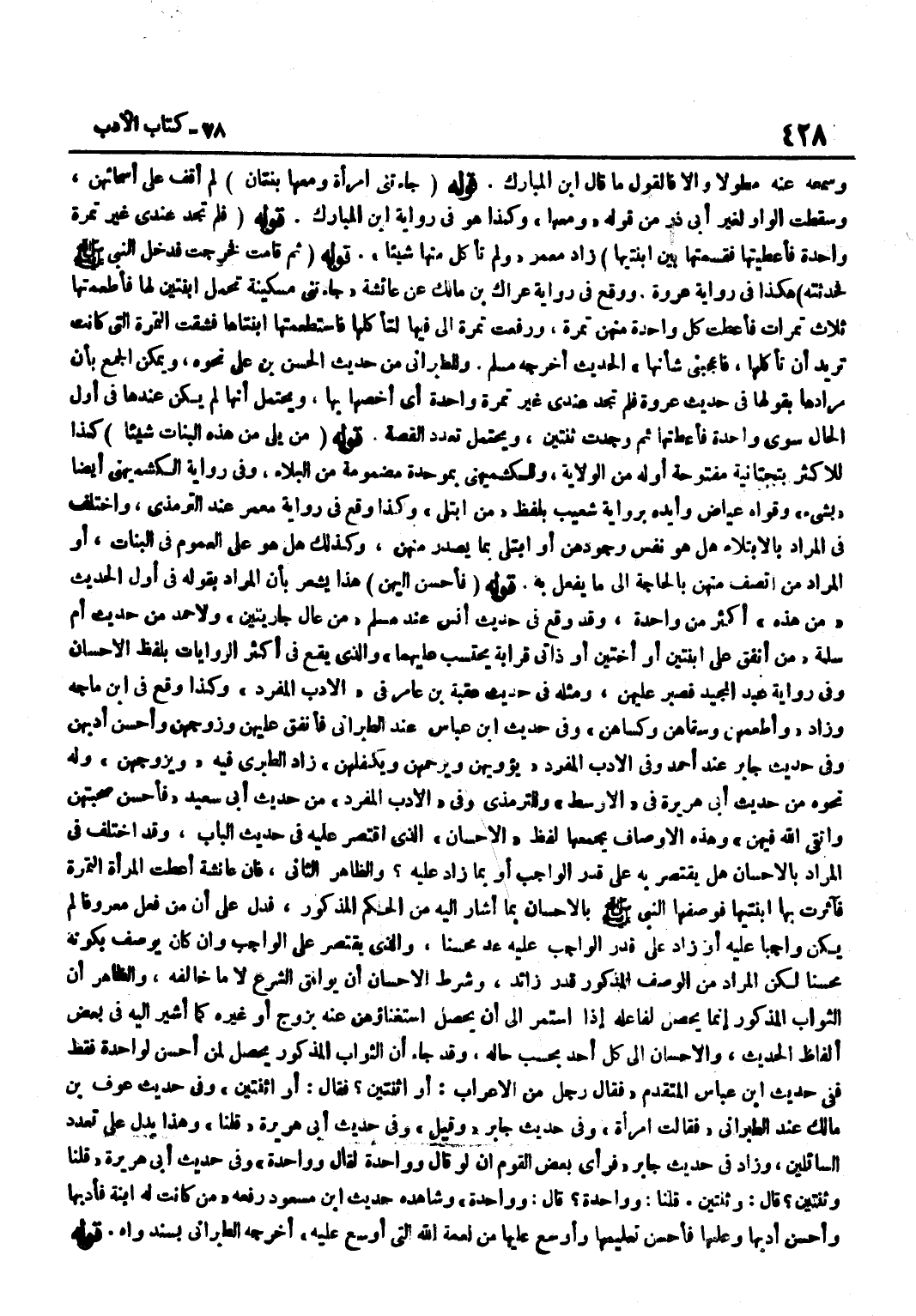 وَسَمِعَهُ عَنْهُ مُطَوَّلًا وَإِلَّا فَالْقَوْلُ مَا قَالَ بن الْمُبَارَكِ قَوْلُهُ جَاءَتْنِي امْرَأَةٌ وَمَعَهَا بِنْتَانِ لَمْ أَقِفْ عَلَى أَسْمَائِهِنَّ وَسَقَطَتِ الْوَاوُ لِغَيْرِ أَبِي ذَرٍّ مِنْ قَوْلِهِ وَمَعَهَا وَكَذَا هُوَ فِي رِوَايَة بن الْمُبَارَكِ قَوْلُهُ فَلَمْ تَجِدْ عِنْدِي غَيْرَ تَمْرَةٍ وَاحِدَةٍ فَأَعْطَيْتُهَا فَقَسَمَتْهَا بَيْنَ ابْنَتَيْهَا زَادَ مَعْمَرٌ وَلَمْ تَأْكُلْ مِنْهَا شَيْئًا قَوْلُهُ ثُمَّ قَامَتْ فَخَرَجَتْ فَدَخَلَ النَّبِيُّ صَلَّى اللَّهُ عَلَيْهِ وَسَلَّمَ فَحَدَّثْتُهُ هَكَذَا فِي رِوَايَةِ عُرْوَةَ وَوَقَعَ فِي رِوَايَةِ عِرَاكِ بْنِ مَالِكٍ عَنْ عَائِشَةَ جَاءَتْنِي مِسْكِينَةٌ تَحْمِلُ ابْنَتَيْنِ لَهَا فَأَطْعَمْتُهَا ثَلَاثَ تَمَرَاتٍ فَأَعْطَتْ كُلَّ وَاحِدَةٍ مِنْهُنَّ تَمْرَةً وَرَفَعَتْ تَمْرَةً إِلَى فِيهَا لتأكلها فاستطعمتها ابنتاها فشقت التَّمْرَةَ الَّتِي كَانَتْ تُرِيدُ أَنْ تَأْكُلَهَا فَأَعْجَبَنِي شَأْنُهَا الْحَدِيثَ أَخْرَجَهُ مُسْلِمٌ وَلِلطَّبَرَانِيِّ مِنْ حَدِيثِ الْحَسَنِ بْنِ عَلِيٍّ نَحْوِهِ وَيُمْكِنُ الْجَمْعُ بِأَنَّ مرادها بقولِهَا فِي حَدِيثِ عُرْوَةَ فَلَمْ تَجِدْ عِنْدِي غَيْرَ تَمْرَةٍ وَاحِدَةٍ أَيْ أَخُصُّهَا بِهَا وَيَحْتَمِلُ أَنَّهَا لَمْ يَكُنْ عِنْدَهَا فِي أَوَّلِ الْحَالِ سِوَى وَاحِدَةٍ فَأَعْطَتْهَا ثُمَّ وَجَدَتْ ثِنْتَيْنِ وَيُحْتَمَلُ تَعَدُّدُ الْقِصَّةِ قَوْلُهُ مَنْ يَلِي مِنْ هَذِهِ الْبَنَاتِ شَيْئًا كَذَا لِلْأَكْثَرِ بِتَحْتَانِيَّةٍ مَفْتُوحَةٍ أَوَّلَهُ مِنَ الْوِلَايَةِ وَلِلْكُشْمِيهَنِيِّ بِمُوَحَّدَةٍ مَضْمُومَةٍ مِنَ الْبَلَاءِ وَفِي رِوَايَةِ الْكُشْمِيهَنِيِّ أَيْضًا بِشَيْءٍ وَقَوَّاهُ عِيَاضٌ وَأَيَّدَهُ بِرِوَايَةِ شُعَيْبٍ بِلَفْظِ مَنِ ابْتُلِيَ وَكَذَا وَقَعَ فِي رِوَايَةِ مَعْمَرٍ عِنْدَ التِّرْمِذِيِّ وَاخْتُلِفَ فِي الْمُرَادِ بِالِابْتِلَاءِ هَلْ هُوَ نَفْسُ وُجُودِهِنَّ أَوِ ابْتُلِيَ بِمَا يَصْدُرُ مِنْهُنَّ وَكَذَلِكَ هَلْ هُوَ عَلَى الْعُمُومِ فِي الْبَنَاتِ أَوِ الْمُرَادُ مَنِ اتَّصَفَ مِنْهُنَّ بِالْحَاجَةِ إِلَى مَا يُفْعَلُ بِهِ قَوْلُهُ فَأَحْسَنَ إِلَيْهِنَّ هَذَا يُشْعِرُ بِأَنَّ الْمُرَادَ بِقَوْلِهِ فِي أَوَّلِ الْحَدِيثِ مِنْ هَذِهِ أَكْثَرُ مِنْ وَاحِدَةٍ وَقَدْ وَقَعَ فِي حَدِيثِ أَنَسٍ عِنْدَ مُسْلِمٍ مَنْ عَالَ جَارِيَتَيْنِ وَلِأَحْمَدَ مِنْ حَدِيثِ أُمِّ سَلَمَةَ مَنْ أَنْفَقَ عَلَى ابْنَتَيْنِ أَوْ أُخْتَيْنِ أَوْ ذَاتَيْ قَرَابَةٍ يَحْتَسِبُ عَلَيْهِمَا وَالَّذِي يَقَعُ فِي أَكْثَرِ الرِّوَايَاتِ بِلَفْظِ الْإِحْسَانِ وَفِي رِوَايَةِ عَبْدِ الْمَجِيدِ فَصَبَرَ عَلَيْهِنَّ وَمِثْلُهُ فِي حَدِيثِ عُقْبَةَ بْنِ عَامِرٍ فِي الْأَدَبِ الْمُفْرد وَكَذَا وَقع فِي بن مَاجَهْ وَزَادَ وَأَطْعَمَهُنَّ وَسَقَاهُنَّ وَكَسَاهُنَّ وَفِي حَدِيثِ بن عَبَّاسٍ عِنْدَ الطَّبَرَانِيِّ فَأَنْفَقَ عَلَيْهِنَّ وَزَوَّجَهُنَّ وَأَحْسَنَ أَدَبَهُنَّ وَفِي حَدِيثِ جَابِرٍ عِنْدَ أَحْمَدَ وَفِي الْأَدَبِ الْمُفْرَدِ يُؤْوِيهِنَّ وَيَرْحَمُهُنَّ وَيَكْفُلُهُنَّ زَادَ الطَّبَرِيُّ فِيهِ وَيُزَوِّجُهُنَّ وَلَهُ نَحْوُهُ مِنْ حَدِيثِ أَبِي هُرَيْرَةَ فِي الْأَوْسَطِ وَلِلتِّرْمِذِيِّ وَفِي الْأَدَبِ الْمُفْرَدِ مِنْ حَدِيثِ أَبِي سَعِيدٍ فَأَحْسَنَ صُحْبَتَهُنَّ وَاتَّقَى اللَّهَ فِيهِنَّ وَهَذِهِ الْأَوْصَافُ يَجْمَعُهَا لَفْظُ الْإِحْسَانِ الَّذِي اقْتَصَرَ عَلَيْهِ فِي حَدِيثِ الْبَابِ وَقَدِ اخْتُلِفَ فِي الْمُرَادِ بِالْإِحْسَانِ هَلْ يَقْتَصِرُ بِهِ عَلَى قَدْرِ الْوَاجِبِ أَوْ بِمَا زَادَ عَلَيْهِ وَالظَّ