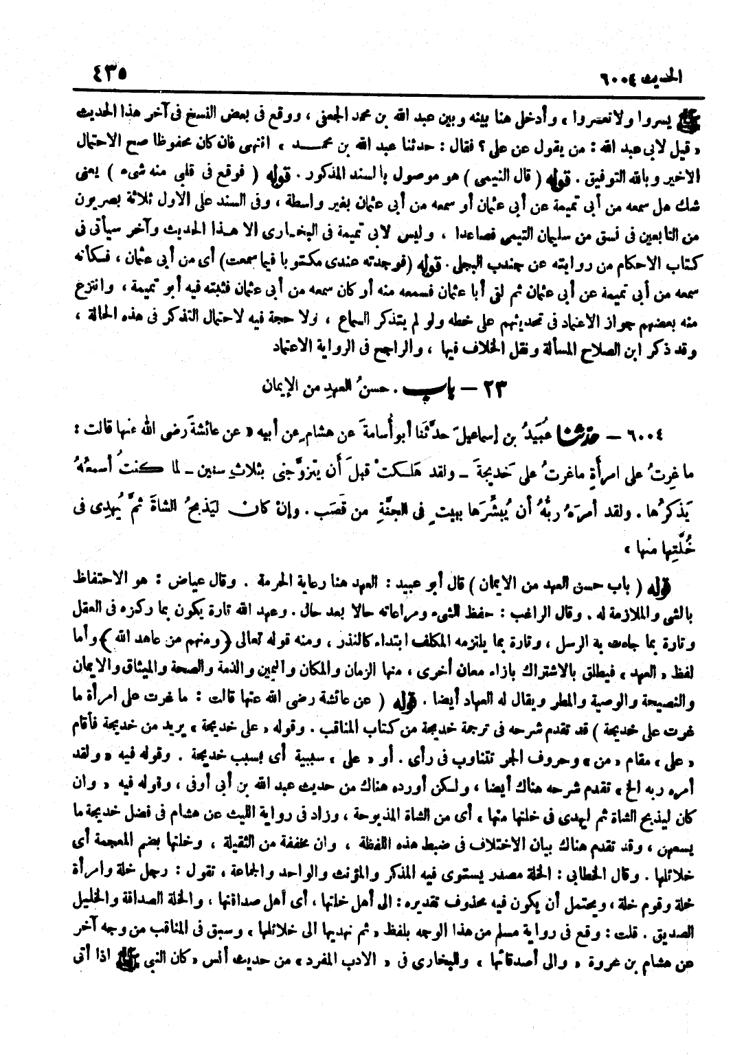 [6004] قَوْلُهُ عَنْ عَائِشَةَ رَضِيَ اللَّهُ عَنْهَا قَالَتْ مَا غِرْتُ عَلَى امْرَأَةٍ مَا غِرْتُ عَلَى خَدِيجَةَ قَدْ تَقَدَّمَ شَرْحُهُ فِي تَرْجَمَةِ خَدِيجَةَ مِنْ كِتَابِ الْمَنَاقِبِ وَقَوْلُهُ عَلَى خَدِيجَةَ يُرِيدُ مِنْ خَدِيجَةَ فَأَقَامَ عَلَى مَقَامَ مِنْ وَحُرُوفُ الْجَرِّ تَتَنَاوَبُ فِي رَأْيٍ أَوْ عَلَى سَبَبِيَّةٌ أَيْ بِسَبَبِ خَدِيجَةَ وَقَوْلُهُ فِيهِ وَلَقَدْ أَمَرَهُ رَبُّهُ إِلَخْ تَقَدَّمَ شَرْحُهُ هُنَاكَ أَيْضًا وَلَكِنْ أَوْرَدَهُ هُنَاكَ مِنْ حَدِيثِ عَبْدِ اللَّهِ بْنِ أَبِي أَوْفَى وَقَوْلُهُ فِيهِ وَإِنْ كَانَ لَيَذْبَحُ الشَّاةَ ثُمَّ لِيُهْدِيَ فِي خُلَّتِهَا مِنْهَا أَيْ مِنَ الشَّاةِ الْمَذْبُوحَةِ وَزَادَ فِي رِوَايَةِ اللَّيْثِ عَنْ هِشَامٍ فِي فَضْلِ خَدِيجَةَ مَا يَسَعُهُنَّ وَقَدْ تَقَدَّمَ هُنَاكَ بَيَانُ الِاخْتِلَافِ فِي ضَبْطِ هَذِهِ اللَّفْظَةِ وَإِنْ مُخَفَّفَةٌ مِنَ الثَّقِيلَةِ وَخُلَّتُهَا بِضَمِّ الْمُعْجَمَةِ أَيْ خَلَائِلُهَا وَقَالَ الْخَطَّابِيُّ الْخُلَّةُ مَصْدَرٌ يَسْتَوِي فِيهِ الْمُذَكَّرُ وَالْمُؤَنَّثُ وَالْوَاحِدُ وَالْجَمَاعَةُ تَقُولُ رَجُلٌ خُلَّةٌ وَامْرَأَةٌ خُلَّةٌ وَقَوْمٌ خُلَّةٌ وَيَحْتَمِلُ أَنْ يَكُونَ فِيهِ مَحْذُوفٌ تَقْدِيرُهُ إِلَى أَهْلِ خُلَّتِهَا أَيْ أَهْلِ صَدَاقَتِهَا وَالْخُلَّةُ الصَّدَاقَةُ وَالْخَلِيلُ الصَّدِيقُ قُلْتُ وَقَعَ فِي رِوَايَةَ مُسْلِمٍ مِنْ هَذَا الْوَجْهِ بِلَفْظِ ثُمَّ نُهْدِيهَا إِلَى خَلَائِلِهَا وَسَبَقَ فِي الْمَنَاقِبِ مِنْ وَجْهٍ آخَرَ عَنْ هِشَامِ بْنِ عُرْوَةَ وَإِلَى أَصْدِقَائِهَا وَلِلْبُخَارِيِّ فِي الْأَدَبِ الْمُفْرَدِ مِنْ حَدِيثِ أَنَسٍ كَانَ النَّبِيُّ صَلَّى اللَّهُ عَلَيْهِ وَسَلَّمَ إِذَا أَتَى