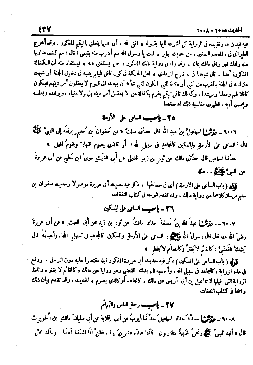أَيْ فِي مَصَالِحِهَا ذَكَرَ فِيهِ حَدِيثَ أَبِي هُرَيْرَةَ مَوْصُولًا وَحَدِيثَ صَفْوَانَ بْنِ سُلَيْمٍ مُرْسَلًا كِلَاهُمَا مِنْ رِوَايَةِ مَالِكٍ وَقَدْ تَقَدَّمَ شَرْحُهُ فِي كِتَابِ النَّفَقَات قَوْلُهُ بَابُ السَّاعِي عَلَى الْمِسْكِينِ ذَكَرَ فِيهِ حَدِيثَ أَبِي هُرَيْرَةَ الْمَذْكُورَ قَبْلَهُ مُقْتَصِرًا عَلَيْهِ دُونَ الْمُرْسَلِ وَوَقَعَ فِي هَذِهِ الرِّوَايَةِ كَالْمُجَاهِدِ فِي سَبِيلِ اللَّهِ وَأَحْسِبُهُ قَالَ يَشُكُّ الْقَعْنَبِيُّ وَهُوَ رِوَايَةٌ عَنْ مَالِكٍ كَالْقَائِمِ لَا يَفْتُرُ وَلَفْظُ الرِّوَايَةِ الَّتِي قَبْلَهَا لِإِسْمَاعِيلَ بْنِ أَبِي أُوَيْسٍ عَنْ مَالِكٍ كَالْمُجَاهِدِ أَوْ كَالَّذِي يَصُومُ الْحَدِيثَ وَقَدْ تَقَدَّمَ بَيَانُ ذَلِكَ وَاضِحًا فِي كتاب النَّفَقَات