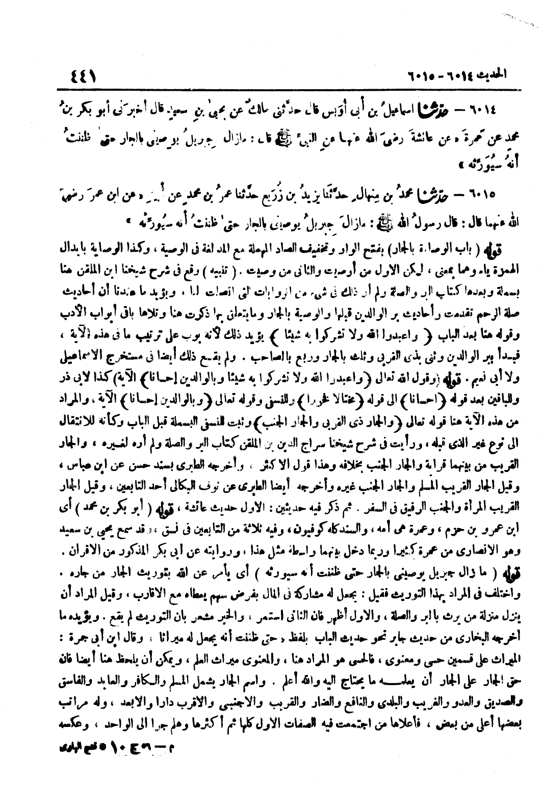 [6014] قَوْلُهُ أَبُو بَكْرِ بْنُ مُحَمَّد أَي بن عَمْرِو بْنِ حَزْمٍ وَعَمْرَةُ هِيَ أُمُّهُ وَالسَّنَدُ كُلُّهُ كُوفِيُّونَ وَفِيهِ ثَلَاثَةٌ مِنَ التَّابِعِينَ فِي نَسَقٍ وَقَدْ سَمِعَ يَحْيَى بْنُ سَعِيدٍ وَهُوَ الْأَنْصَارِيُّ مِنْ عَمْرَةَ كَثِيرًا وَرُبَّمَا دَخَلَ بَيْنَهُمَا وَاسِطَةً مِثْلَ هَذَا وَرِوَايَتُهُ عَنْ أَبِي بَكْرٍ الْمَذْكُورِ مِنَ الْأَقْرَانِ قَوْلُهُ مَا زَالَ جِبْرِيلُ يُوصِينِي بِالْجَارِ حَتَّى ظَنَنْتُ أَنَّهُ سَيُوَرِّثُهُ أَيْ يَأْمُرُ عَنِ اللَّهِ بِتَوْرِيثِ الْجَارِ مِنْ جَارِهِ وَاخْتُلِفَ فِي الْمُرَادِ بِهَذَا التَّوْرِيثِ فَقِيلَ يَجْعَلُ لَهُ مُشَاركَة فِي المَال بِفَرْض سهم معطاه مَعَ الْأَقَارِبِ وَقِيلَ الْمُرَادُ أَنْ يُنَزَّلَ مَنْزِلَةَ مَنْ يَرِثُ بِالْبِرِّ وَالصِّلَةِ وَالْأَوَّلُ أَظْهَرُ فَإِنَّ الثَّانِي اسْتَمَرَّ وَالْخَبَرُ مُشْعِرٌ بِأَنَّ التَّوْرِيثَ لَمْ يَقَعْ وَيُؤَيِّدُهُ مَا أَخْرَجَهُ الْبُخَارِيُّ مِنْ حَدِيثِ جَابِرٍ نَحْوَ حَدِيثِ الْبَابِ بِلَفْظِ حَتَّى ظَنَنْتُ أَنه يَجْعَل لَهُ مِيرَاثا وَقَالَ بن أَبِي جَمْرَةَ الْمِيرَاثُ عَلَى قِسْمَيْنِ حِسِّيٌّ وَمَعْنَوِيٌّ فَالْحِسِّيُّ هُوَ الْمُرَادُ هُنَا وَالْمَعْنَوِيُّ مِيرَاثُ الْعِلْمِ وَيُمْكِنُ أَنْ يُلْحَظَ هُنَا أَيْضًا فَإِنَّ حَقَّ الْجَارِ عَلَى الْجَارِ أَنْ يُعَلِّمَهُ مَا يَحْتَاجُ إِلَيْهِ وَاللَّهُ أَعْلَمُ وَاسْمُ الْجَارِ يَشْمَلُ الْمُسْلِمَ وَالْكَافِرَ وَالْعَابِدَ وَالْفَاسِقَ وَالصَّدِيقَ وَالْعَدُوَّ وَالْغَرِيبَ وَالْبَلَدِيَّ وَالنَّافِعَ وَالضَّارَّ وَالْقَرِيبَ وَالْأَجْنَبِيَّ وَالْأَقْرَبَ دَارًا وَالْأَبْعَدَ وَلَهُ مَرَاتِبٌ بَعْضُهَا أَعْلَى مِنْ بَعْضٍ فَأَعْلَاهَا مَنِ اجْتَمَعَتْ فِيهِ الصِّفَاتُ الْأُوَلُ كُلُّهَا ثُمَّ أَكْثَرُهَا وَهَلُمَّ جَرًّا إِلَى الْوَاحِدِ وَعَكْسُهُ