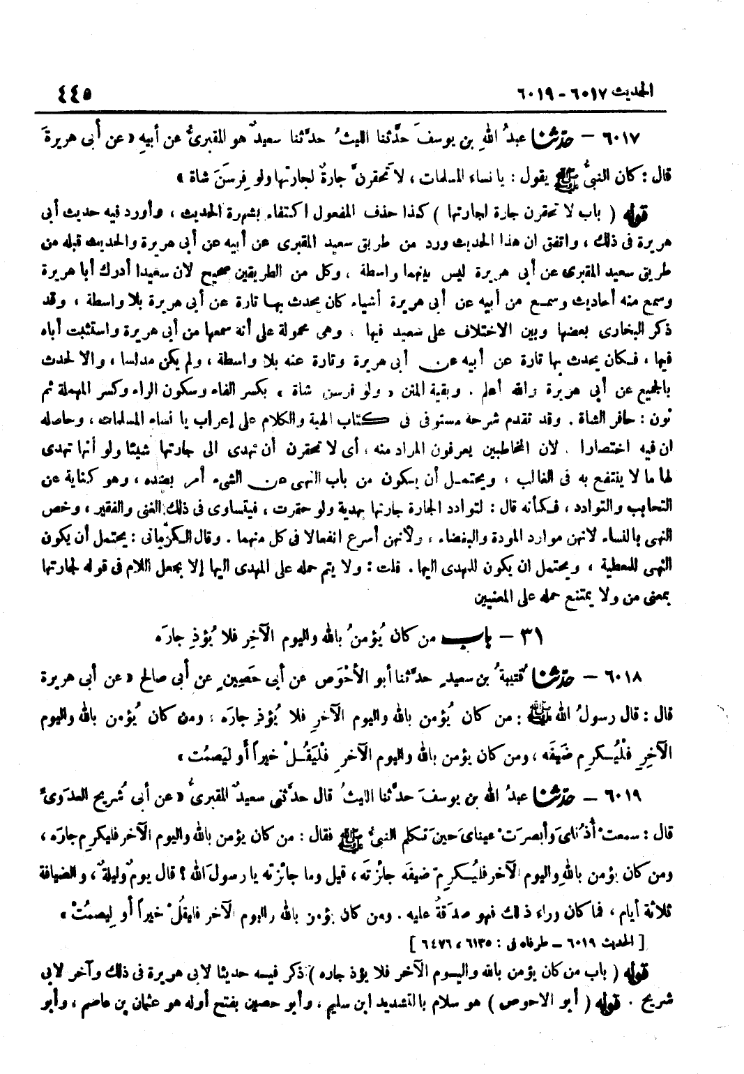 كَذَا حذف الْمَفْعُول اكْتِفَاء بشهرة الحَدِيث وَأَوْرَدَ فِيهِ حَدِيثَ أَبِي هُرَيْرَةَ فِي ذَلِكَ وَاتَّفَقَ أَنَّ هَذَا الْحَدِيثَ وَرَدَ مِنْ طَرِيقِ سَعِيدٍ الْمَقْبُرِيِّ عَنْ أَبِيهِ عَنْ أَبِي هُرَيْرَةَ وَالْحَدِيثُ قَبْلَهُ مِنْ طَرِيقِ سَعِيدٍ الْمَقْبُرِيِّ عَنْ أَبِي هُرَيْرَةَ لَيْسَ بَيْنَهُمَا وَاسِطَةٌ وَكُلٌّ مِنَ الطَّرِيقَيْنِ صَحِيحٌ لِأَنَّ سَعِيدًا أَدْرَكَ أَبَا هُرَيْرَةَ وَسَمِعَ مِنْهُ أَحَادِيثَ وَسَمِعَ مِنْ أَبِيهِ عَنْ أَبِي هُرَيْرَةَ أَشْيَاءَ كَانَ يُحَدِّثُ بِهَا تَارَةً عَنْ أَبِي هُرَيْرَةَ بِلَا وَاسِطَةٍ وَقَدْ ذَكَرَ الْبُخَارِيُّ بَعْضَهَا وَبَيَّنَ الِاخْتِلَافَ عَلَى سَعِيدٍ فِيهَا وَهِيَ مَحْمُولَةٌ عَلَى أَنَّهُ سَمِعَهَا مِنْ أَبِي هُرَيْرَةَ وَاسْتَثْبَتَ أَبَاهُ فِيهَا فَكَانَ يُحَدِّثُ بِهَا تَارَةً عَنْ أَبِيهِ عَنْ أَبِي هُرَيْرَةَ وَتَارَةً عَنْهُ بِلَا وَاسِطَةٍ وَلَمْ يَكُنْ مُدَلِّسًا وَإِلَّا لَحَدَّثَ بِالْجَمِيعِ عَنْ أَبِي هُرَيْرَةَ وَاللَّهُ أَعْلَمُ وَبَقِيَّةُ الْمَتْنِ وَلَوْ فِرْسِنُ شَاةٍ بِكَسْرِ الْفَاءِ وَسُكُونِ الرَّاءِ وَكَسْرِ الْمُهْمَلَةِ ثُمَّ نُونٍ حَافِرُ الشَّاةِ وَقَدْ تَقَدَّمَ شَرْحُهُ مُسْتَوْفًى فِي كِتَابِ الْهِبَةِ وَالْكَلَامُ عَلَى إِعْرَابِ يَا نِسَاءَ الْمُسْلِمَاتِ وَحَاصِلُهُ أَنَّ فِيهِ اخْتِصَارًا لِأَنَّ الْمُخَاطَبِينَ يَعْرِفُونَ الْمُرَادَ مِنْهُ أَيْ لَا تَحْقِرَنَّ أَنْ تُهْدِيَ إِلَى جَارَتِهَا شَيْئًا وَلَوْ أَنَّهَا تُهْدِي لَهَا مَا لَا يُنْتَفَعُ بِهِ فِي الْغَالِبِ وَيَحْتَمِلُ أَنْ يَكُونَ مِنْ بَابِ النَّهْيِ عَنِ الشَّيْءِ أَمْرٌ بِضِدِّهِ وَهُوَ كِنَايَةٌ عَنِ التَّحَابُبِ وَالتَّوَادُدِ فَكَأَنَّهُ قَالَ لِتُوَادِدِ الْجَارَةُ جَارَتَهَا بِهَدِيَّةٍ وَلَوْ حَقِرَتْ فَيَتَسَاوَى فِي ذَلِكَ الْغَنِيُّ وَالْفَقِيرُ وَخُصَّ النَّهْيُ بِالنِّسَاءِ لِأَنَّهُنَّ مَوَارِدُ الْمَوَدَّةِ وَالْبَغْضَاءِ وَلِأَنَّهُنَّ أَسْرَعُ انْفِعَالًا فِي كُلٍّ مِنْهُمَا وَقَالَ الْكِرْمَانِيُّ يَحْتَمِلُ أَنْ يَكُونَ النَّهْيُ لِلْمُعْطِيَةِ وَيَحْتَمِلُ أَنْ يَكُونَ لِلْمُهْدَى إِلَيْهَا قُلْتُ وَلَا يَتِمُّ حَمْلُهُ عَلَى الْمُهْدَى إِلَيْهَا إِلَّا بِجَعْلِ اللَّامِ فِي