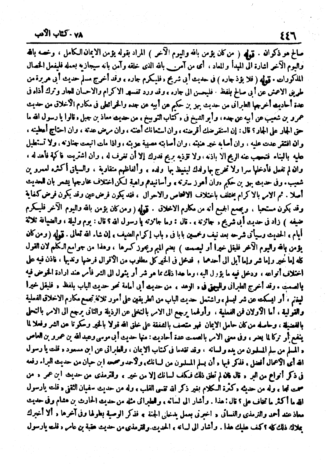 صَالِحٍ هُوَ ذَكْوَانُ قَوْلُهُ مَنْ كَانَ يُؤْمِنُ بِاللَّهِ وَالْيَوْمِ الْآخِرِ الْمُرَادُ بِقَوْلِهِ يُؤْمِنُ الْإِيمَانَ الْكَامِلَ وَخَصَّهُ بِاللَّهِ وَالْيَوْمِ الْآخِرِ إِشَارَةً إِلَى الْمَبْدَأِ وَالْمَعَادِ أَيْ مَنْ آمَنَ بِاللَّهِ الَّذِي خَلَقَهُ وَآمَنَ بِأَنَّهُ سَيُجَازِيهِ بِعَمَلِهِ فَلْيَفْعَلِ الْخِصَالَ الْمَذْكُورَاتِ قَوْلُهُ فَلَا يُؤْذِ جَارَهُ فِي حَدِيثِ أَبِي شُرَيْحٍ فَلْيُكْرِمْ جَارَهُ وَقَدْ أَخْرَجَ مُسْلِمٌ حَدِيثَ أَبِي هُرَيْرَةَ مِنْ طَرِيقِ الْأَعْمَشِ عَنْ أَبِي صَالِحٍ بِلَفْظِ فَلْيُحْسِنْ إِلَى جَارِهِ وَقَدْ وَرَدَ تَفْسِيرُ الْإِكْرَامِ وَالْإِحْسَانِ لِلْجَارِ وَتَرْكِ أَذَاهُ فِي عِدَّةِ أَحَادِيثَ أَخْرَجَهَا الطَّبَرَانِيُّ مِنْ حَدِيثِ بَهْزُ بْنُ حَكِيمٍ عَنْ أَبِيهِ عَنْ جَدِّهِ وَالْخَرَائِطِيِّ فِي مَكَارِمِ الْأَخْلَاقِ مِنْ حَدِيثِ عَمْرِو بْنِ شُعَيْبٍ عَنْ أَبِيهِ عَنْ جَدِّهِ وَأَبُو الشَّيْخِ فِي كِتَابِ التَّوْبِيخِ مِنْ حَدِيثِ مُعَاذِ بْنِ جَبَلٍ قَالُوا يَا رَسُولَ اللَّهِ مَا حَقُّ الْجَارِ عَلَى الْجَارِ قَالَ إِنِ اسْتَقْرَضَكَ أَقْرَضْتَهُ وَإِنِ اسْتَعَانَكَ أَعَنْتَهُ وَإِنْ مَرِضَ عُدْتَهُ وَإِنِ احْتَاجَ أَعْطَيْتَهُ وَإِنِ افْتَقَرَ عُدْتَ عَلَيْهِ وَإِنْ أَصَابَهُ خَيْرٌ هَنَّيْتَهُ وَإِنْ أَصَابَتْهُ مُصِيبَةٌ عَزَّيْتَهُ وَإِذَا مَاتَ اتَّبَعَتْ جِنَازَتَهُ وَلَا تَسْتَطِيلُ عَلَيْهِ بِالْبِنَاءِ فَتَحْجُبَ عَنْهُ الرِّيحَ إِلَّا بِإِذْنِهِ وَلَا تُؤْذِيهِ بِرِيحِ قِدْرِكَ إِلَّا أَنْ تَغْرِفَ لَهُ وَإِنِ اشْتَرَيْتَ فَاكِهَةً فَأَهْدِ لَهُ وَإِنْ لَمْ تَفْعَلْ فَأَدْخِلْهَا سِرًّا وَلَا تُخْرِجْ بِهَا وَلَدَكَ لِيَغِيظَ بِهَا وَلَدَهُ وَأَلْفَاظُهُمْ مُتَقَارِبَةٌ وَالسِّيَاقُ أَكْثَرُهُ لِعَمْرِو بْنِ شُعَيْبٍ وَفِي حَدِيثِ بَهْزِ بْنِ حَكِيمٍ وَإِنْ أَعْوَزَ سَتَرْتَهُ وَأَسَانِيدُهُمْ وَاهِيَةٌ لَكِنِ اخْتِلَافُ مَخَارِجِهَا يُشْعِرُ بِأَنَّ للْحَدِيثِ أَصْلًا ثُمَّ الْأَمْرُ بِالْإِكْرَامِ يَخْتَلِفُ بِاخْتِلَافِ الْأَشْخَاصِ وَالْأَحْوَالِ فَقَدْ يَكُونُ فَرْضَ عَيْنٍ وَقَدْ يَكُونُ فَرْضَ كِفَايَةٍ وَقَدْ يَكُونُ مُسْتَحَبًّا وَيُجْمِعُ الْجَمِيعُ أَنَّهُ مِنْ مَكَارِمِ الْأَخْلَاقِ قَوْلُهُ وَمَنْ كَانَ يُؤْمِنُ بِاللَّهِ وَالْيَوْمِ الْآخِرِ فَلْيُكْرِمْ ضَيْفَهُ زَادَ فِي حَدِيثِ أَبِي شُرَيْحٍ جَائِزَتُهُ قَالَ وَمَا جَائِزَتُهُ يَا رَسُولَ اللَّهِ قَالَ يَوْمٌ وَلَيْلَةٌ وَالضِّيَافَةُ ثَلَاثَةُ أَيَّامٍ الْحَدِيثَ وَسَيَأْتِي شَرْحُهُ بَعْدَ نَيِّفٍ وَخَمْسِينَ بَابًا فِي بَابِ إِكْرَامِ الضَّيْفِ إِنْ شَاءَ اللَّهُ تَعَالَى قَوْلُهُ وَمَنْ كَانَ يُؤْمِنُ بِاللَّهِ وَالْيَوْمِ الْآخِرِ فَلْيَقُلْ خَيْرًا أَوْ لِيَصْمُتْ بِضَمِّ الْمِيمِ وَيَجُوزُ كَسْرُهَا وَهَذَا مِنْ جَوَامِعِ الْكَلِمِ لِأَنَّ الْقَوْلَ كُلَّهُ إِمَّا خَيْرٌ وَإِمَّا شَرٌّ وَإِمَّا آيِلُ إِلَى أَحَدِهِمَا فَدَخَلَ فِي الْخَيْرِ كُلُّ مَطْلُوبٍ مِنَ الْأَقْوَالِ فَرْضُهَا وَنَدْبُهَا فَأَذِنَ فِيهِ عَلَى اخْتِلَافِ أَنْوَاعِهِ وَدَخَلَ فِيهِ مَا يؤول إِلَيْهِ وَمَا عَدَا ذَلِكَ مِمَّا هُوَ شَرٌّ أَوْ يَئُولُ إِلَى الشَّرِّ فَأَمَرَ عِنْدَ إِرَادَةِ الْخَوْضِ فِيهِ بِالصَّمْتِ وَقَدْ أَخْرَجَ الطَّبَرَانِيُّ وَالْبَيْهَقِيُّ فِي الزُّهْدِ مِنْ حَدِيثِ أَبِي أُمَامَةَ نَحْوَ حَدِيثِ الْبَابِ بِلَفْظِ فَلْيَقُلْ خَيْرًا لِيَغْنَمْ أَوْ لِيَسْكُتْ عَنْ شَرٍّ لِيَسْلَمْ وَاشْتَمَلَ حَدِيثُ الْبَابِ مِنَ الطَّرِيقَيْنِ عَلَى أُمُورٍ ثَلَاثَةٍ تَجْمَعُ مَكَارِمَ الْأَخْلَاقِ 