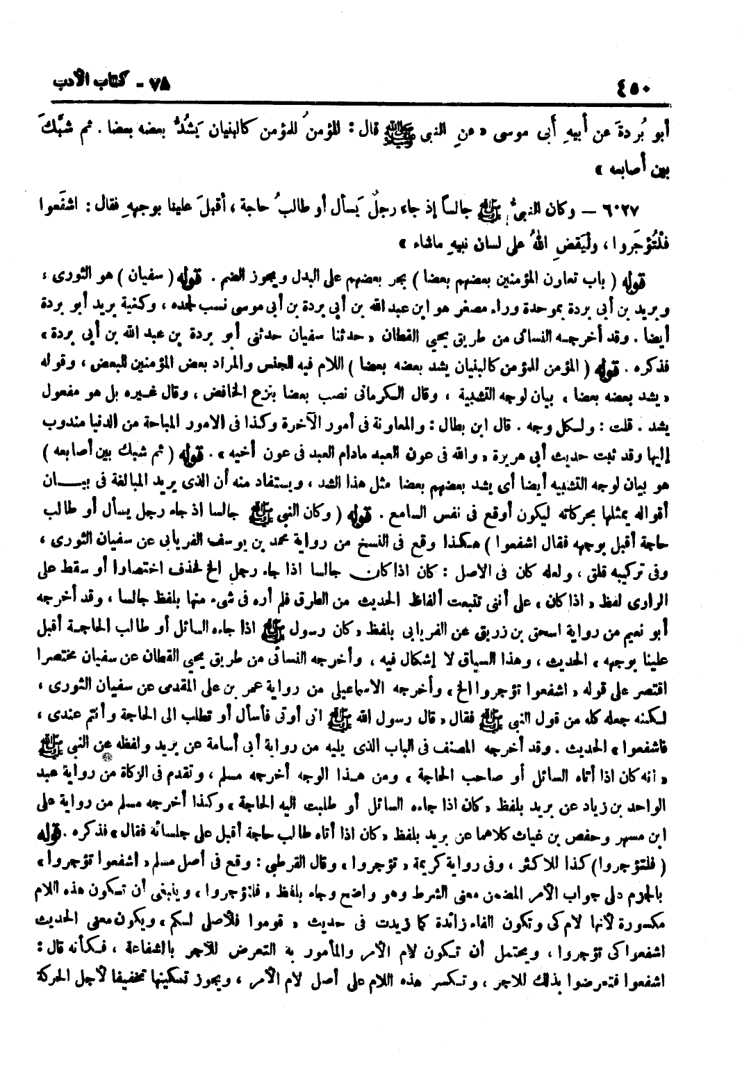 [6026] قَوْله سُفْيَان هُوَ الثَّوْريّ وبريد بن أبي بردة بموحدة وَرَاء مصغر هُوَ بْنُ عَبْدِ اللَّهِ بْنِ أَبِي بُرْدَةَ بْنِ أَبِي مُوسَى نسب لجده وكنية بريد أَبُو بردة أَيْضا وَقد أخرجه النَّسَائِيّ من طَرِيق يحيى الْقطَّان حَدَّثَنَا سُفْيَانُ حَدَّثَنِي أَبُو بُرْدَةَ بْنِ عَبْدِ اللَّهِ بْنِ أَبِي بُرْدَةَ فَذَكَرَهُ قَوْلُهُ الْمُؤْمِنُ لِلْمُؤمنِ كَالْبُنْيَانِ يَشُدُّ بَعْضُهُ بَعْضًا اللَّامُ فِيهِ لِلْجِنْسِ وَالْمُرَادُ بَعْضُ الْمُؤْمِنِينَ لِلْبَعْضِ وَقَوْلُهُ يَشُدُّ بَعْضُهُ بَعْضًا بَيَانٌ لِوَجْهِ التَّشْبِيهِ وَقَالَ الْكِرْمَانِيُّ نَصَبَ بَعْضًا بِنَزْعِ الْخَافِضِ وَقَالَ غَيْرُهُ بَلْ هُوَ مفعول يشد قلت وَلكُل وَجه قَالَ بن بَطَّالٍ وَالْمُعَاوَنَةُ فِي أُمُورِ الْآخِرَةِ وَكَذَا فِي الْأُمُورِ الْمُبَاحَةِ مِنَ الدُّنْيَا مَنْدُوبٌ إِلَيْهَا وَقَدْ ثَبَتَ حَدِيثُ أَبِي هُرَيْرَةَ وَاللَّهُ فِي عَوْنِ الْعَبْدِ مَا دَامَ الْعَبْدُ فِي عَوْنِ أَخِيهِ قَوْلُهُ ثُمَّ شَبَّكَ بَيْنَ أَصَابِعِهِ هُوَ بَيَانٌ لِوَجْهِ التَّشْبِيهِ أَيْضًا أَيْ يَشُدُّ بَعْضُهُمْ بَعْضًا مِثْلَ هَذَا الشَّدِّ وَيُسْتَفَادُ مِنْهُ أَنَّ الَّذِي يُرِيدُ الْمُبَالَغَةَ فِي بَيَانِ أَقْوَالِهِ يُمَثِّلُهَا بِحَرَكَاتِهِ لِيَكُونَ أَوْقَعَ فِي نَفْسِ السَّامِعِ قَوْلُهُ وَكَانَ النَّبِيُّ صَلَّى اللَّهُ عَلَيْهِ وَسَلَّمَ جَالِسًا إِذْ جَاءَ رَجُلٌ يَسْأَلُ أَوْ طَالِبُ حَاجَةٍ أَقْبَلَ بِوَجْهِهِ فَقَالَ اشْفَعُوا هَكَذَا وَقَعَ فِي النُّسَخِ من رِوَايَة مُحَمَّدِ بْنِ يُوسُفَ الْفِرْيَابِيِّ عَنْ سُفْيَانَ الثَّوْرِيِّ وَفِي تركيبه قلق وَلَعَلَّه كَانَ فِي الْأَصْلِ كَانَ إِذَا كَانَ جَالِسًا إِذَا جَاءَ رَجُلٌ إِلَخْ فَحُذِفَ اخْتِصَارًا أَوْ سَقَطَ عَلَى الرَّاوِيِ لَفْظُ إِذَا كَانَ عَلَى أَنَّنِي تَتَبَّعْتُ أَلْفَاظَ الْحَدِيثِ مِنَ الطُّرُقِ فَلَمْ أَرَهُ فِي شَيْءٍ مِنْهَا بِلَفْظِ جَالِسًا وَقَدْ أَخْرَجَهُ أَبُو نُعَيْمٍ مِنْ رِوَايَةِ إِسْحَاقَ بْنِ زُرَيْقٍ عَنِ الْفِرْيَابِيِّ بِلَفْظِ كَانَ رَسُولُ اللَّهِ صَلَّى اللَّهُ عَلَيْهِ وَسَلَّمَ إِذَا جَاءَهُ السَّائِلُ أَوْ طَالِبُ الْحَاجَةِ أَقْبَلَ عَلَيْنَا بِوَجْهِهِ الْحَدِيثَ وَهَذَا السِّيَاقُ لَا إِشْكَالَ فِيهِ وَأَخْرَجَهُ النَّسَائِيُّ مِنْ طَرِيقِ يَحْيَى الْقَطَّانِ عَنْ سُفْيَانَ مُخْتَصَرًا اقْتَصَرَ عَلَى قَوْلِهِ اشْفَعُوا تُؤْجَرُوا إِلَخْ وَأَخْرَجَهُ الْإِسْمَاعِيلِيُّ مِنْ رِوَايَةِ عُمَرَ بْنِ عَلِيٍّ الْمُقَدَّمِيِّ عَنْ سُفْيَانَ الثَّوْرِيِّ لَكِنَّهُ جَعَلَهُ كُلَّهُ مِنْ قَوْلِ النَّبِيِّ صَلَّى اللَّهُ عَلَيْهِ وَسَلَّمَ فَقَالَ قَالَ رَسُولُ اللَّهِ صَلَّى اللَّهُ عَلَيْهِ وَسَلَّمَ إِنِّي أُوتَى فَأُسْأَلُ أَوْ تُطْلَبُ إِلَيَّ الْحَاجَةُ وَأَنْتُمْ عِنْدِي فَاشْفَعُوا الْحَدِيثَ وَقَدْ أَخْرَجَهُ الْمُصَنِّفُ فِي الْبَابِ الَّذِي يَلِيهِ مِنْ رِوَايَةِ أَبِي أُسَامَةَ عَنْ بُرَيْدٍ وَلَفْظُهُ عَنِ النَّبِيِّ صَلَّى اللَّهُ عَلَيْهِ وَسَلَّمَ أَنَّهُ كَانَ إِذَا أَتَاهُ السَّائِلُ أَوْ صَاحِبُ الْحَاجَةِ وَمِنْ هَذَا الْوَجْهِ أَخْرَجَهُ مُسْلِمٌ وَتَقَدَّمَ فِي الزَّكَاةِ مِنْ رِوَايَةِ عَبْدِ الْوَاحِدِ بْنِ زِيَادٍ عَنْ بُرَيْدٍ بِلَفْظِ كَانَ إِذَا جَاءَهُ السَّائِلُ أَوْ طُلِبتْ إِلَيْهِ الْحَاجَةُ وَكَذَا أَخْرَجَهُ مُسْلِمٌ مِنْ رِوَايَةِ عَلِيِّ بْنِ مُسْهِرٍ وَحَفْصِ بْنِ غِيَاثٍ كِلَاهُمَا عَنْ بُرَيْدٍ بِلَفْظِ كَانَ إِذَا أَتَاهُ طَالِبُ حَاجَةٍ أَقْبَلَ عَلَى جُلَسَائِهِ فَقَالَ فَذَكَرَهُ قَوْلُهُ فَلْتُؤْجَرُوا كَذَا لِلْأَكْثَرِ وَفِي رِوَ