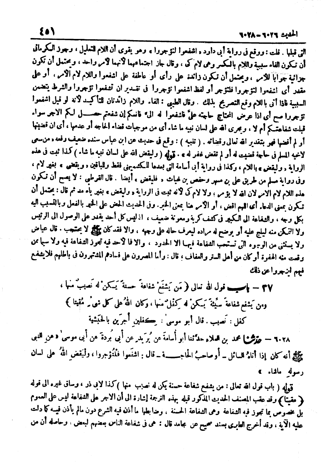 الَّتِي قَبْلَهَا قُلْتُ وَوَقَعَ فِي رِوَايَةِ أَبِي دَاوُدَ اشْفَعُوا لِتُؤْجَرُوا وَهُوَ يُقَوِّي أَنَّ اللَّامَ لِلتَّعْلِيلِ وَجَوَّزَ الْكِرْمَانِيُّ أَنْ تَكُونَ الْفَاءُ سَبَبِيَّةً وَاللَّامُ بِالْكَسْرِ وَهِيَ لَامُ كَيْ وَقَالَ جَازَ اجْتِمَاعُهُمَا لِأَنَّهُمَا لِأَمْرٍ وَاحِدٍ وَيَحْتَمِلُ أَنْ تَكُونَ جَزَائِيَّةً جَوَابًا لِلْأَمْرِ وَيَحْتَمِلُ أَنْ تَكُونَ زَائِدَةً عَلَى رَأْيٍ أَوْ عَاطِفَةً عَلَى اشْفَعُوا وَاللَّامُ لَامُ الْأَمْرِ أَوْ عَلَى مُقَدَّرٍ أَيِ اشْفَعُوا لِتُؤْجَرُوا فَلْتُؤْجَرْ أَوْ لَفْظُ اشْفَعُوا تُؤْجَرُوا فِي تَقْدِيرِ إِنْ تَشْفَعُوا تُؤْجَرُوا وَالشَّرْطُ يَتَضَمَّنُ السَّبَبِيَّةَ فَإِذَا أَتَى بِاللَّامِ وَقَعَ التَّصْرِيحُ بِذَلِكَ وَقَالَ الطِّيبِيُّ الْفَاءُ وَاللَّامُ زَائِدَتَانِ لِلتَّأْكِيدِ لِأَنَّهُ لَوْ قِيلَ اشْفَعُوا تُؤْجَرُوا صَحَّ أَيْ إِذَا عَرَضَ الْمُحْتَاجُ حَاجَتَهُ عَلَيَّ فَاشْفَعُوا لَهُ إِلَيَّ فَإِنَّكُمْ إِنْ شَفَعْتُمْ حَصَلَ لَكُمُ الْأَجْرُ سَوَاءٌ قَبِلْتُ شَفَاعَتُكُمْ أَمْ لَا وَيُجْرِي اللَّهُ عَلَى لِسَانِ نَبِيِّهِ مَا شَاءَ أَيْ مِنْ مُوجِبَاتِ قَضَاءِ الْحَاجَةِ أَوْ عَدَمِهَا أَيْ إِنْ قَضَيْتُهَا أَوْ لَمْ أَقْضِهَا فَهُوَ بِتَقْدِيرِ اللَّهِ تَعَالَى وَقَضَائِهِ تَنْبِيه وَقع فِي حَدِيث عَن بن عَبَّاسٍ سَنَدُهُ ضَعِيفٌ رَفَعَهُ مَنْ سَعَى لِأَخِيهِ الْمُسْلِمِ فِي حَاجَةٍ قُضِيَتْ لَهُ أَوْ لَمْ تُقْضَ غُفِرَ لَهُ قَوْلُهُ وَلْيَقْضِ اللَّهُ عَلَى لِسَانِ نَبِيِّهِ مَا شَاءَ كَذَا ثَبَتَ فِي هَذِهِ الرِّوَايَةِ وَلْيَقْضِ بِاللَّامِ وَكَذَا فِي رِوَايَةِ أَبِي أُسَامَةَ الَّتِي بَعْدَهَا لِلْكُشْمِيهَنِيِّ فَقَطْ وَلِلْبَاقِينَ وَيَقْضِي بِغَيْرِ لَامٍ وَفِي رِوَايَةِ مُسْلِمٍ مِنْ طَرِيقِ عَلِيِّ بْنِ مُسْهِرٍ وَحَفْصِ بْنِ غِيَاثٍ فَلْيَقْضِ أَيْضًا قَالَ الْقُرْطُبِيُّ لَا يَصِحُّ أَنْ تَكُونَ هَذِهِ اللَّامُ لَامَ الْأَمْرِ لِأَنَّ اللَّهَ لَا يُؤْمَرُ وَلَا لَامَ كَيْ لِأَنَّهُ ثَبَتَ فِي الرِّوَايَةِ وَلْيَقْضِ بِغَيْرِ يَاءِ مَدٍّ ثُمَّ قَالَ يَحْتَمِلُ أَنْ تَكُونَ بِمَعْنَى الدُّعَاءِ أَيِ اللَّهُمَّ اقْضِ أَوِ الْأَمْرُ هُنَا بِمَعْنَى الْخَبَرِ وَفِي الحَدِيث الْحَضِّ عَلَى الْخَيْرِ بِالْفِعْلِ وَبِالتَّسَبُّبِ إِلَيْهِ بِكُلِّ وَجْهٍ وَالشَّفَاعَةُ إِلَى الْكَبِيرِ فِي كَشْفِ كُرْبَةٍ وَمَعُونَةٍ ضَعِيفٌ إِذْ لَيْسَ كُلُّ أَحَدٍ يَقْدِرُ عَلَى الْوُصُولِ إِلَى الرَّئِيسِ وَلَا التَّمَكُّنِ مِنْهُ لِيَلِجَ عَلَيْهِ أَوْ يُوَضِّحَ لَهُ مُرَادَهُ لِيَعْرِفَ حَالَهُ عَلَى وَجْهِهِ وَإِلَّا فَقَدْ كَانَ صَلَّى اللَّهُ عَلَيْهِ وَسَلَّمَ لَا يَحْتَجِبُ قَالَ عِيَاضٌ وَلَا يُسْتَثْنَى مِنَ الْوُجُوهِ الَّتِي تُسْتَحَبُّ الشَّفَاعَةُ فِيهَا إِلَّا الْحُدُودَ وَإِلَّا فَمَا لِأَحَدٍ فِيهِ تَجُوزُ الشَّفَاعَةُ فِيهِ وَلَا سِيَّمَا مِمَّنْ وَقَعَتْ مِنْهُ الْهَفْوَةُ أَوْ كَانَ مِنْ أَهْلِ السِّتْرِ وَالْعَفَافِ قَالَ وَأَمَّا الْمُصِرُّونَ عَلَى فَسَادِهِمُ الْمُشْتَهِرُونَ فِي بَاطِلِهِمْ فَلَا يُشَفَّعُ فِيهِمْ لِيُزْجَرُوا عَنْ ذَلِك