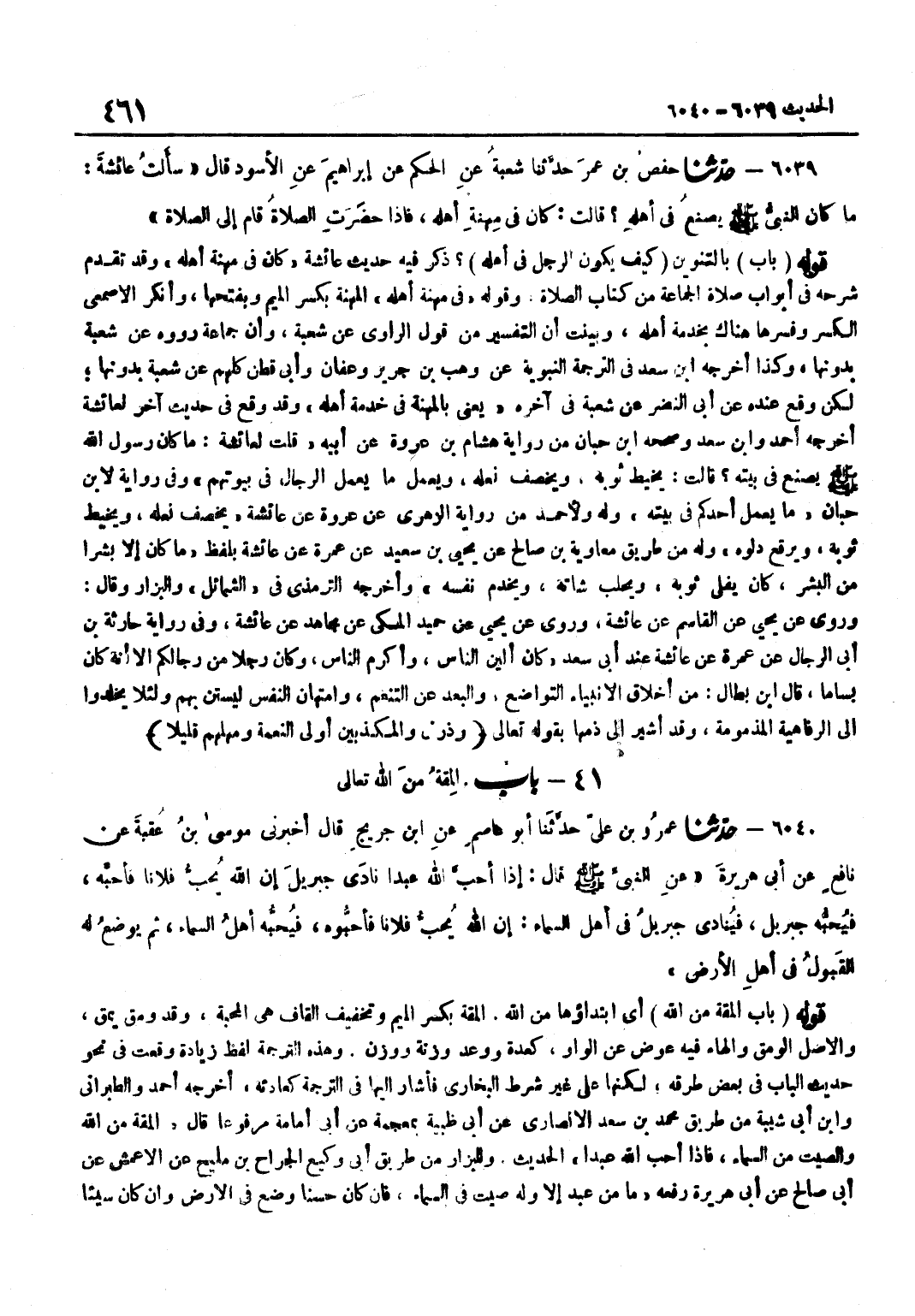 [6039] فِي مِهْنَةِ أَهْلِهِ الْمِهْنَةُ بِكَسْرِ الْمِيمِ وَبِفَتْحِهَا وَأَنْكَرَ الْأَصْمَعِيُّ الْكَسْرَ وَفَسَّرَهَا هُنَاكَ بِخِدْمَةِ أَهْلِهِ وَبَيَّنْتُ أَنَّ التَّفْسِيرَ مِنْ قَوْلِ الرَّاوِيِ عَنْ شُعْبَةَ وَأَنَّ جَمَاعَةً رَوَوْهُ عَنْ شُعْبَةَ بِدُونِهَا وَكَذَا أخرجه بن سَعْدٍ فِي التَّرْجَمَةِ النَّبَوِيَّةِ عَنْ وَهْبِ بْنِ جَرِيرٍ وَعَفَّانَ وَأَبِي قُطْنٍ كُلُّهُمْ عَنْ شُعْبَةَ بِدُونِهَا لَكِنْ وَقَعَ عِنْدَهُ عَنْ أَبِي النَّضْرِ عَنْ شُعْبَةَ فِي آخِرِهِ يَعْنِي بِالْمِهْنَةِ فِي خِدْمَةِ أَهْلِهِ وَقَدْ وَقَعَ فِي حَدِيثٍ آخَرَ لعَائِشَة أخرجه أَحْمد وبن سعد وَصَححهُ بن حِبَّانَ مِنْ رِوَايَةِ هِشَامِ بْنِ عُرْوَةَ عَنْ أَبِيهِ قُلْتُ لِعَائِشَةَ مَا كَانَ رَسُولُ اللَّهِ صَلَّى اللَّهُ عَلَيْهِ وَسَلَّمَ يَصْنَعُ فِي بَيْتِهِ قَالَتْ يَخِيطُ ثَوْبَهُ وَيَخْصِفُ نَعْلَهُ وَيَعْمَلُ مَا يَعْمَلُ الرِّجَالُ فِي بُيُوتِهِمْ وَفِي رِوَايَةٍ لِابْنِ حِبَّانَ مَا يَعْمَلُ أَحَدُكُمْ فِي بَيْتِهِ وَلَهُ وَلِأَحْمَدَ مِنْ رِوَايَةِ الزُّهْرِيِّ عَنْ عُرْوَةَ عَنْ عَائِشَةَ يَخْصِفُ نَعْلَهُ وَيَخِيطُ ثَوْبَهُ وَيُرَقِّعُ دَلْوَهُ وَلَهُ مِنْ طَرِيقِ مُعَاوِيَةَ بْنِ صَالِحٍ عَنْ يَحْيَى بْنِ سَعِيدٍ عَنْ عَمْرَةَ عَنْ عَائِشَةَ بِلَفْظِ مَا كَانَ إِلَّا بَشَرًا مِنَ الْبَشَرِ كَانَ يُفَلِّي ثَوْبَهُ وَيَحْلُبُ شَاتَهُ وَيَخْدُمُ نَفْسَهُ وَأَخْرَجَهُ التِّرْمِذِيُّ فِي الشَّمَائِلِ وَالْبَزَّارُ وَقَالَ وَرُوِيَ عَنْ يَحْيَى عَنِ الْقَاسِمِ عَنْ عَائِشَةَ وَرُوِيَ عَنْ يَحْيَى عَنْ حُمَيْدٍ الْمَكِّيِّ عَنْ مُجَاهِدٍ عَنْ عَائِشَةَ وَفِي رِوَايَةِ حَارِثَةَ بْنِ أَبِي الرِّجَالِ عَنْ عَمْرَةَ عَنْ عَائِشَةَ عِنْدَ أَبِي سَعْدٍ كَانَ أَلْيَنُ النَّاسِ وَأَكْرَمُ النَّاسِ وَكَانَ رَجُلًا مِنْ رِجَالِكُمْ إِلَّا أَنَّهُ كَانَ بَسَّامًا قَالَ بن بَطَّالٍ مِنْ أَخْلَاقِ الْأَنْبِيَاءِ التَّوَاضُعُ وَالْبُعْدُ عَنِ التَّنَعُّمِ وَامْتِهَانُ النَّفْسِ لِيُسْتَنَّ بِهِمْ وَلِئَلَّا يَخْلُدُوا إِلَى الرَّفَاهِيَةِ الْمَذْمُومَةِ وَقَدْ أُشِيرَ إِلَى ذَمِّهَا بِقَوْلِهِ تَعَالَى وَذَرْنِي وَالْمُكَذِّبِينَ أُولِي النَّعْمَةِ وَمَهِّلْهُمْ قَلِيلا
