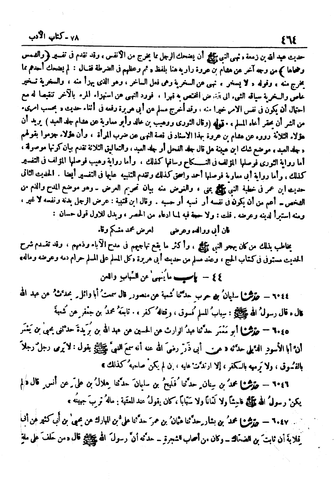 حَدِيثُ عَبْدِ اللَّهِ بْنِ زَمْعَةَ نَهَى النَّبِيُّ صَلَّى اللَّهُ عَلَيْهِ وَسَلَّمَ أَنْ يَضْحَكَ الرَّجُلُ مِمَّا يَخْرُجُ مِنَ الْأَنْفُسِ وَقَدْ تَقَدَّمَ فِي تَفْسِير وَالشَّمْس وَضُحَاهَا مِنْ وَجْهٍ آخَرَ عَنْ هِشَامِ بْنِ عُرْوَةَ راوية هُنَا بِلَفْظِ ثُمَّ وَعَظَهُمْ فِي الضَّرْطَةِ فَقَالَ لم يضْحك أحدهم مِمَّا يخرج مِنْهُ قَوْله لَا يَسْخَرْ نَهْيٌ عَنِ السُّخْرِيَةِ وَهِيَ فِعْلُ السَّاخِرِ وَهُوَ الَّذِي يُهْزَأُ مِنْهُ وَالسُّخْرِيَةُ تَسْخِيرٌ خَاصٌّ وَالسُّخْرِيَةُ سِيَاقَةُ الشَّيْءَ إِلَى الْغَرَضِ الْمُخْتَصِّ بِهِ قَهْرًا فَوَرَدَ النَّهْيُ عَنِ اسْتِهْزَاءِ الْمَرْءِ بِالْآخَرِ تَنْقِيصًا لَهُ مَعَ احْتِمَالِ أَنْ يَكُونَ فِي نفس الْأَمر خيرا مِنْهُ وَقَدْ أَخْرَجَ مُسْلِمٌ عَنْ أَبِي هُرَيْرَةَ رَفَعَهُ فِي أَثْنَاءِ حَدِيثِ بِحَسْبِ امْرِئٍ مِنَ الشَّرِّ أَنْ يَحْقِرَ أَخَاهُ الْمُسْلِمَ