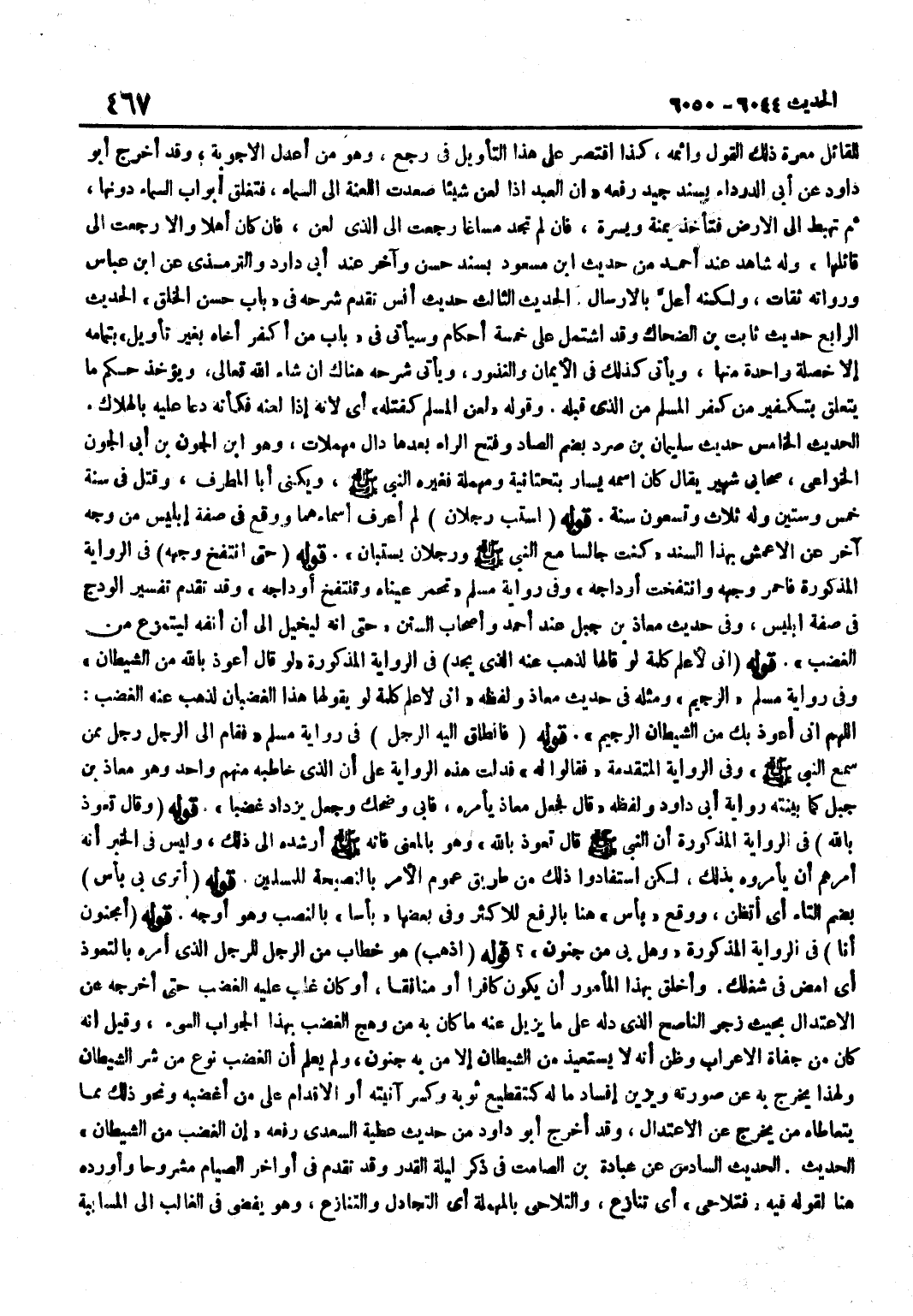 [6048] قَوْلُهُ اسْتَبَّ رَجُلَانِ لَمْ أَعْرِفْ أَسْمَاءَهُمَا وَوَقَعَ فِي صِفَةِ إِبْلِيسَ مِنْ وَجْهٍ آخَرَ عَنِ الْأَعْمَشِ بِهَذَا السَّنَدِ كُنْتُ جَالِسًا مَعَ النَّبِيِّ صَلَّى اللَّهُ عَلَيْهِ وَسَلَّمَ وَرَجُلَانِ يَسْتَبَّانِ قَوْلُهُ حَتَّى انْتَفَخَ وَجْهُهُ فِي الرِّوَايَةِ الْمَذْكُورَةِ فَاحْمَرَّ وَجْهُهُ وَانْتَفَخَتْ أَوْدَاجُهُ وَفِي رِوَايَةِ مُسْلِمٍ تَحْمَرُّ عَيْنَاهُ وَتَنْتَفِخُ أَوْدَاجُهُ وَقَدْ تَقَدَّمَ تَفْسِيرُ الْوَدَجِ فِي صِفَةِ إِبْلِيسَ وَفِي حَدِيثِ مُعَاذِ بْنِ جَبَلٍ عِنْدَ أَحْمَدَ وَأَصْحَابِ السُّنَنِ حَتَّى إِنَّهُ لَيُخَيَّلُ إِلَيَّ أَنَّ أَنْفَهُ لَيَتَمَزَّعُ مِنَ الْغَضَبِ قَوْلُهُ إِنِّي لَأَعْلَمُ كَلِمَةً لَوْ قَالَهَا لَذَهَبَ عَنْهُ الَّذِي يَجِدُ فِي الرِّوَايَةِ الْمَذْكُورَةِ لَوْ قَالَ أَعُوذُ بِاللَّهِ مِنَ الشَّيْطَانِ وَفِي رِوَايَةِ مُسْلِمٍ الرَّجِيمِ وَمِثْلُهُ فِي حَدِيثِ مُعَاذٍ وَلَفْظُهُ إِنِّي لَأَعْلَمُ كَلِمَةً لَوْ يَقُولُهَا هَذَا الْغَضْبَانُ لَذَهَبَ عَنْهُ الْغَضَبَ اللَّهُمَّ إِنَى أَعُوذُ بِكَ مِنَ الشَّيْطَانِ الرَّجِيمِ قَوْلُهُ فَانْطَلَقَ إِلَيْهِ الرَّجُلُ فِي رِوَايَةِ مُسْلِمٍ فَقَامَ إِلَى الرَّجُلِ رَجُلٌ مِمَّنْ سَمِعَ النَّبِيَّ صَلَّى اللَّهُ عَلَيْهِ وَسَلَّمَ وَفِي الرِّوَايَةِ الْمُتَقَدِّمَةِ فَقَالُوا لَهُ فَدَلَّتْ هَذِهِ الرِّوَايَةُ عَلَى أَنَّ الَّذِي خَاطَبَهُ مِنْهُمْ وَاحِدٌ وَهُوَ مُعَاذُ بْنُ جَبَلٍ كَمَا بَيَّنَتْهُ رِوَايَةُ أَبِي دَاوُدَ وَلَفْظُهُ قَالَ فَجَعَلَ مُعَاذُ يَأْمُرُهُ فَأَبَى وَضَحِكَ وَجَعَلَ يَزْدَادُ غَضَبًا قَوْلُهُ وَقَالَ تَعَوَّذْ بِاللَّهِ فِي الرِّوَايَةِ الْمَذْكُورَةِ أَنَّ النَّبِيَّ صَلَّى اللَّهُ عَلَيْهِ وَسَلَّمَ قَالَ تَعَوَّذْ بِاللَّهِ وَهُوَ بِالْمَعْنَى فَإِنَّهُ صَلَّى اللَّهُ عَلَيْهِ وَسَلَّمَ أَرْشَدَهُ إِلَى ذَلِكَ وَلَيْسَ فِي الْخَبَرِ أَنَّهُ أَمَرَهُمْ أَنْ يَأْمُرُوهُ بِذَلِكَ لَكِنِ اسْتَفَادُوا ذَلِكَ مِنْ طَرِيقِ عُمُومِ الْأَمْرِ بِالنَّصِيحَةِ لِلْمُسْلِمِينَ قَوْلُهُ أَتُرَى بِي بَأْسٌ بِضَمِّ التَّاءِ أَيْ أَتَظُنُّ وَوَقَعَ بَأْسٌ هُنَا بِالرَّفْعِ لِلْأَكْثَرِ وَفِي بَعْضِهَا بَأْسًا بِالنَّصْبِ وَهُوَ أَوْجَهُ قَوْلُهُ أَمَجْنُونٌ أَنَا فِي الرِّوَايَةِ الْمَذْكُورَةِ وَهَلْ بِي مِنْ جُنُونٍ قَوْلُهُ اذْهَبْ هُوَ خِطَابٌ مِنَ الرَّجُلِ لِلرَّجُلِ الَّذِي أَمَرَهُ بِالتَّعَوُّذِ أَيِ امْضِ فِي شُغْلِكَ وَأَخْلَقُ بِهَذَا الْمَأْمُورِ أَنْ يَكُونَ كَافِرًا أَوْ مُنَافِقًا أَوْ كَانَ غَلَبَ عَلَيْهِ الْغَضَبُ حَتَّى أَخْرَجَهُ عَنِ الِاعْتِدَالِ بِحَيْثُ زَجَرَ النَّاصِحَ الَّذِي دَلَّهُ عَلَى مَا يُزِيلُ عَنْهُ مَا كَانَ بِهِ مِنْ وَهَجِ الْغَضَبِ بِهَذَا الْجَواب السيء وَقِيلَ إِنَّهُ كَانَ مِنْ جُفَاةِ الْأَعْرَابِ وَظَنَّ أَنَّهُ لَا يَسْتَعِيذُ مِنَ الشَّيْطَانَ إِلَّا مَنْ بِهِ جُنُونٌ وَلَمْ يَعْلَمْ أَنَّ الْغَضَبَ نَوْعٌ مِنْ شَرِّ الشَّيْطَانِ وَلِهَذَا يَخْرُجُ بِهِ عَنْ صُورَتِهِ وَيُزَيِّنُ إِفْسَادَ مَا لَهُ كَتَقْطِيعِ ثَوْبِهِ وَكَسْرِ آنِيَّتِهِ أَوِ الْإِقْدَامِ عَلَى مَنْ أَغْضَبَهُ وَنَحْوِ ذَلِكَ مِمَّا يَتَعَاطَاهُ مَنْ يَخْرُجُ عَنِ الِاعْتِدَالِ وَقَدْ أَخْرَجَ أَبُو دَاوُدَ مِنْ حَدِيثِ عَطِيَّةَ السَّعْدِيِّ رَفَعَهُ إِنَّ الْغَضَبَ مِنَ الشَّيْطَانِ الحَدِيث الحَدِيث السَّادِس عَن عُبَادَةَ بْنِ الصَّامِتِ فِي ذِكْرِ لَيْلَةَ الْقَدْرِ وَقَدْ تَقَدَّمَ فِي أَوَاخِرِ الصِّيَامِ مَشْرُوحًا وَأَوْرَدَهُ هُنَا لِقَوْلِهِ فِيهِ فَتَلَاحَى أَيْ تَنَازَعَ 