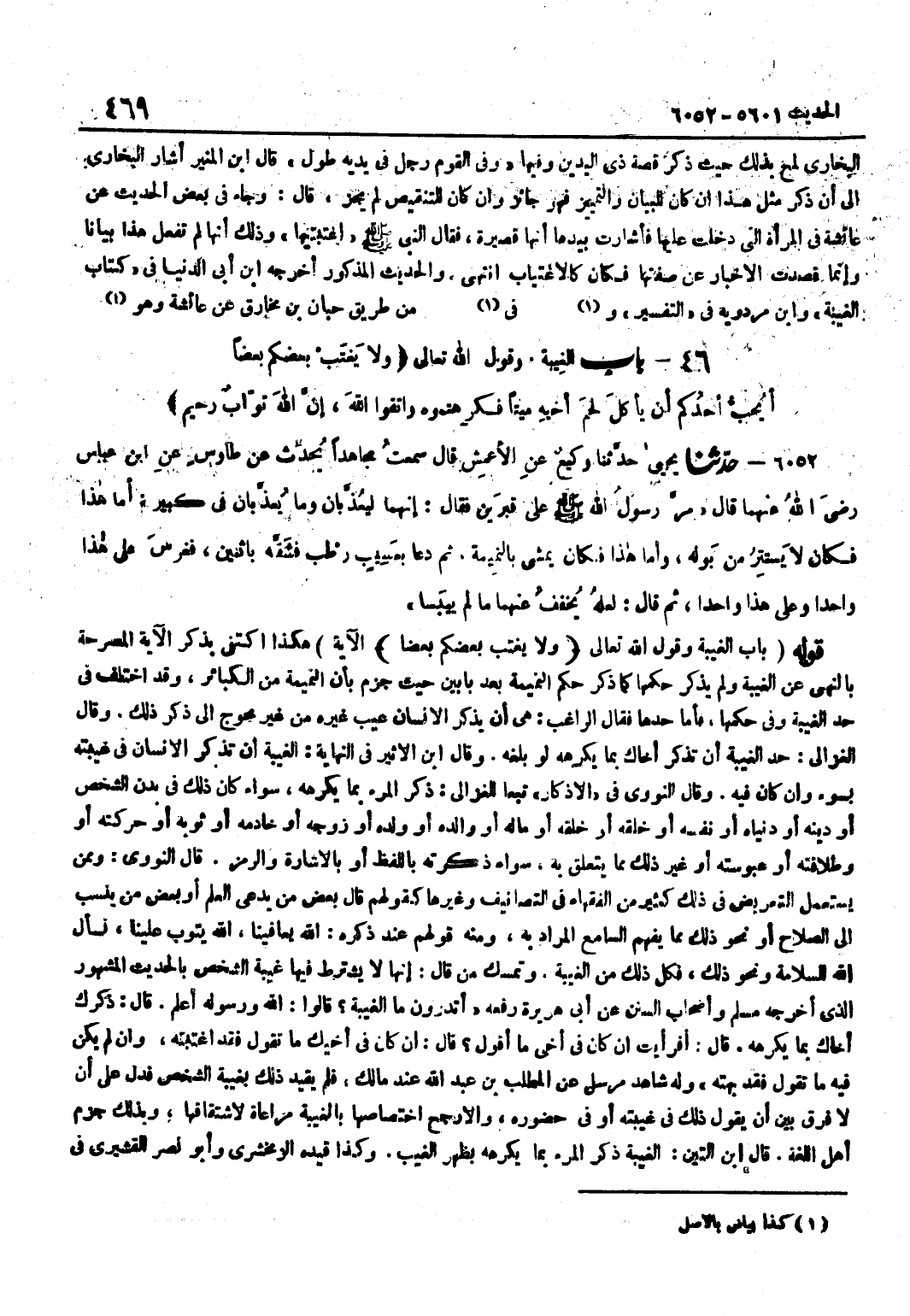 هَكَذَا اكْتَفَى بِذِكْرِ الْآيَةِ الْمُصَرِّحَةِ بِالنَّهْيِ عَنِ الْغِيبَةِ وَلَمْ يَذْكُرْ حُكْمَهَا كَمَا ذَكَرَ حُكْمَ النَّمِيمَةِ بَعْدَ بَابَيْنِ حَيْثُ جَزَمَ بِأَنَّ النَّمِيمَةَ مِنَ الْكَبَائِرِ وَقَدِ اخْتُلِفَ فِي حَدِّ الْغِيبَةِ وَفِي حُكْمِهَا فَأَمَّا حَدُّهَا فَقَالَ الرَّاغِبُ هِيَ أَنْ يَذْكُرَ الْإِنْسَانُ عَيْبَ غَيْرِهِ مِنْ غَيْرِ مُحْوِجٍ إِلَى ذِكْرِ ذَلِكَ وَقَالَ الْغَزَالِيُّ حَدُّ الْغِيبَةِ أَنْ تَذْكُرَ أَخَاكَ بِمَا يَكْرَهُهُ لَو بلغه وَقَالَ بن الْأَثِيرِ فِي النِّهَايَةِ الْغِيبَةُ أَنْ تَذْكُرَ الْإِنْسَانَ فِي غَيْبَتِهِ بِسُوءٍ وَإِنْ كَانَ فِيهِ وَقَالَ النَّوَوِيُّ فِي الْأَذْكَارِ تَبَعًا لِلْغَزَالِيِّ ذِكْرُ الْمَرْءِ بِمَا يَكْرَهُهُ سَوَاءٌ كَانَ ذَلِكَ فِي بَدَنِ الشَّخْصِ أَوْ دِينِهِ أَوْ دُنْيَاهُ أَوْ نَفْسِهِ أَوْ خَلْقِهِ أَوْ خُلُقِهِ أَوْ مَالِهِ أَوْ وَالِدِهِ أَوْ وَلَدِهِ أَوْ زَوْجِهِ أَوْ خَادِمِهِ أَو ثَوْبه أَو حركته أَو وطلاقته أَو عبوسته أَوْ غَيْرِ ذَلِكَ مِمَّا يَتَعَلَّقُ بِهِ سَوَاءٌ ذَكَرْتَهُ بِاللَّفْظِ أَوْ بِالْإِشَارَةِ وَالرَّمْزِ قَالَ النَّوَوِيُّ وَمِمَّنْ يَسْتَعْمِلُ التَّعْرِيضَ فِي ذَلِكَ كَثِيرٌ مِنَ الْفُقَهَاءِ فِي التَّصَانِيفِ وَغَيْرِهَا كَقَوْلِهِمْ قَالَ بَعْضُ مَنْ يَدَّعِي الْعِلْمَ أَوْ بَعْضُ مَنْ يُنْسَبُ إِلَى الصَّلَاحِ أَوْ نَحْوَ ذَلِكَ مِمَّا يَفْهَمُ السَّامِعُ الْمُرَادَ بِهِ وَمِنْهُ قَوْلُهُمْ عِنْدَ ذِكْرِهِ اللَّهُ يُعَافِينَا اللَّهُ يَتُوبُ عَلَيْنَا نَسْأَلُ اللَّهَ السَّلَامَةَ وَنَحْوَ ذَلِكَ فَكُلُّ ذَلِكَ مِنَ الْغِيبَةِ وَتَمَسَّكَ مَنْ قَالَ إِنَّهَا لَا يُشْتَرَطُ فِيهَا غِيبَةَ الشَّخْصِ بِالْحَدِيثِ الْمَشْهُورِ الَّذِي أَخْرَجَهُ مُسْلِمٌ وَأَصْحَابُ السُّنَنِ عَنْ أَبِي هُرَيْرَةَ رَفَعَهُ أَتَدْرُونَ مَا الْغِيبَةُ قَالُوا اللَّهُ وَرَسُولُهُ أَعْلَمُ قَالَ ذِكْرُكَ أَخَاكَ بِمَا يَكْرَهُهُ قَالَ أَفَرَأَيْتَ إِنْ كَانَ فِي أَخِي مَا أَقُولُ قَالَ إِنْ كَانَ فِي أَخِيكَ مَا تَقُولُ فَقَدِ اغْتَبْتَهُ وَإِنْ لَمْ يَكُنْ فِيهِ مَا تَقُولُ فَقَدْ بَهَتَّهُ وَلَهُ شَاهِدٌ مُرْسَلٌ عَنِ الْمُطَّلِبِ بْنِ عَبْدِ اللَّهِ عِنْدَ مَالِكٍ فَلَمْ يُقَيِّدْ ذَلِكَ بِغِيبَةِ الشَّخْصِ فَدَلَّ عَلَى أَنْ لَا فَرْقَ بَيْنَ أَنْ يَقُولَ ذَلِكَ فِي غِيبَتِهِ أَوْ فِي حُضُورِهِ وَالْأَرْجَحُ اخْتِصَاصُهَا بِالْغِيبَةِ مُرَاعَاةً لِاشْتِقَاقِهَا وَبِذَلِك جزم أهل اللُّغَة قَالَ بن التِّينِ الْغِيبَةُ ذِكْرُ الْمَرْءِ بِمَا يَكْرَهُهُ بِظَهْرِ الْغَيْبِ وَكَذَا قَيَّدَهُ الزَّمَخْشَرِيُّ وَأَبُو نَصْرٍ الْقُشَيْرِيُّ فِي