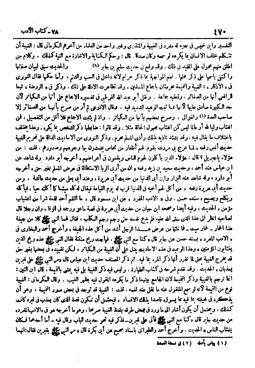 التَّفْسِير وبن خَمِيسٍ فِي جُزْءٍ لَهُ مُفْرَدٍ فِي الْغِيبَةِ وَالْمُنْذِرِيُّ وَغَيْرُ وَاحِدٍ مِنَ الْعُلَمَاءِ مِنْ آخِرِهِمُ الْكِرْمَانِيُّ قَالَ الْغِيبَةُ أَنْ تَتَكَلَّمَ خَلْفَ الْإِنْسَانِ بِمَا يَكْرَهُهُ لَوْ سَمِعَهُ وَكَانَ صِدْقًا قَالَ وَحُكْمُ الْكِنَايَةِ وَالْإِشَارَةِ مَعَ النِّيَّةِ كَذَلِكَ وَكَلَامُ مَنْ أَطْلَقَ مِنْهُمْ مَحْمُولٌ عَلَى الْمُقَيَّدِ فِي ذَلِكَ وَقَدْ وَقَعَ فِي حَدِيثِ سُلَيْمِ بْنِ جَابر وَالْحَدِيثُ سِيقَ لِبَيَانِ صِفَتِهَا وَاكْتُفِيَ بِاسْمِهَا عَلَى ذِكْرِ مَحِلِّهَا نَعَمِ الْمُوَاجَهَةُ بِمَا ذُكِرَ حَرَامٌ لِأَنَّهُ دَاخِلٌ فِي السَّبِّ وَالشَّتْمِ وَأَمَّا حُكْمُهَا فَقَالَ النَّوَوِيُّ فِي الْأَذْكَارِ الْغِيبَةُ وَالنَّمِيمَةُ مُحَرَّمَتَانِ بِإِجْمَاعِ الْمُسْلِمِينَ وَقَدْ تَظَاهَرَتِ الْأَدِلَّةُ عَلَى ذَلِكَ وَذَكَرَ فِي الرَّوْضَةِ تَبَعًا لِلرَّافِعِيِّ أَنَّهَا مِنَ الصَّغَائِرِ وَتَعَقَّبَهُ جَمَاعَةٌ وَنَقَلَ أَبُو عَبْدِ اللَّهِ الْقُرْطُبِيُّ فِي تَفْسِيرِهِ الْإِجْمَاعَ عَلَى أَنَّهَا مِنَ الْكَبَائِرِ لِأَنَّ حَدَّ الْكَبِيرَةِ صَادِقٌ عَلَيْهَا لِأَنَّهَا مِمَّا ثَبَتَ الْوَعِيدُ الشَّدِيدُ فِيهِ وَقَالَ الْأَذْرَعِيُّ لَمْ أَرَ مَنْ صَرَّحَ بِأَنَّهَا مِنَ الصَّغَائِرِ إِلَّا صَاحب الْعدة وَالْغَزَالِيَّ وَصَرَّحَ بَعْضُهُمْ بِأَنَّهَا مِنَ الْكَبَائِرِ وَإِذَا لَمْ يَثْبُتِ الْإِجْمَاعُ فَلَا أَقَلَّ مِنَ التَّفْصِيلِ فَمَنِ اغْتَابَ وَلِيًّا لِلَّهِ أَوْ عَالِمًا لَيْسَ كَمَنِ اغْتَابَ مَجْهُولَ الْحَالَةِ مَثَلًا وَقَدْ قَالُوا ضَابِطُهَا ذِكْرُ الشَّخْصِ بِمَا يَكْرَهُ وَهَذَا يَخْتَلِفُ بِاخْتِلَافِ مَا يُقَالُ فِيهِ وَقَدْ يَشْتَدُّ تَأَذِّيهِ بِذَلِكَ وَأَذَى الْمُسْلِمِ مُحَرَّمٌ وَذَكَرَ النَّوَوِيُّ مِنَ الْأَحَادِيثِ الدَّالَّةِ عَلَى تَحْرِيمِ الْغِيبَةِ حَدِيثَ أَنَسٍ رَفَعَهُ لَمَّا عُرِجَ بِي مَرَرْتُ بِقَوْمٍ لَهُمْ أَظْفَارٌ مِنْ نُحَاسٍ يَخْمُشُونَ بِهَا وُجُوهَهُمْ وَصُدُورَهُمْ قُلْتُ مَنْ هَؤُلَاءِ يَا جِبْرِيلُ قَالَ هَؤُلَاءِ الَّذِينَ يَأْكُلُونَ لُحُومَ النَّاسِ وَيَقَعُونَ فِي أَعْرَاضِهِمْ أخرجه أَبُو دَاوُد وَله شَاهد عَن بن عَبَّاسٍ عِنْدَ أَحْمَدَ وَحَدِيثُ سَعِيدِ بْنِ زَيْدٍ رَفَعَهُ إِنَّ مِنْ أَرْبَى الرِّبَا الِاسْتِطَالَةُ فِي عِرْضِ الْمُسْلِمِ بِغَيْرِ حَقٍّ أَخْرَجَهُ أَبُو دَاوُدَ وَله شَاهد عِنْد الْبَزَّار وبن أَبِي الدُّنْيَا مِنْ حَدِيثِ أَبِي هُرَيْرَةَ وَعِنْدَ أَبِي يَعْلَى مِنْ حَدِيثِ عَائِشَةَ وَمِنْ حَدِيثِ أَبِي هُرَيْرَةَ رَفَعَهُ مَنْ أَكَلَ لَحْمَ أَخِيهِ فِي الدُّنْيَا قُرِّبَ لَهُ يَوْمَ الْقِيَامَةِ فَيُقَالُ لَهُ كُلْهُ مَيِّتًا كَمَا أَكَلَتْهُ حَيًّا فَيَأْكُلُهُ وَيَكْلَحُ وَيَصِيحُ سَنَدُهُ حَسَنٌ وَفِي الْأَدَبِ الْمُفْرَدِ عَن بن مَسْعُودٍ قَالَ مَا الْتَقَمَ أَحَدٌ لُقْمَةً شَرًّا مِنَ اغْتِيَابِ مُؤْمِنٍ الْحَدِيثَ وَفِيهِ أَيْضًا وَصَحَّحَهُ بن حِبَّانَ مِنْ حَدِيثِ أَبِي هُرَيْرَةَ فِي قِصَّةِ مَاعِزٍ وَرَجْمِهِ فِي الزِّنَا وَإِنَّ رَجُلًا قَالَ لِصَاحِبِهِ انْظُرْ إِلَى هَذَا الَّذِي سَتَرَ اللَّهُ عَلَيْهِ فَلَمْ يَدَعْ نَفْسَهُ حَتَّى رُجِمَ رَجْمَ الْكَلْبِ فَقَالَ لَهُمَا النَّبِيُّ صَلَّى اللَّهُ عَلَيْهِ وَسَلَّمَ كُلَا مِنْ جِيفَةِ هَذَا الْحِمَارِ لِحِمَارٍ مَيِّتٍ فَمَا نِلْتُمَا مِنْ عِرْضِ هَذَا الرَّجُلِ أَشَدُّ مِنْ أَكْلِ هَذِهِ الْجِيفَةِ وَأَخْرَجَ أَحْمَدُ وَالْبُخَارِيُّ فِي الْأَدَبِ الْمُفْرَدِ بِسَنَدٍ حَسَنٍ عَنْ جَابِرٍ قَالَ كُنَّا مَعَ النَّبِيِّ صَلَّى اللَّهُ عَلَيْه