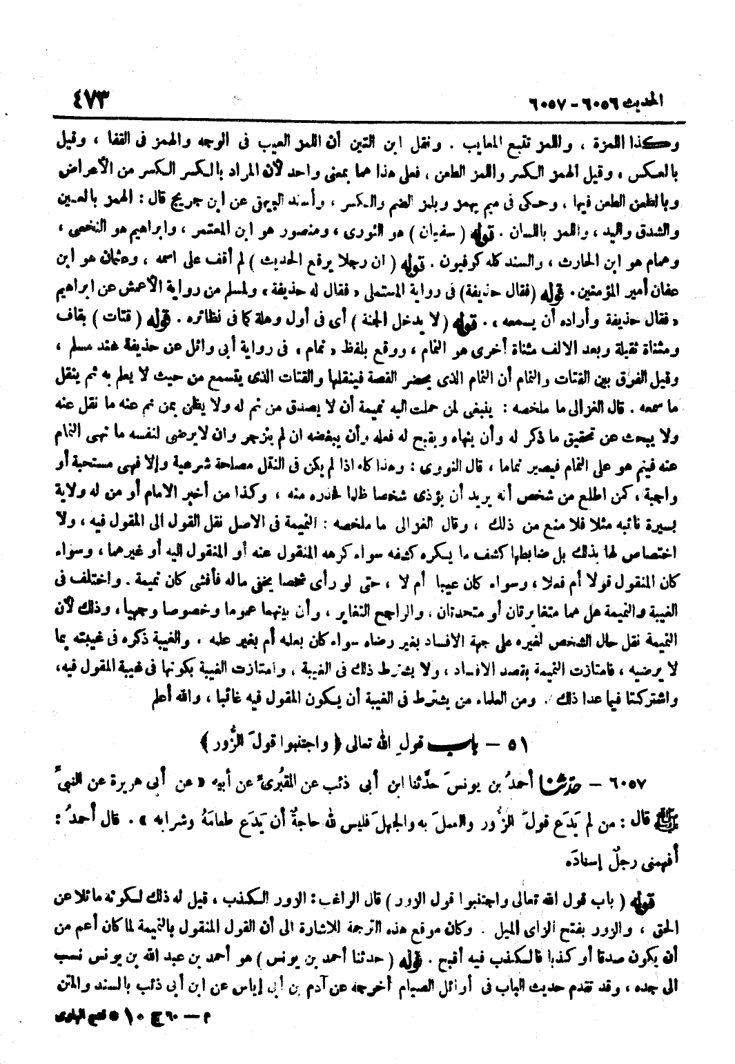 [6056] قَوْلُهُ سُفْيَانُ هُوَ الثَّوْرِيُّ وَمَنْصُورٌ هُوَ بن الْمُعْتَمِر وَإِبْرَاهِيم هُوَ النَّخعِيّ وَهَمَّام هُوَ بن الْحَارِثِ وَالسَّنَدُ كُلُّهُ كُوفِيُّونَ قَوْلُهُ إِنَّ رَجُلًا يَرْفَعُ الْحَدِيثَ لَمْ أَقِفْ عَلَى اسْمِهِ وَعُثْمَانُ هُوَ بن عَفَّانَ أَمِيرُ الْمُؤْمِنِينَ قَوْلُهُ فَقَالَ حُذَيْفَةُ فِي رِوَايَةِ الْمُسْتَمْلِي فَقَالَ لَهُ حُذَيْفَةُ وَلِمُسْلِمٍ مِنْ رِوَايَةِ الْأَعْمَشِ عَنْ إِبْرَاهِيمَ فَقَالَ حُذَيْفَةُ وَأَرَادَهُ أَنْ يَسْمَعَهُ قَوْلُهُ لَا يَدْخُلُ الْجَنَّةَ أَيْ فِي أَوَّلِ وَهْلَةٍ كَمَا فِي نَظَائِرِهِ قَوْلُهُ قَتَّاتٌ بِقَافٍ وَمُثَنَّاةٍ ثَقِيلَةٍ وَبَعْدَ الْأَلِفِ مُثَنَّاةٌ أُخْرَى هُوَ النَّمَّامُ وَوَقَعَ بِلَفْظِ نَمَّامٍ فِي رِوَايَةِ أَبِي وَائِلٍ عَنْ حُذَيْفَةَ عِنْدَ مُسْلِمٍ وَقِيلَ الْفَرْقُ بَيْنَ الْقَتَّاتِ وَالنَّمَّامِ أَنَّ النَّمَّامَ الَّذِي يحضر الْقِصَّة فَيَنْقُلُهَا وَالْقَتَّاتُ الَّذِي يَتَسَمَّعُ مِنْ حَيْثُ لَا يُعْلَمُ بِهِ ثُمَّ يَنْقُلُ مَا سَمِعَهُ قَالَ الْغَزَالِيُّ مَا مُلَخَّصُهُ يَنْبَغِي لِمَنْ حُمِلَتْ إِلَيْهِ نَمِيمَةٌ أَنْ لَا يُصَدِّقَ مَنْ نَمَّ لَهُ وَلَا يَظُنُّ بِمَنْ نُمَّ عَنْهُ مَا نُقِلَ عَنْهُ وَلَا يَبْحَثُ عَنْ تَحْقِيقِ مَا ذُكِرَ لَهُ وَأَنْ يَنْهَاهُ وَيُقَبِّحَ لَهُ فِعْلَهُ وَأَنْ يَبْغُضَهُ إِنْ لَمْ يَنْزَجِرْ وَأَنْ لَا يَرْضَى لِنَفْسِهِ مَا نُهِيَ النَّمَّامُ عَنْهُ فَيَنِمَّ هُوَ عَلَى النَّمَّامِ فَيَصِيرَ نَمَّامًا قَالَ النَّوَوِيُّ وَهَذَا كُلُّهُ إِذَا لَمْ يَكُنْ فِي النَّقْلِ مَصْلَحَةٌ شَرْعِيَّةٌ وَإِلَّا فَهِيَ مُسْتَحَبَّةٌ أَوْ وَاجِبَةٌ كَمَنِ اطَّلَعَ مِنْ شَخْصٍ أَنَّهُ يُرِيدُ أَنْ يُؤْذِي شَخْصًا ظُلْمًا فَحَذَّرَهُ مِنْهُ وَكَذَا مَنْ أَخْبَرَ الْإِمَامَ أَوْ مَنْ لَهُ وِلَايَةٌ بِسِيرَةِ نَائِبِهِ مَثَلًا فَلَا مَنْعَ مِنْ ذَلِكَ وَقَالَ الْغَزَالِيُّ مَا مُلَخَّصُهُ النَّمِيمَةُ فِي الْأَصْلِ نَقْلُ الْقَوْلِ إِلَى الْمَقُولِ فِيهِ وَلَا اخْتِصَاصَ لَهَا بِذَلِكَ بَلْ ضَابِطُهَا كَشْفُ مَا يُكْرَهُ كَشْفُهُ سَوَاءٌ كَرِهَهُ الْمَنْقُولُ عَنْهُ أَوِ الْمَنْقُولُ إِلَيْهِ أَوْ غَيْرُهُمَا وَسَوَاءٌ كَانَ الْمَنْقُولُ قَوْلًا أَمْ فِعْلًا وَسَوَاءٌ كَانَ عَيْبًا أَمْ لَا حَتَّى لَوْ رَأَى شَخْصًا يُخْفِي مَا لَهُ فَأَفْشَى كَانَ نَمِيمَةً وَاخْتُلِفَ فِي الْغِيبَةِ وَالنَّمِيمَةِ هَلْ هُمَا مُتَغَايِرَتَانِ أَوْ مُتَّحِدَتَانِ وَالرَّاجِحُ التَّغَايُرُ وَأَنَّ بَيْنَهُمَا عُمُومًا وَخُصُوصًا وَجْهِيًّا وَذَلِكَ لِأَنَّ النَّمِيمَةَ نَقْلُ حَالِ الشَّخْصِ لِغَيْرِهِ عَلَى جِهَةِ الْإِفْسَادِ بِغَيْرِ رِضَاهُ سَوَاءٌ كَانَ بِعِلْمِهِ أَمْ بِغَيْرِ عِلْمِهِ وَالْغِيبَةُ ذِكْرُهُ فِي غِيبَتِهِ بِمَا لَا يُرْضِيهِ فَامْتَازَتِ النَّمِيمَةُ بِقَصْدِ الْإِفْسَادِ وَلَا يُشْتَرَطُ ذَلِكَ فِي الْغِيبَةِ وَامْتَازَتِ الْغِيبَةُ بِكَوْنِهَا فِي غِيبَةِ الْمَقُولِ فِيهِ وَاشْتَرَكَتَا فِيمَا عَدَا ذَلِكَ وَمَنِ الْعُلَمَاءِ مَنْ يَشْتَرِطُ فِي الْغِيبَةِ أَنْ يَكُونَ الْمَقُول فِيهِ غَائِبا وَاللَّهُ أَعْلَمُ