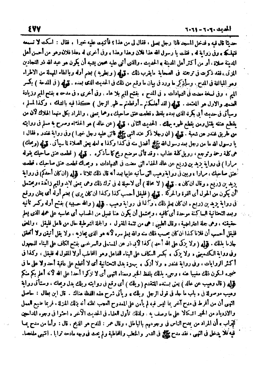 حَدِيثًا قَالَ فِيهِ فَدَخَلَ الْمَسْجِدَ فَإِذَا رَجُلٌ يُصَلِّي فَقَالَ لِي مَنْ هَذَا فَأَثْنَيْتُ عَلَيْهِ خَيْرًا فَقَالَ اسْكُتْ لَا تُسْمِعْهُ فَتُهْلِكْهُ وَفِي رِوَايَةٍ لَهُ فَقُلْتُ يَا رَسُولَ اللَّهِ هَذَا فُلَانٌ وَهَذَا وَهَذَا وَفِي أُخْرَى لَهُ هَذَا فُلَانٌ وَهُوَ مِنْ أَحْسَنِ أَهْلِ الْمَدِينَةِ صَلَاةً أَوْ مِنْ أَكْثَرِ أَهْلِ الْمَدِينَةِ الْحَدِيثَ وَالَّذِي أَثْنَى عَلَيْهِ مِحْجَنُ يُشْبِهُ أَنْ يَكُونَ هُوَ عَبْدُ اللَّهِ ذُو النِّجَادَيْنِ الْمُزَنِيُّ فَقَدْ ذَكَرْتُ فِي تَرْجَمَتِهِ فِي الصَّحَابَةِ مَا يُقَرِّبُ ذَلِكَ قَوْلُهُ وَيُطْرِيهِ بِضَمِّ أَوَّلِهِ وَبِالطَّاءِ الْمُهْمَلَةِ مِنَ الْإِطْرَاءِ وَهُوَ الْمُبَالَغَةُ فِي الْمَدْحِ وَسَأَذْكُرُ مَا وَرَدَ فِي بَيَانِ مَا وَقَعَ مِنْ ذَلِكَ فِي الْحَدِيثِ الَّذِي بَعْدَهُ قَوْلُهُ فِي الْمِدْحَةِ بِكَسْرِ الْمِيمِ وَفِي نُسْخَةٍ مَضَتْ فِي الشَّهَادَاتِ فِي الْمَدْحِ بِفَتْحِ الْمِيمِ بِلَا هَاءٍ وَفِي أُخْرَى فِي مَدْحِهِ بِفَتْحِ الْمِيمِ وَزِيَادَةِ الضَّمِيرِ وَالْأَوَّلُ هُوَ الْمُعْتَمَدُ قَوْلُهُ لَقَدْ أَهْلَكْتُمْ أَوْ قَطَعْتُمْ ظَهْرَ الرَّجُلِ كَذَا فِيهِ بِالشَّكِّ وَكَذَا لِمُسْلِمٍ وَسَيَأْتِي فِي حَدِيثِ أَبِي بَكْرَةَ الَّذِي بَعْدَهُ بِلَفْظِ قَطَعْتَ عُنُقَ صَاحِبِكَ وَهُمَا بِمَعْنًى وَالْمُرَادُ بِكُلٍّ مِنْهُمَا الْهَلَاكُ لِأَنَّ مَنْ يُقْطَعُ عُنُقه يقتل وَمن يقطع ظَهره يهْلك الحَدِيث الثَّانِي