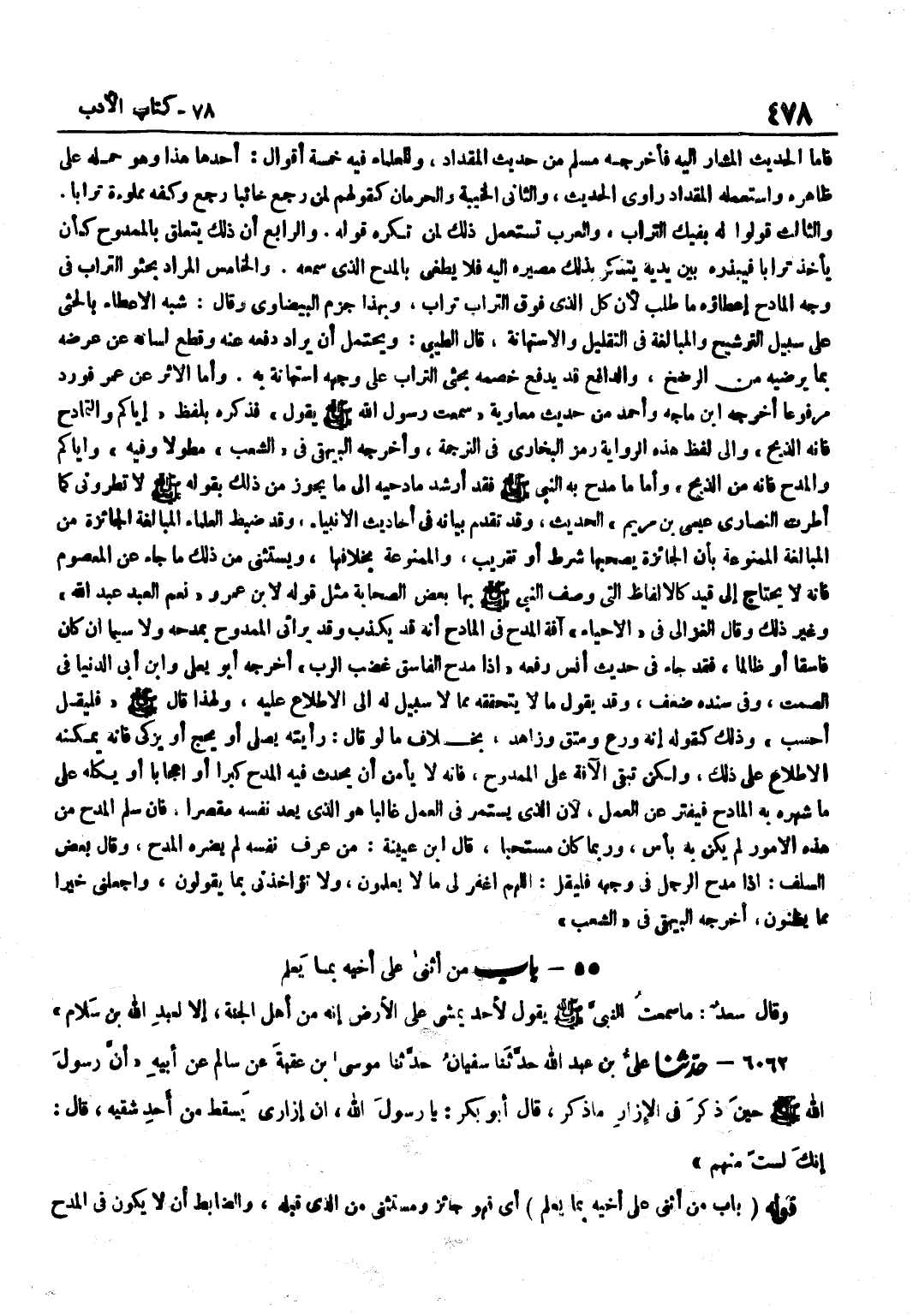 فَأَمَّا الْحَدِيثُ الْمُشَارُ إِلَيْهِ فَأَخْرَجَهُ مُسْلِمٌ مِنْ حَدِيثِ الْمِقْدَادِ وَلِلْعُلَمَاءِ فِيهِ خَمْسَةُ أَقْوَالٍ أَحَدُهَا هَذَا وَهُوَ حَمْلُهُ عَلَى ظَاهِرِهِ وَاسْتَعْمَلَهُ الْمِقْدَادُ رَاوِي الْحَدِيثِ وَالثَّانِي الْخَيْبَةُ وَالْحِرْمَانُ كَقَوْلِهِمْ لِمَنْ رَجَعَ خَائِبًا رَجَعَ وَكَفُّهُ مَمْلُوءَةٌ تُرَابًا وَالثَّالِثُ قُولُوا لَهُ بِفِيكَ التُّرَابُ وَالْعَرَبُ تَسْتَعْمِلُ ذَلِكَ لِمَنْ تَكْرَهُ قَوْلَهُ وَالرَّابِعُ أَنَّ ذَلِكَ يَتَعَلَّقُ بِالْمَمْدُوحِ كَأَنْ يَأْخُذَ تُرَابًا فَيَبْذُرَهُ بَيْنَ يَدَيْهِ يَتَذَكَّرُ بِذَلِكَ مَصِيرَهُ إِلَيْهِ فَلَا يَطْغَى بِالْمَدْحِ الَّذِي سَمِعَهُ وَالْخَامِسُ الْمُرَادُ بِحَثْوِ التُّرَابِ فِي وَجْهِ الْمَادِحِ إِعْطَاؤُهُ مَا طُلِبَ لِأَنَّ كُلَّ الَّذِي فَوْقَ التُّرَابِ تُرَابٌ وَبِهَذَا جَزَمَ الْبَيْضَاوِيُّ وَقَالَ شَبَّهَ الْإِعْطَاءَ بِالْحَثْيِ عَلَى سَبِيلِ التَّرْشِيحِ وَالْمُبَالَغَةِ فِي التَّقْلِيلِ وَالِاسْتِهَانَةِ قَالَ الطِّيبِيُّ وَيَحْتَمِلُ أَنْ يُرَادَ دَفْعُهُ عَنْهُ وَقَطْعُ لِسَانِهِ عَنْ عِرْضِهِ بِمَا يُرْضِيهِ مِنَ الرَّضْخِ وَالدَّافِعُ قَدْ يَدْفَعُ خَصْمَهُ بِحَثْيِ التُّرَابِ عَلَى وَجْهِهِ اسْتِهَانَةً بِهِ وَأَمَّا الْأَثَرُ عَنْ عُمَرَ فَوَرَدَ مَرْفُوعًا أخرجه بن مَاجَهْ وَأَحْمَدُ مِنْ حَدِيثِ مُعَاوِيَةَ سَمِعْتُ رَسُولَ اللَّهِ صَلَّى اللَّهُ عَلَيْهِ وَسَلَّمَ يَقُولُ فَذَكَرَهُ بِلَفْظِ إِيَّاكُمْ وَالتَّمَادُحُ فَإِنَّهُ الذَّبْحُ وَإِلَى لَفْظِ هَذِهِ الرِّوَايَةِ رَمَزَ الْبُخَارِيُّ فِي التَّرْجَمَةِ وَأَخْرَجَهُ الْبَيْهَقِيُّ فِي الشُّعَبِ مُطَوَّلًا وَفِيهِ وَإِيَّاكُمْ وَالْمَدْحَ فَإِنَّهُ مِنَ الذَّبْحِ وَأَمَّا مَا مُدِحَ بِهِ النَّبِيُّ صَلَّى اللَّهُ عَلَيْهِ وَسَلَّمَ فَقَدْ أَرْشَدَ مَادِحِيهِ إِلَى مَا يَجُوزُ مِنْ ذَلِكَ بِقَوْلِهِ صَلَّى اللَّهُ عَلَيْهِ وَسَلَّمَ لَا تُطْرُونِي كَمَا أطرت النَّصَارَى عِيسَى بن مَرْيَمَ الْحَدِيثَ وَقَدْ تَقَدَّمَ بَيَانُهُ فِي أَحَادِيثِ الْأَنْبِيَاءِ وَقَدْ ضَبَطَ الْعُلَمَاءُ الْمُبَالَغَةَ الْجَائِزَةَ مِنَ الْمُبَالَغَةِ الْمَمْنُوعَةِ بِأَنَّ الْجَائِزَةَ يَصْحَبُهَا شَرْطٌ أَوْ تَقْرِيبٌ وَالْمَمْنُوعَةُ بِخِلَافِهَا وَيُسْتَثْنَى مِنْ ذَلِكَ مَا جَاءَ عَنِ الْمَعْصُومِ فَإِنَّهُ لَا يَحْتَاجُ إِلَى قَيْدٍ كَالْأَلْفَاظِ الَّتِي وَصَفَ النَّبِيُّ صَلَّى اللَّهُ عَلَيْهِ وَسَلَّمَ بِهَا بَعْضَ الصَّحَابَةِ مِثْلَ قَوْلِهِ لِابْنِ عَمْرٍو نِعْمَ الْعَبْدُ عَبْدُ اللَّهِ وَغَيْرُ ذَلِكَ وَقَالَ الْغَزَالِيُّ فِي الْإِحْيَاءِ آفَةُ الْمَدْحِ فِي الْمَادِحِ أَنَّهُ قَدْ يَكْذِبُ وَقَدْ يُرَائِي الْمَمْدُوحَ بِمَدْحِهِ وَلَا سِيَّمَا إِنْ كَانَ فَاسِقًا أَوْ ظَالِمًا فَقَدْ جَاءَ فِي حَدِيثِ أَنَسٍ رَفَعَهُ إِذَا مُدِحَ الْفَاسِقُ غَضِبَ الرَّبُّ أَخْرَجَهُ أَبُو يعلى وبن أَبِي الدُّنْيَا فِي الصَّمْتِ وَفِي سَنَدِهِ ضَعْفٌ وَقَدْ يَقُولُ مَا لَا يَتَحَقَّقُهُ مِمَّا لَا سَبِيلَ لَهُ إِلَى الِاطِّلَاعِ عَلَيْهِ وَلِهَذَا قَالَ صَلَّى اللَّهُ عَلَيْهِ وَسَلَّمَ فَلْيَقُلْ أَحْسِبُ وَذَلِكَ كَقَوْلِهِ إِنَّهُ وَرِعٌ وَمُتَّقٍ وَزَاهِدٌ بِخِلَافِ مَا لَوْ قَالَ رَأَيْتُهُ يُصَلِّي أَوْ يَحُجَّ أَوْ يُزَكِّي فَإِنَّهُ يُمْكِنُهُ الِاطِّلَاعُ عَلَى ذَلِكَ وَلَكِنْ تَبْقَى الْآفَةُ عَلَى الْمَمْدُوحِ فَإِنَّهُ لَا يَأْمَنُ أَنْ يُحْدِثَ فِيهِ الْمَدْحُ كِبْرًا أَوْ إِعْجَابًا أَوْ يَكِلُهُ عَلَى مَا شَهَرَهُ بِهِ الْمَادِحُ فَيَفْتُرُ عَنِ الْعَمَلِ لِأَنَّ الَّ