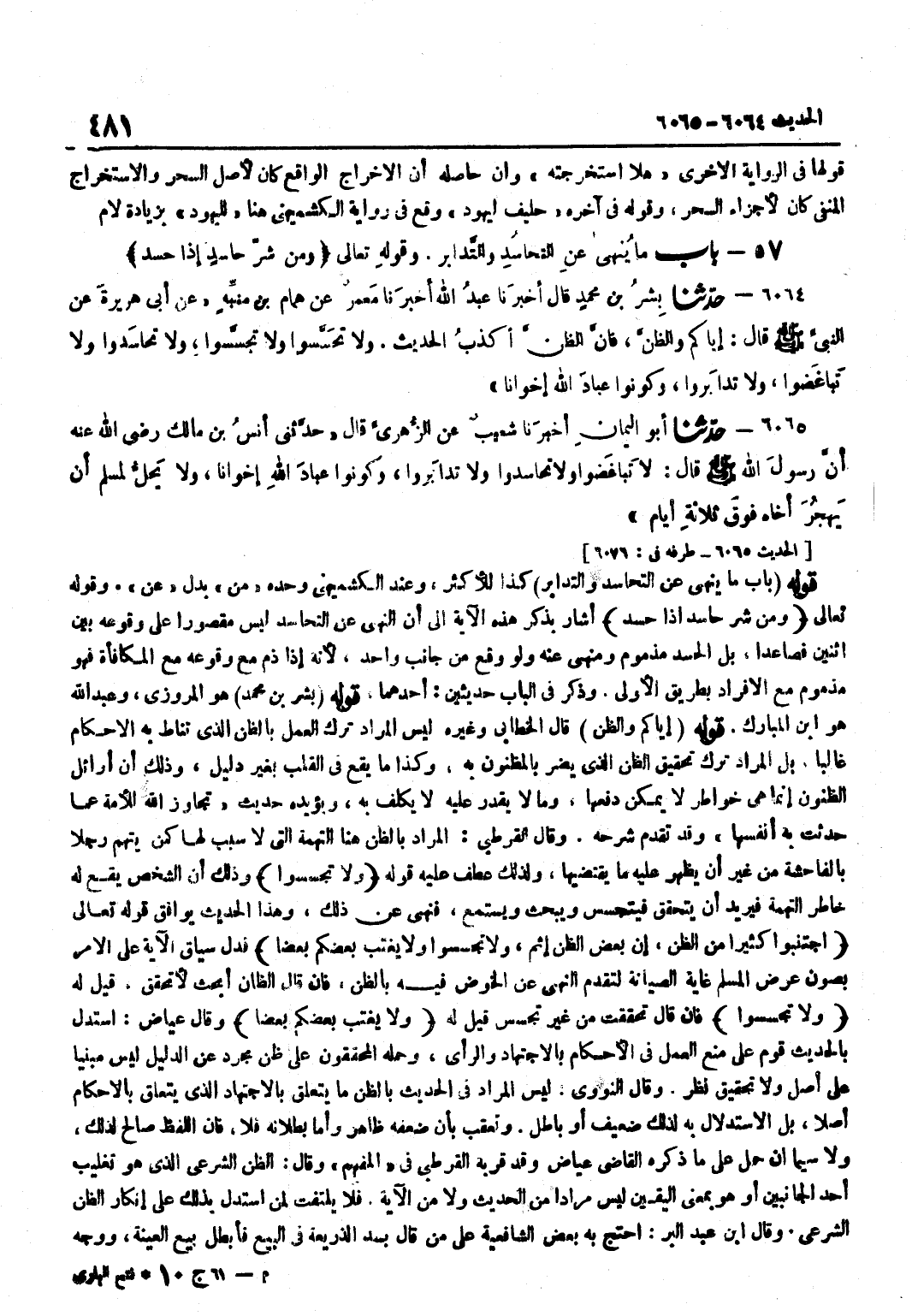 [6064] قَوْلُهُ بِشْرُ بْنُ مُحَمَّدٍ هُوَ الْمَرْوَزِيُّ وَعَبْدُ اللَّهِ هُوَ بن الْمُبَارَكِ قَوْلُهُ إِيَّاكُمْ وَالظَّنَّ قَالَ الْخَطَّابِيُّ وَغَيْرُهُ لَيْسَ الْمُرَادُ تَرْكَ الْعَمَلِ بِالظَّنِّ الَّذِي تُنَاطُ بِهِ الْأَحْكَامُ غَالِبًا بَلِ الْمُرَادُ تَرْكَ تَحْقِيقِ الظَّنِّ الَّذِي يَضُرُّ بِالْمَظْنُونِ بِهِ وَكَذَا مَا يَقَعُ فِي الْقَلْبِ بِغَيْرِ دَلِيلٍ وَذَلِكَ أَنَّ أَوَائِلَ الظُّنُونِ إِنَّمَا هِيَ خَوَاطِرُ لَا يُمْكِنُ دَفْعُهَا وَمَا لَا يُقْدَرُ عَلَيْهِ لَا يُكَلَّفُ بِهِ وَيُؤَيِّدُهُ حَدِيثُ تَجَاوَزَ اللَّهُ لِلْأُمَّةِ عَمَّا حَدَّثَتْ بِهِ أَنْفُسَهَا وَقَدْ تَقَدَّمَ شَرْحُهُ وَقَالَ الْقُرْطُبِيُّ الْمُرَادُ بِالظَّنِّ هُنَا التُّهْمَةُ الَّتِي لَا سَبَبَ لَهَا كَمَنْ يَتَّهِمُ رَجُلًا بِالْفَاحِشَةِ مِنْ غَيْرِ أَنْ يَظْهَرَ عَلَيْهِ مَا يَقْتَضِيهَا وَلِذَلِكَ عَطَفَ عَلَيْهِ قَوْلَهُ وَلَا تَجَسَّسُوا وَذَلِكَ أَنَّ الشَّخْصَ يَقَعُ لَهُ خَاطِرُ التُّهْمَةِ فَيُرِيدُ أَنْ يَتَحَقَّقَ فَيَتَجَسَّسُ وَيَبْحَثُ وَيَسْتَمِعُ فَنَهَى عَنْ ذَلِكَ وَهَذَا الْحَدِيثُ يُوَافِقُ قَوْلَهُ تَعَالَى اجْتَنِبُوا كَثِيرًا من الظَّن إِن بعض الظَّن إِثْم وَلَا تجسسوا وَلَا يغتب بَعْضكُم بَعْضًا فَدَلَّ سِيَاقُ الْآيَةِ عَلَى الْأَمْرِ بِصَوْنِ عِرْضِ الْمُسْلِمِ غَايَةَ الصِّيَانَةِ لِتَقَدُّمِ النَّهْيِ عَنِ الْخَوْضِ فِيهِ بِالظَّنِّ فَإِنْ قَالَ الظَّانُّ أَبْحَثُ لِأَتَحَقَّقَ قيل لَهُ وَلَا تجسسوا فَإِنْ قَالَ تَحَقَّقْتُ مِنْ غَيْرِ تَجَسُّسٍ قِيلَ لَهُ وَلَا يغتب بَعْضكُم بَعْضًا وَقَالَ عِيَاضٌ اسْتَدَلَّ بِالْحَدِيثِ قَوْمٌ عَلَى مَنْعِ الْعَمَلِ فِي الْأَحْكَامِ بِالِاجْتِهَادِ وَالرَّأْيِ وَحَمَلَهُ الْمُحَقِّقُونَ عَلَى ظَنٍّ مُجَرَّدٍ عَنِ الدَّلِيلِ لَيْسَ مَبْنِيًّا عَلَى أَصْلٍ وَلَا تَحْقِيقِ نَظَرٍ وَقَالَ النَّوَوِيُّ لَيْسَ الْمُرَادُ فِي الْحَدِيثِ بِالظَّنِّ مَا يَتَعَلَّقُ بِالِاجْتِهَادِ الَّذِي يَتَعَلَّقُ بِالْأَحْكَامِ أَصْلًا بَلِ الِاسْتِدْلَالُ بِهِ لِذَلِكَ ضَعِيفٌ أَوْ بَاطِلٌ وَتُعُقِّبَ بِأَنَّ ضَعْفَهُ ظَاهِرٌ وَأَمَّا بُطْلَانُهُ فَلَا فَإِنَّ اللَّفْظَ صَالِحٌ لِذَلِكَ وَلَا سِيَّمَا إِنْ حُمِلَ عَلَى مَا ذكره القَاضِي عِيَاض وَقد قربه الْقُرْطُبِيّ فِي الْمُفْهِمِ وَقَالَ الظَّنُّ الشَّرْعِيُّ الَّذِي هُوَ تَغْلِيبُ أَحَدِ الْجَانِبَيْنِ أَوْ هُوَ بِمَعْنَى الْيَقِينِ لَيْسَ مُرَادًا مِنَ الْحَدِيثِ وَلَا مِنَ الْآيَةِ فَلَا يُلْتَفَتُ لِمَنِ اسْتَدَلَّ بِذَلِكَ عَلَى إِنْكَارِ الظَّن الشَّرْعِيّ وَقَالَ بن عَبْدِ الْبَرِّ احْتَجَّ بِهِ بَعْضُ الشَّافِعِيَّةِ عَلَى مَنْ قَالَ بِسَدِّ الذَّرِيعَةِ فِي الْبَيْعِ فَأَبْطَلَ بَيْعَ الْعِينَةِ وَوَجْهُ