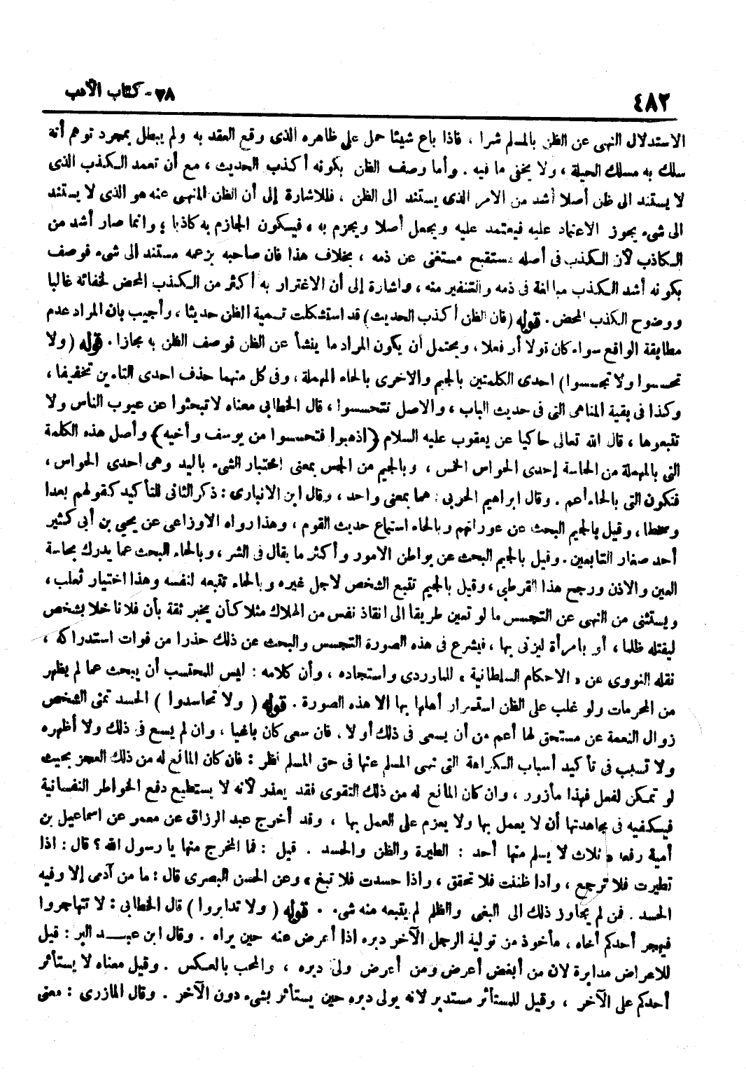 الِاسْتِدْلَالِ النَّهْيُ عَنِ الظَّنِّ بِالْمُسْلِمِ شَرًّا فَإِذَا بَاعَ شَيْئًا حُمِلَ عَلَى ظَاهِرِهِ الَّذِي وَقَعَ الْعَقْدُ بِهِ وَلَمْ يَبْطُلْ بِمُجَرَّدِ تَوَهُّمِ أَنَّهُ سَلَكَ بِهِ مَسْلَكَ الْحِيلَةِ وَلَا يَخْفَى مَا فِيهِ وَأَمَّا وَصْفُ الظَّنِّ بِكَوْنِهِ أَكْذَبُ الْحَدِيثِ مَعَ أَنَّ تَعَمُّدَ الْكَذِبِ الَّذِي لَا يَسْتَنِدُ إِلَى ظَنٍّ أَصْلًا أَشَدُّ مِنَ الْأَمْرِ الَّذِي يَسْتَنِدُ إِلَى الظَّنِّ فَلِلْإِشَارَةِ إِلَى أَنَّ الظَّنَّ الْمَنْهِيَّ عَنْهُ هُوَ الَّذِي لَا يَسْتَنِدُ إِلَى شَيْءٍ يَجُوزُ الِاعْتِمَادُ عَلَيْهِ فَيُعْتَمَدُ عَلَيْهِ وَيُجْعَلُ أَصْلًا وَيُجْزَمُ بِهِ فَيَكُونُ الْجَازِمُ بِهِ كَاذِبًا وَإِنَّمَا صَارَ أَشَدَّ مِنَ الْكَاذِبِ لِأَنَّ الْكَذِبَ فِي أَصْلِهِ مُسْتَقْبَحٌ مُسْتَغْنًى عَنْ ذَمِّهِ بِخِلَافِ هَذَا فَإِنَّ صَاحِبَهُ بِزَعْمِهِ مُسْتَنِدٌ إِلَى شَيْءٍ فَوُصِفَ بِكَوْنِهِ أَشَدَّ الْكَذِبِ مُبَالَغَةً فِي ذَمِّهِ وَالتَّنْفِيرِ مِنْهُ وَإِشَارَةً إِلَى أَنَّ الِاغْتِرَارَ بِهِ أَكْثَرُ مِنَ الْكَذِبِ الْمَحْضِ لِخَفَائِهِ غَالِبًا وَوُضُوحِ الْكَذِبِ الْمَحْضِ قَوْلُهُ فَإِنَّ الظَّنَّ أَكْذَبُ الْحَدِيثِ قد استشكلت تَسْمِيَةُ الظَّنِّ حَدِيثًا وَأُجِيبُ بِأَنَّ الْمُرَادَ عَدَمُ مُطَابَقَةِ الْوَاقِعِ سَوَاءٌ كَانَ قَوْلًا أَوْ فِعْلًا وَيَحْتَمِلُ أَنْ يَكُونَ الْمُرَادُ مَا يَنْشَأُ عَنِ الظَّنِّ فَوُصِفَ الظَّنُّ بِهِ مَجَازًا قَوْلُهُ وَلَا تَحَسَّسُوا وَلَا تَجَسَّسُوا إِحْدَى الْكَلِمَتَيْنِ بِالْجِيمِ وَالْأُخْرَى بِالْحَاءِ الْمُهْمَلَةِ وَفِي كُلٍّ مِنْهُمَا حَذْفُ إِحْدَى التَّاءَيْنِ تَخْفِيفًا وَكَذَا فِي بَقِيَّةِ الْمَنَاهِي الَّتِي فِي حَدِيثِ الْبَابِ وَالْأَصْلُ تَتَحَسَّسُوا قَالَ الْخَطَّابِيُّ مَعْنَاهُ لَا تَبْحَثُوا عَنْ عُيُوبِ النَّاسِ وَلَا تَتَّبِعُوهَا قَالَ اللَّهُ تَعَالَى حَاكِيًا عَنْ يَعْقُوبَ عَلَيْهِ السَّلَامُ اذْهَبُوا فَتَحَسَّسُوا مِنْ يُوسُفَ وَأَخِيهِ وَأَصْلُ هَذِهِ الْكَلِمَةِ الَّتِي بِالْمُهْمَلَةِ مِنَ الْحَاسَّةِ إِحْدَى الْحَوَاسِّ الْخَمْسِ وَبِالْجِيمِ مِنَ الْجَسِّ بِمَعْنَى اخْتِبَارِ الشَّيْءِ بِالْيَدِ وَهِيَ إِحْدَى الْحَوَاسِّ فَتَكُونُ الَّتِي بِالْحَاءِ أَعَمَّ وَقَالَ إِبْرَاهِيمُ الْحَرْبِيُّ هُمَا بِمَعْنى وَاحِد وَقَالَ بن الْأَنْبَارِيِّ ذَكَرَ الثَّانِي لِلتَّأْكِيدِ كَقَوْلِهِمْ بُعْدًا وَسُخْطًا وَقِيلَ بِالْجِيمِ الْبَحْثُ عَنْ عَوْرَاتِهِمْ وَبِالْحَاءِ اسْتِمَاعُ حَدِيثِ الْقَوْمِ وَهَذَا رَوَاهُ الْأَوْزَاعِيُّ عَنْ يَحْيَى بْنِ أَبِي كَثِيرٍ أَحَدِ صِغَارِ التَّابِعِينَ وَقِيلَ بِالْجِيمِ الْبَحْثُ عَنْ بَوَاطِنِ الْأُمُورِ وَأَكْثَرُ مَا يُقَالُ فِي الشَّرِّ وَبِالْحَاءِ الْبَحْثُ عَمَّا يُدْرَكُ بِحَاسَّةِ الْعَيْنِ وَالْأُذُنِ وَرَجَّحَ هَذَا الْقُرْطُبِيُّ وَقِيلَ بِالْجِيمِ تَتَبُّعُ الشَّخْصِ لِأَجَلِ غَيْرِهِ وَبِالْحَاءِ تَتَبُّعُهُ لِنَفْسِهِ وَهَذَا اخْتِيَارُ ثَعْلَبٍ وَيُسْتَثْنَى مِنَ النَّهْيِ عَنِ التَّجَسُّسِ مَا لَوْ تَعَيَّنَ طَرِيقًا إِلَى إِنْقَاذِ نَفْسٍ مِنَ الْهَلَاكِ مَثَلًا كَأَنْ يُخْبِرَ ثِقَةً بِأَنَّ فُلَانًا خَلَا بِشَخْصٍ لِيَقْتُلَهُ ظُلْمًا أَوْ بِامْرَأَةٍ لِيَزْنِيَ بِهَا فَيُشْرَعُ فِي هَذِهِ الصُّورَةِ التَّجَسُّسُ وَالْبَحْثُ عَنْ ذَلِكَ حَذَرًا مِنْ فَوَاتِ اسْتِدْرَاكِهِ نَقَلَهُ النَّوَوِيُّ عَنْ الْأَحْكَامِ السُّلْطَانِيَّةِ لِلْمَاوَرْدِيِّ وَاسْتَجَادَهُ وَأَنَّ كَلَامَهُ لَيْسَ لِلْمُحْتَسِبِ أَنْ يَبْحَثَ عَمَّا لَمْ يَظْهَرْ مِنَ الْمُحَرَّمَ